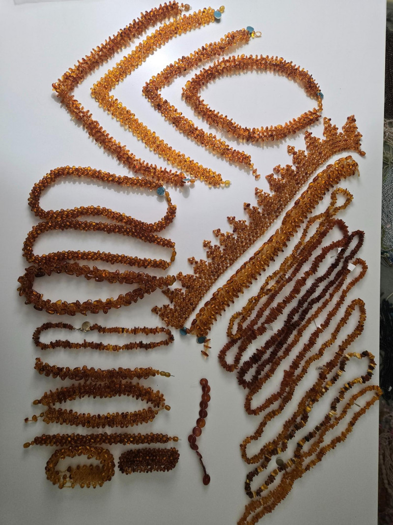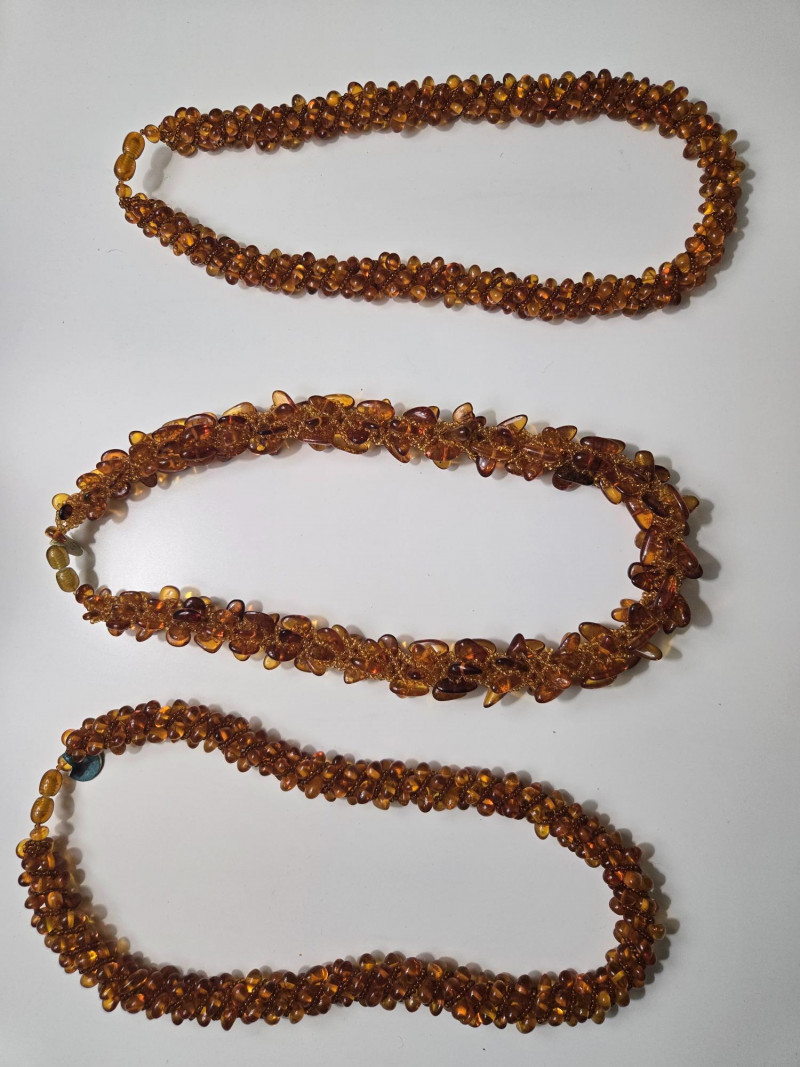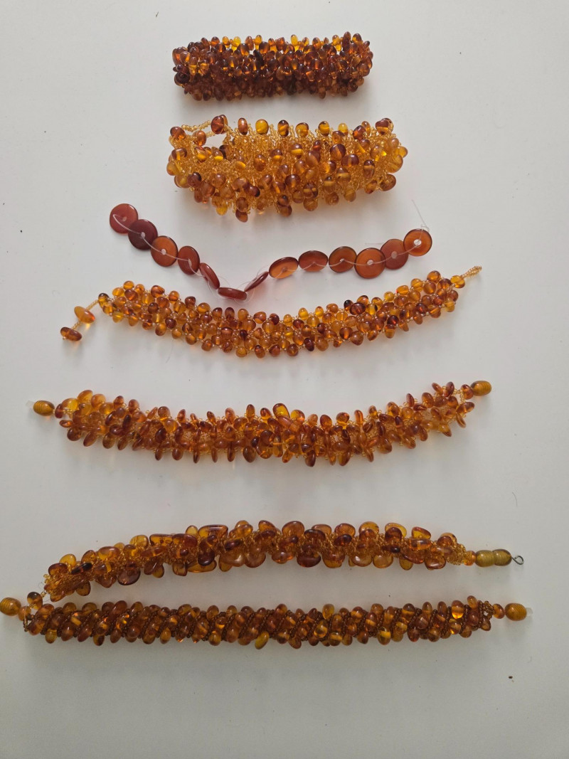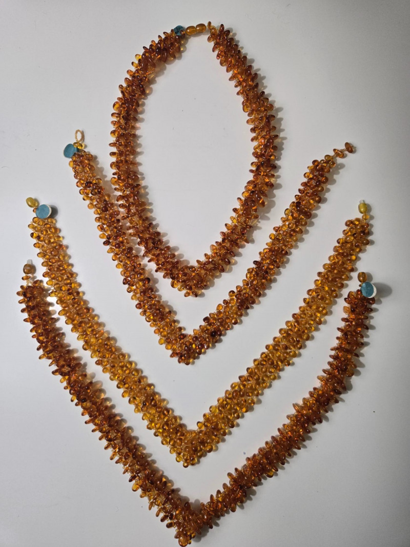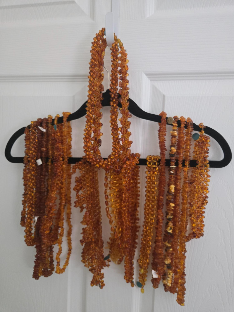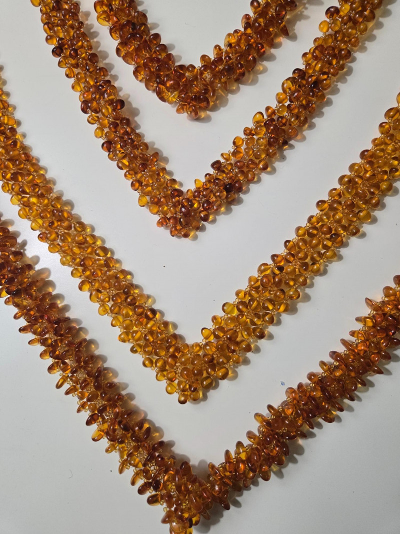 This collection of amber bead necklaces and bracelets is a radiant showcase of natural beauty and craftsmanship. Material: Genuine amber, known for its warm glow and organic origins (fossilized tree resin) Color Range: Golden yellow, honey, cognac, deep orange-brown Transparency: Varies from translucent to semi-opaque Shapes: Includes polished rounds, irregular nuggets, and freeform chips Style: Strands may be uniform or graduated, with some pieces featuring natural inclusions or artisanal variation Length Options: Typically ranges from choker (14–16") to matinee (20–24") Designs: Single-strand simplicity for everyday elegance Multi-strand layering for bold, bohemian flair Statement pieces with chunky amber nuggets or mixed textures Closures: Barrel clasps, screw clasps, or stretch cord Fit: Stretch or clasped styles, often 6.5–8" in length Designs: Uniform bead bracelets for stacking Mixed amber tones for visual interest Healing or symbolic styles (amber is often associated with calming energy and natural wellness) Overview: Amber Bead Jewelry