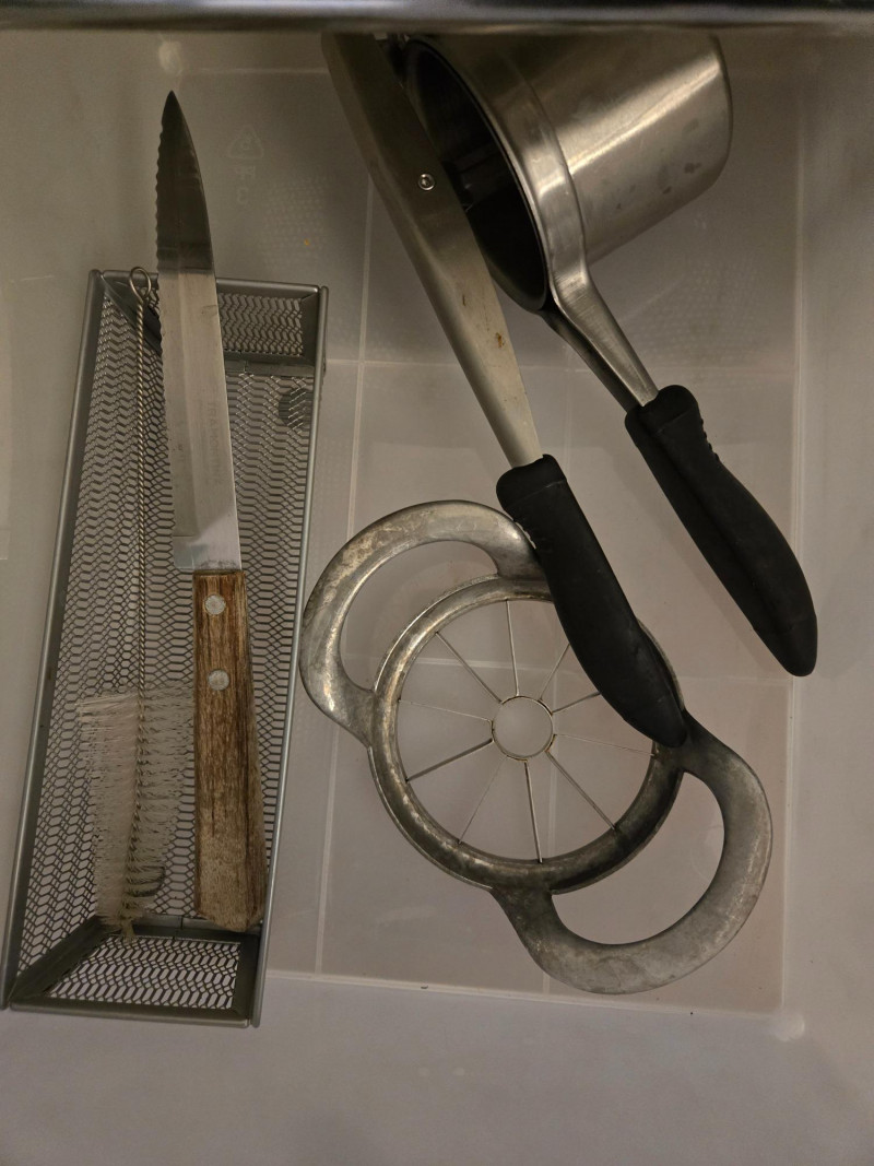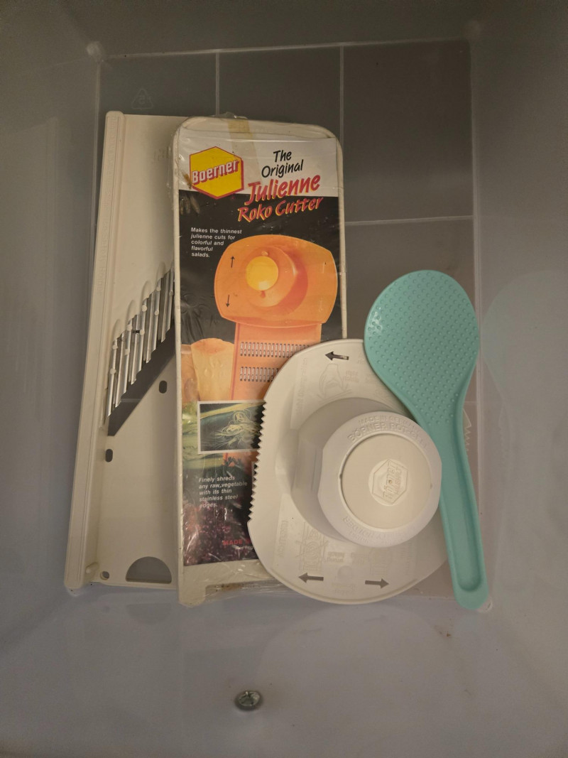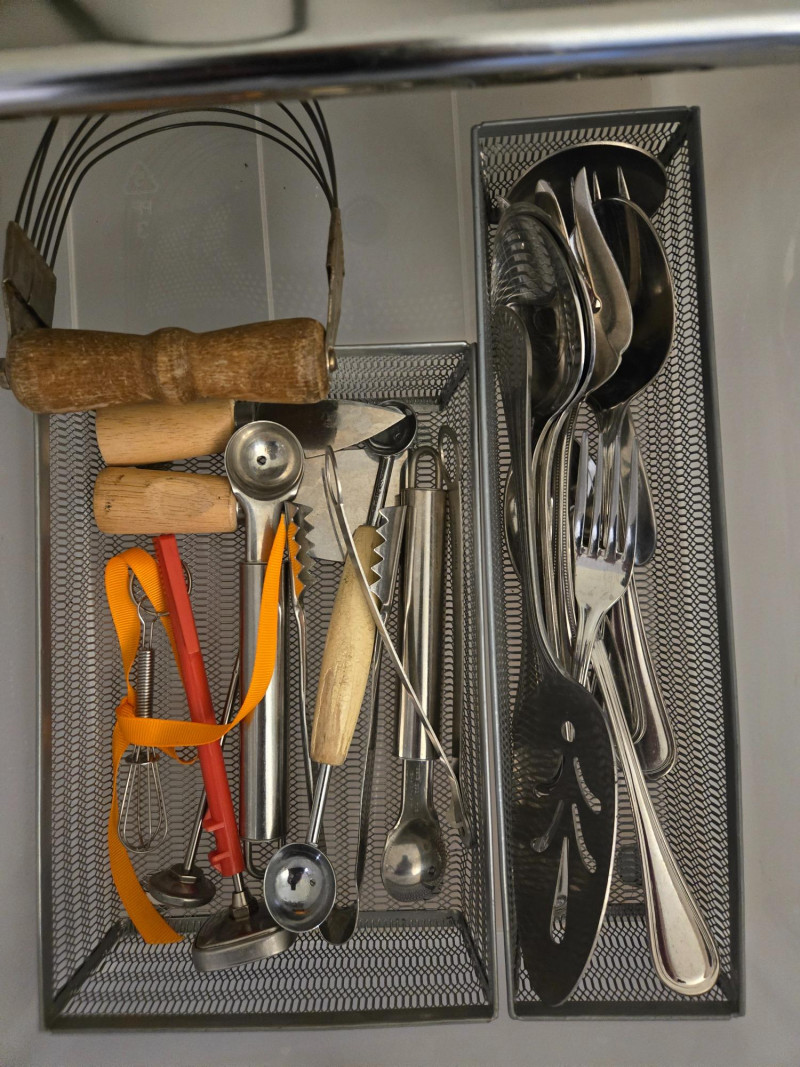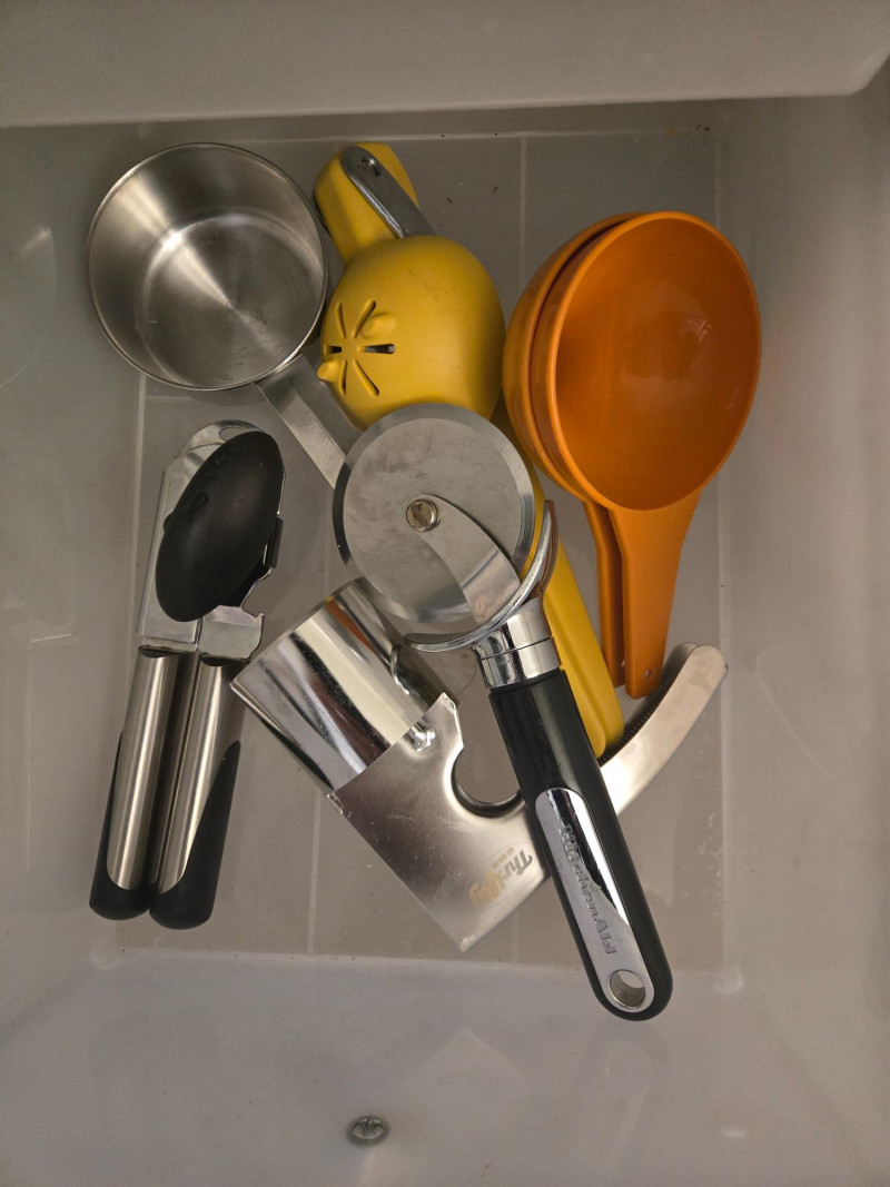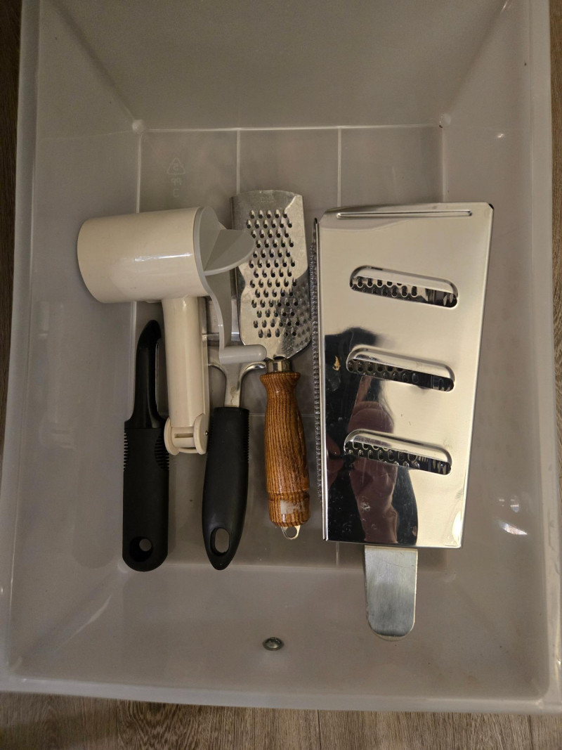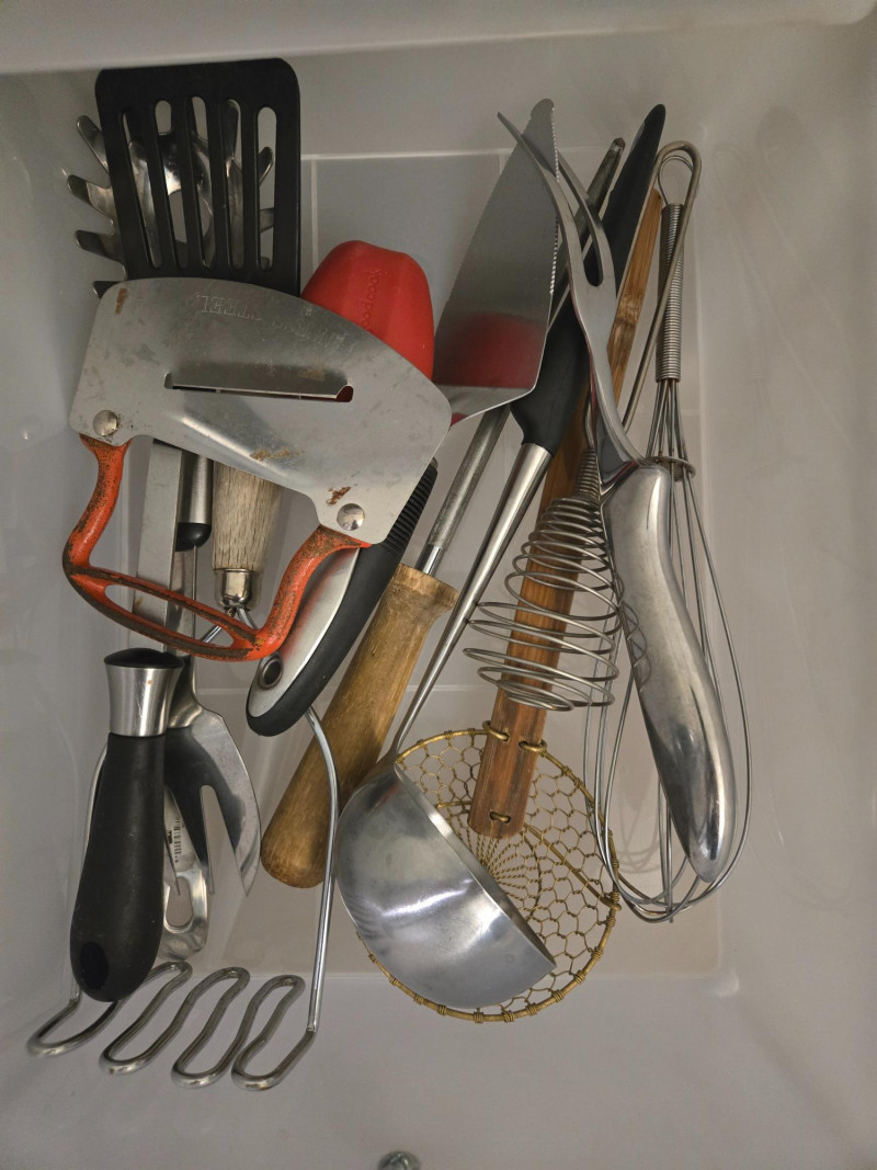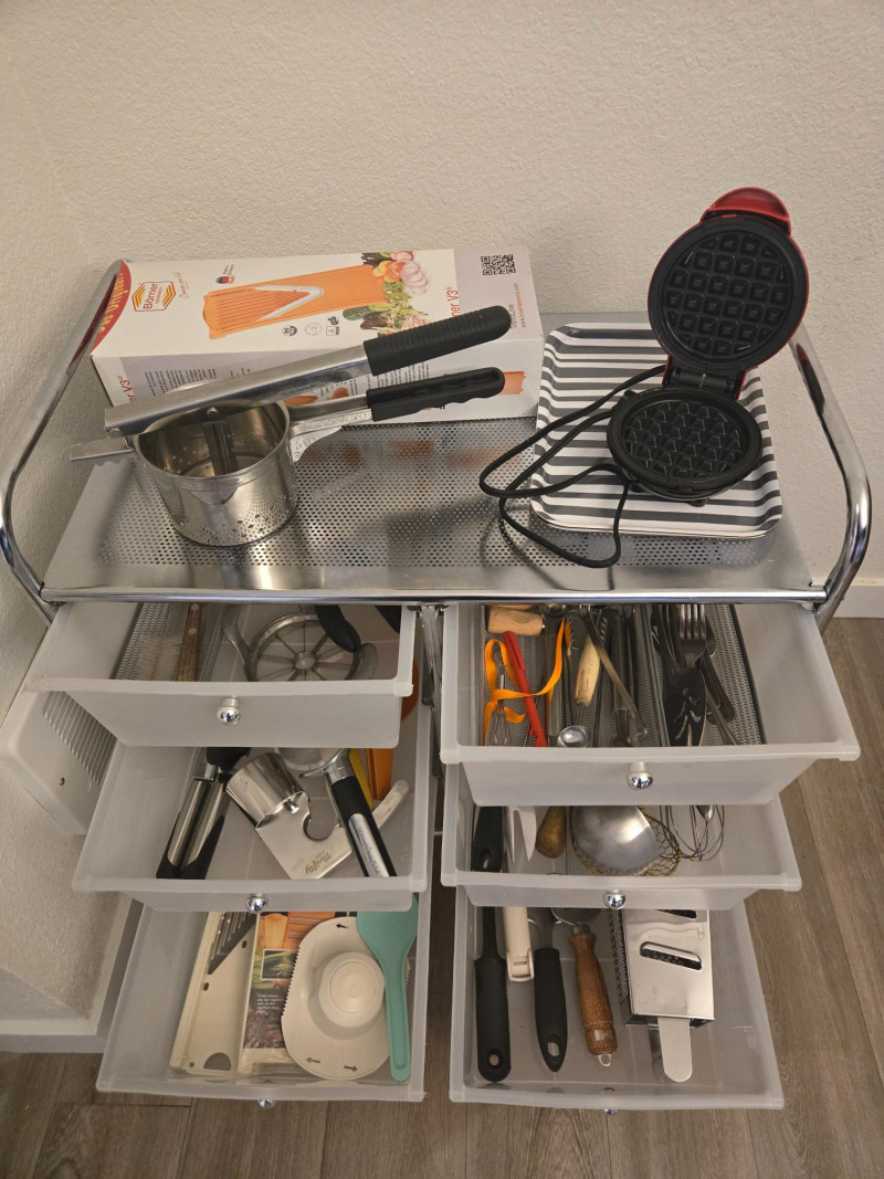 This rolling drawer cart is a kitchen powerhouse on wheels, packed with a wide array of utensils and tools that make it ideal for both everyday cooking and specialized prep tasks. Here's a breakdown of what makes it so useful: Red Waffle Maker: Great for weekend brunches or creative savory waffles. Striped Tray: Handy for serving or organizing ingredients. Metal Saucepan: A versatile piece for boiling, simmering, or reheating. Mandoline Slicer (boxed): Perfect for precision slicing of vegetables—ideal for salads, gratins, or pickling. Black-handled tools: Likely tongs or spatulas, useful for flipping, stirring, or serving. Top Left Drawer: Metal tools like a whisk, garlic press, and citrus juicer—your go-to for baking and flavoring. Top Right Drawer: Cutlery and scissors—ready for prep, serving, or quick snips. Middle Left Drawer: Potato masher, garlic press, and more—great for comfort food and hearty dishes. Middle Right Drawer: Ladle, whisk, and cooking tools—ideal for soups, sauces, and batters. Bottom Left Drawer: Mandoline slicer, measuring cup, spatula, and recipe booklet—this drawer screams “prep station.” Bottom Right Drawer: Can opener, peeler, grater—essential for opening, peeling, and shredding. Top Shelf Essentials
