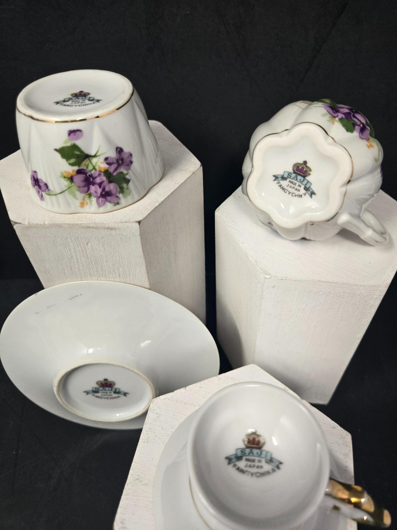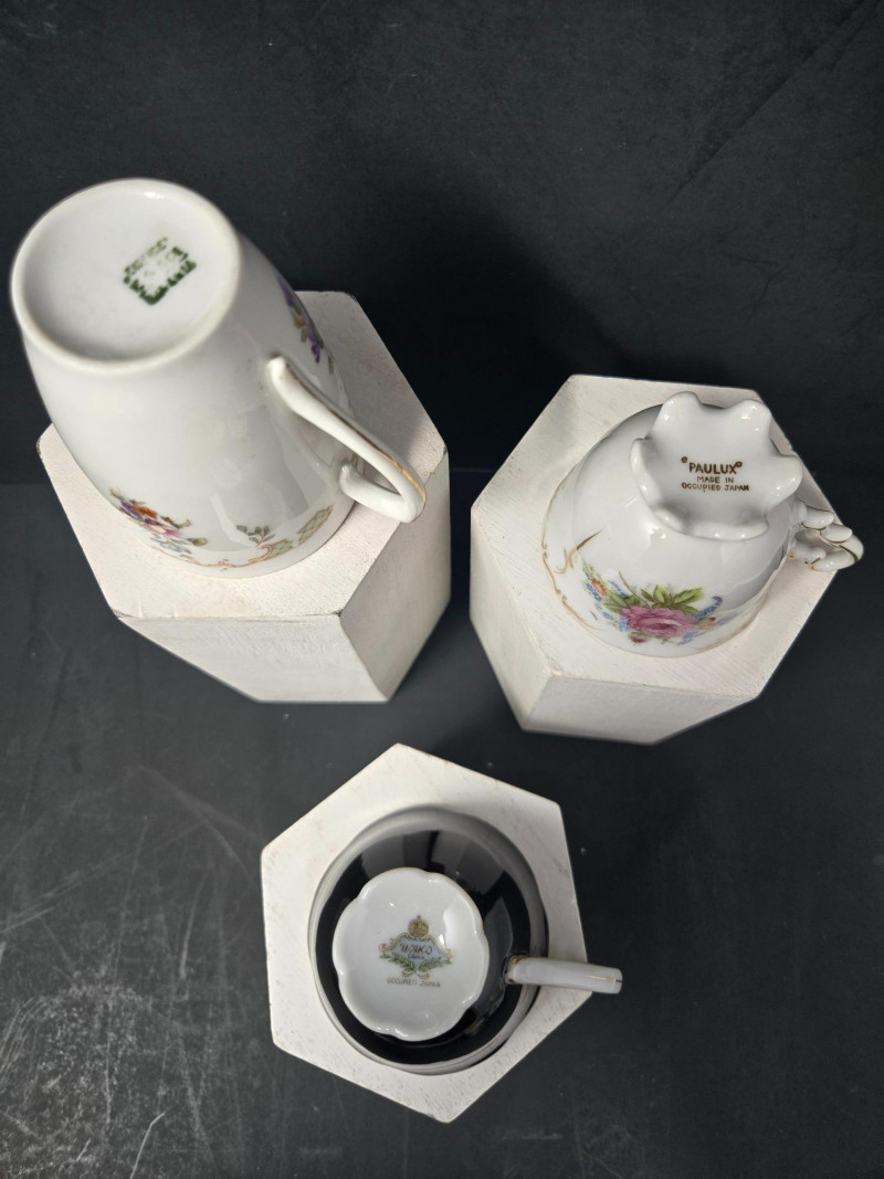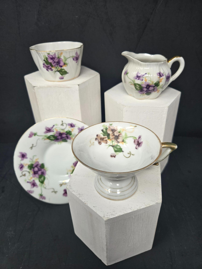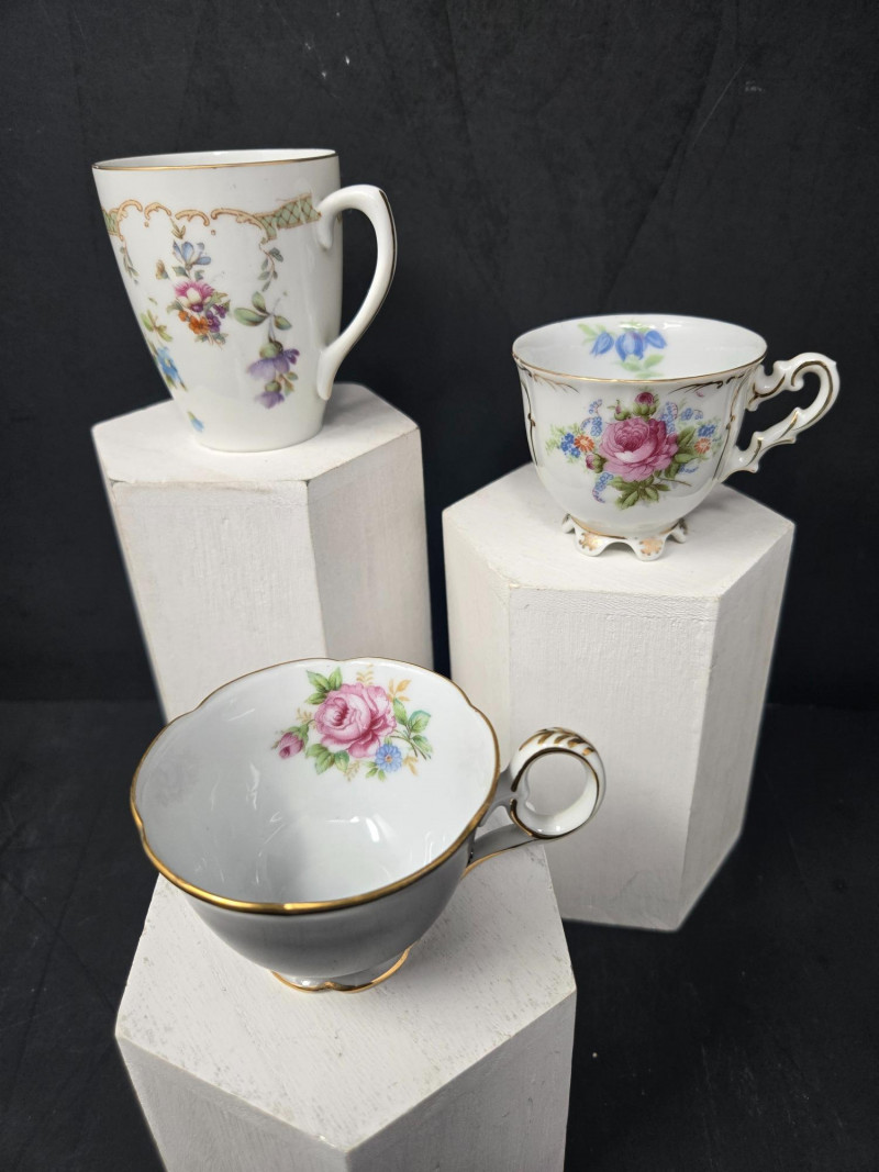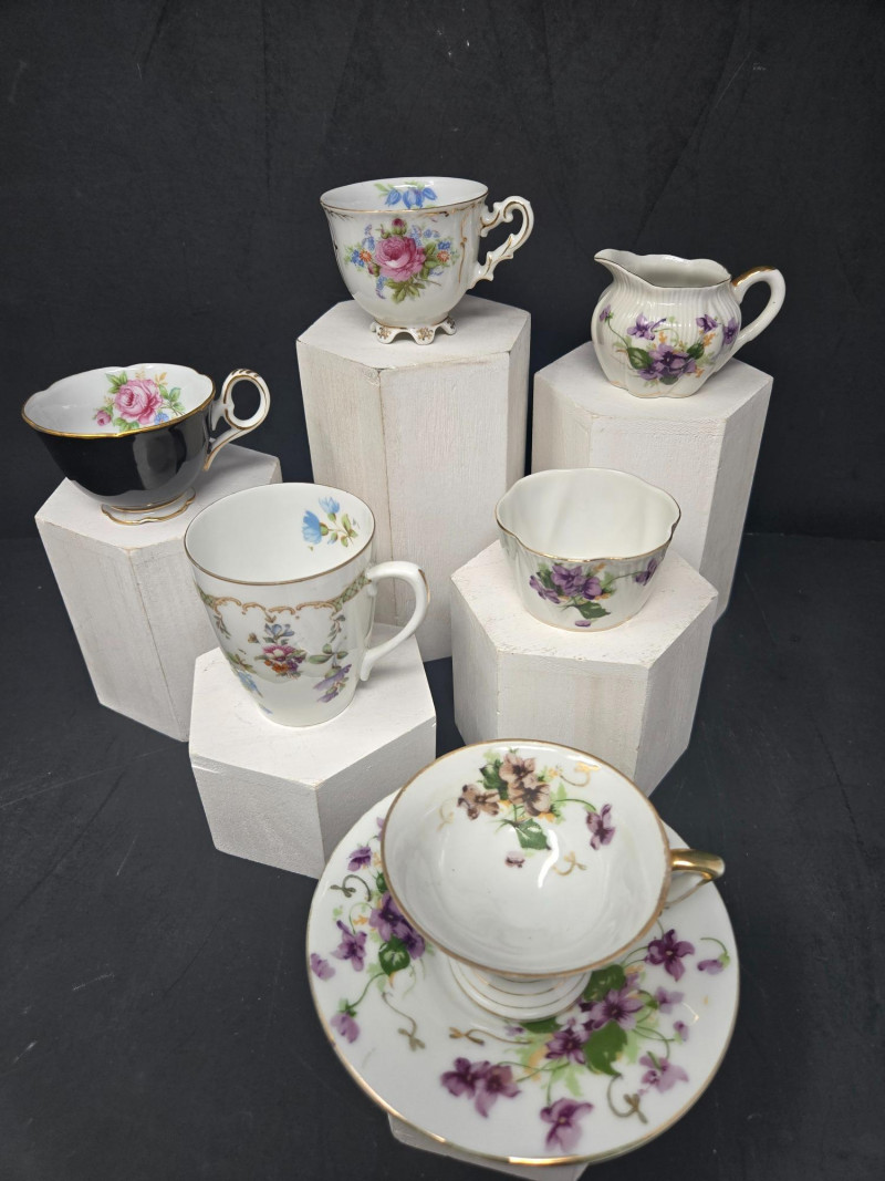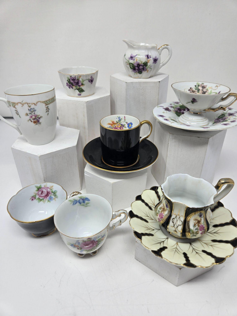 Design & Style: Mixed floral patterns featuring roses, violets, and blue blossoms Gold detailing on rims and handles Unique shapes and scalloped edges add elegance and variety Includes a ribbed creamer with violet motif Presentation: Staged on white pedestal blocks for visual impact Perfect for curio cabinets, tea-themed décor, or vintage bundling Ideal for pairing with lace linens, copper trays, or mirrored risers Auction Notes: Bidding agreement required; pickup must be arranged unless shipping is pre-approved Full payment due by 8:00 p.m. the day after auction closes 10% buyer’s premium and sales tax apply unless re-seller license is providedMiniature China Collection – Floral Teacups, Saucers & Creamer