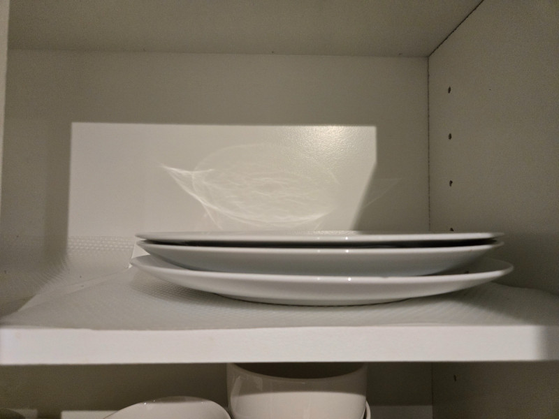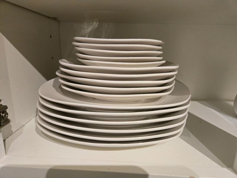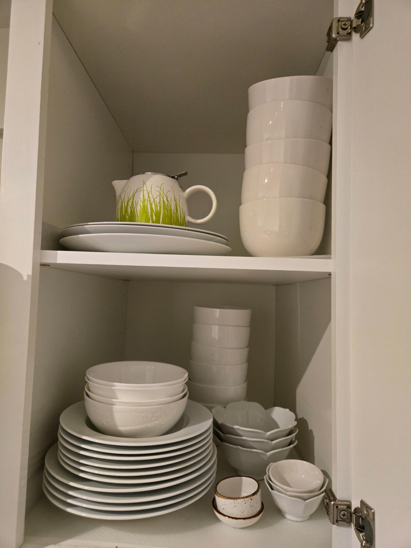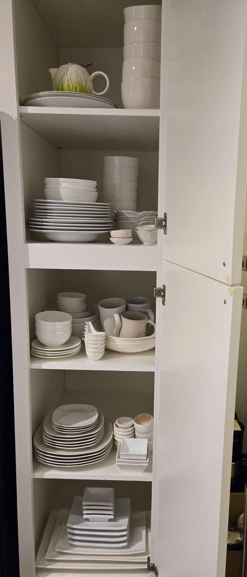 Mix-and-match collection of white dishes. Top Shelves