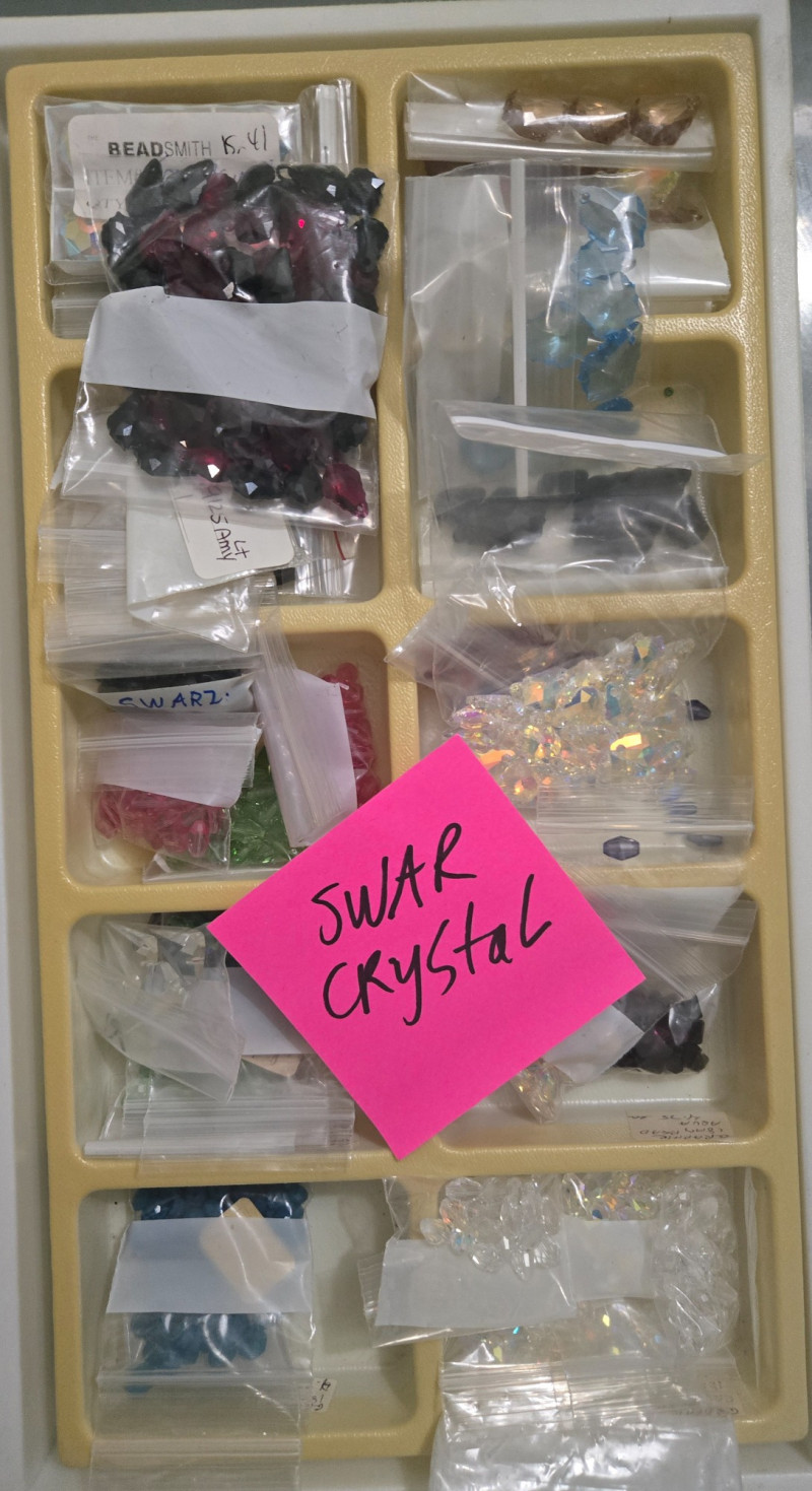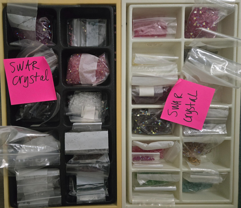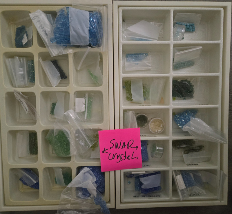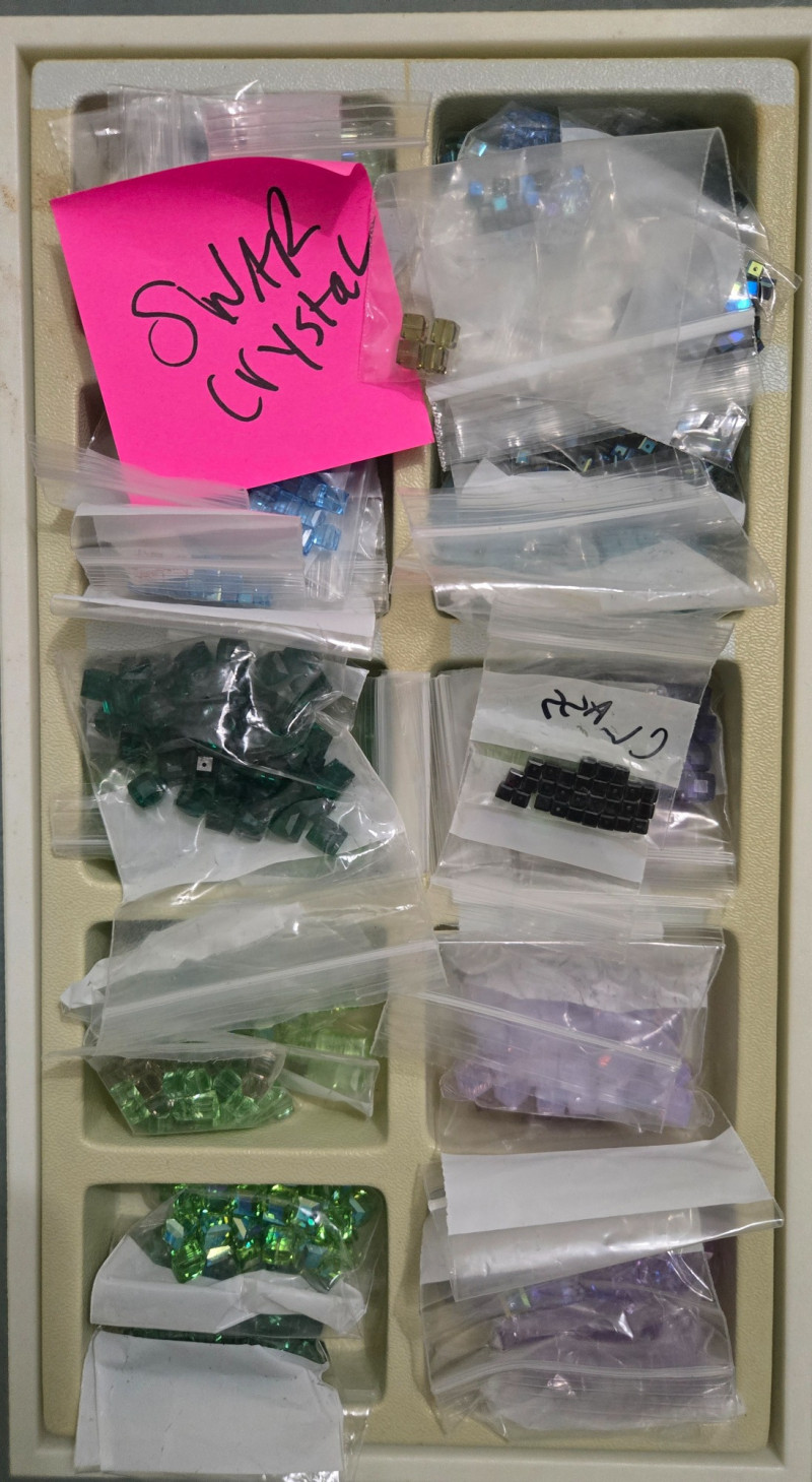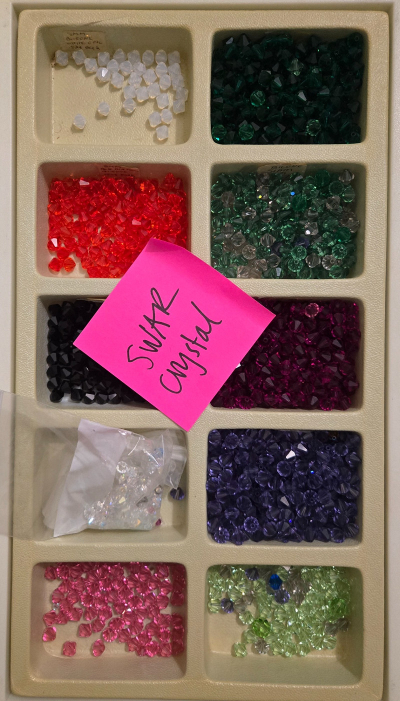 This is a beautifully organized collection of Swarovski crystals and beads, ideal for jewelry making, embellishment, or high-end craftwork. Multiple Trays: Each compartment holds beads sorted by type, size, and color, making it easy to find exactly what you need. Labels “Swar Crystal” / “SWAR Crystal”: These indicate genuine Swarovski elements, known for their precision cut, clarity, and brilliance. Variety of Shapes: Faceted rounds: Classic sparkle for earrings, bracelets, and necklaces. Pearls: Swarovski’s imitation pearls have a smooth finish and durable coating. Bicones and rondelles: Ideal for spacers and adding dimension to designs. Crystal Clarity: Swarovski uses lead-free advanced crystal formulas for unmatched sparkle. Durability: Coatings resist fading and scratching, making them perfect for wearable art. Color Range: Includes iridescent, opaque, and transparent finishes—great for seasonal or thematic designs. What’s in the Collection