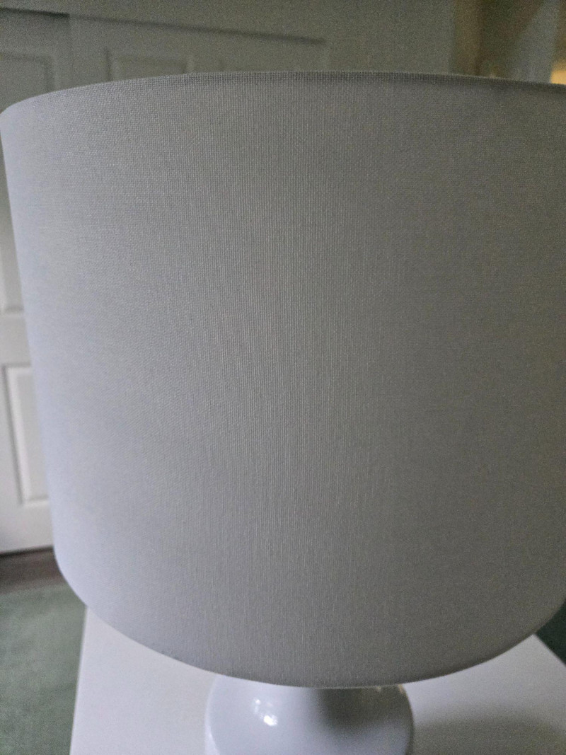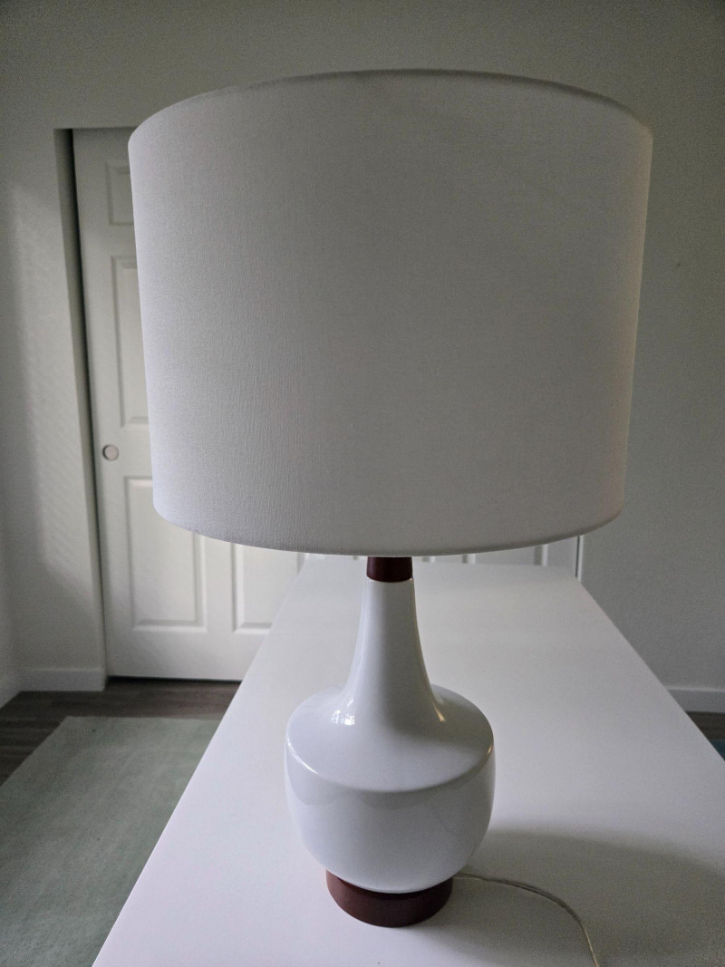 Here's a polished breakdown for showcasing or listing the IKEA desk, lamp, and abstract print ensemble—ideal for auction, resale, or interior styling: Design: Minimalist and modern Color: Crisp white finish Style Notes: Clean lines and neutral tone make it versatile for home office, study, or creative space Condition: Appears gently used; no visible damage Shade: Cylindrical white fabric Base: Rounded form with a natural wood accent Style: Scandinavian-inspired; blends simplicity with warmth Function: Ideal for desk, bedside, or reading nook lighting Artwork: Geometric composition in muted tones—gray, beige, blue Frame: Silver-toned with double matting for a refined presentation Mood: Calm and contemporary; complements minimalist or modern decor Placement: Works well above the desk or in a hallway/gallery wall IKEA White Desk
