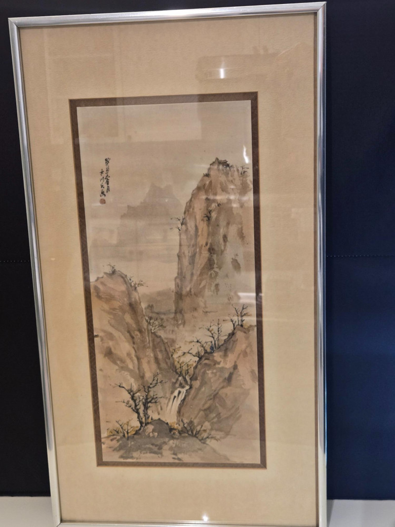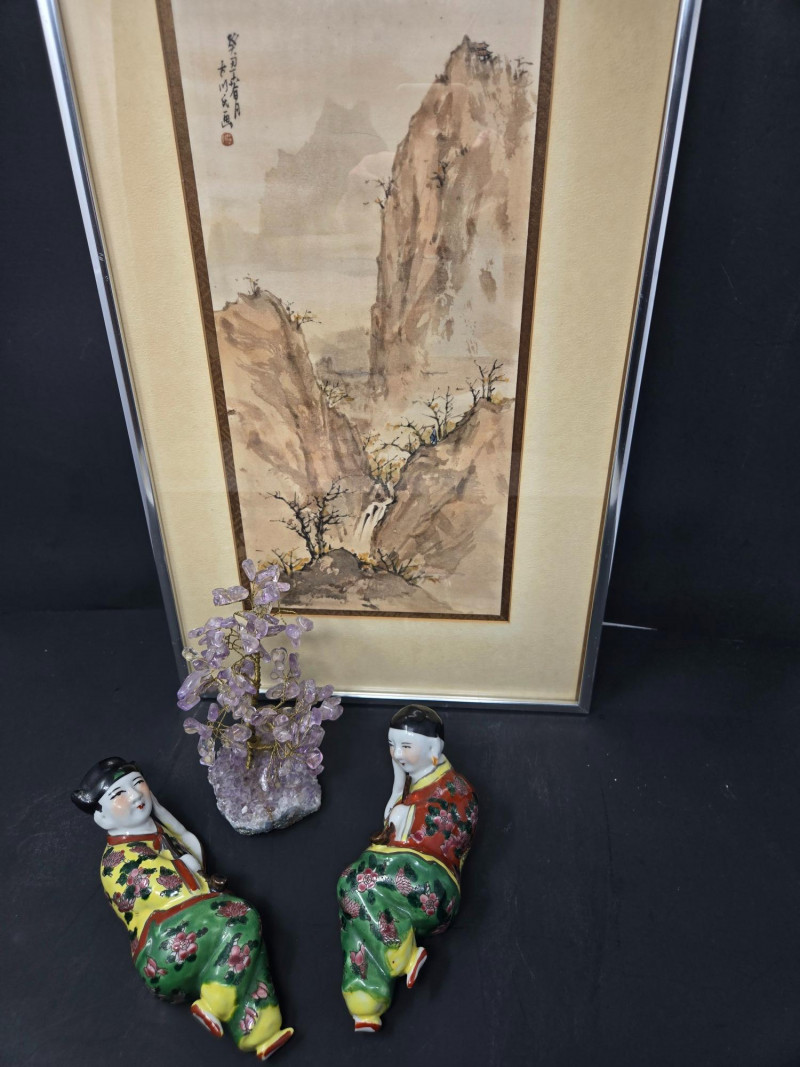This trio of objects forms a striking vignette that blends traditional Chinese artistry, figurative ceramic craftsmanship, and spiritual crystal decor. Style: This is a classic Chinese brush painting, likely inspired by the Shan Shui tradition ("mountain-water"), which emphasizes harmony between nature and humanity. Features: Steep cliffs and misty peaks evoke solitude and transcendence. Sparse trees suggest resilience and seasonal change. Calligraphy in the corner may include a poem, artist’s name, or date—often integral to the composition. Cultural Significance: These landscapes are not just scenic—they reflect Daoist philosophy, where nature is revered as a spiritual teacher. Material: Likely hand-painted ceramic, with intricate floral robes and expressive faces. Pose & Attire: Seated in relaxed positions, they may represent scholars, elders, or immortals, common themes in Chinese decorative arts. Symbolism: Pipe smoking can symbolize contemplation, wisdom, or leisurely storytelling. Their presence adds a human narrative to the otherwise serene landscape. Composition: Wire branches adorned with amethyst crystals, mounted on a mineral base. Meaning: Amethyst is associated with calm, clarity, and spiritual protection. Gem trees are often used in feng shui to attract positive energy and balance. Placement: Positioned between the figurines, it acts as a visual and energetic centerpiece.Asian Landscape Print