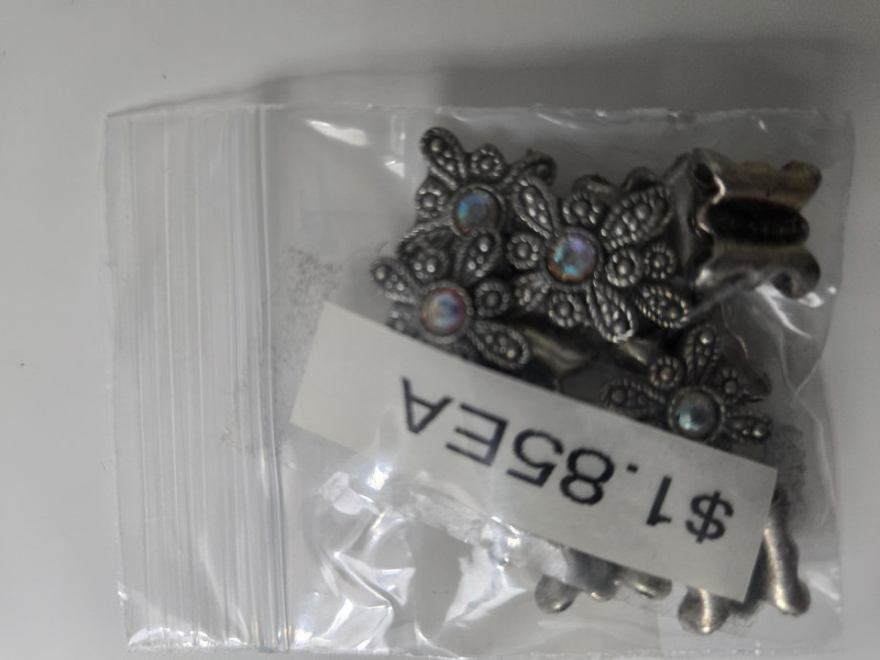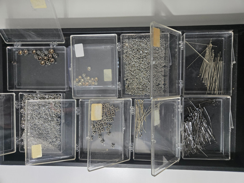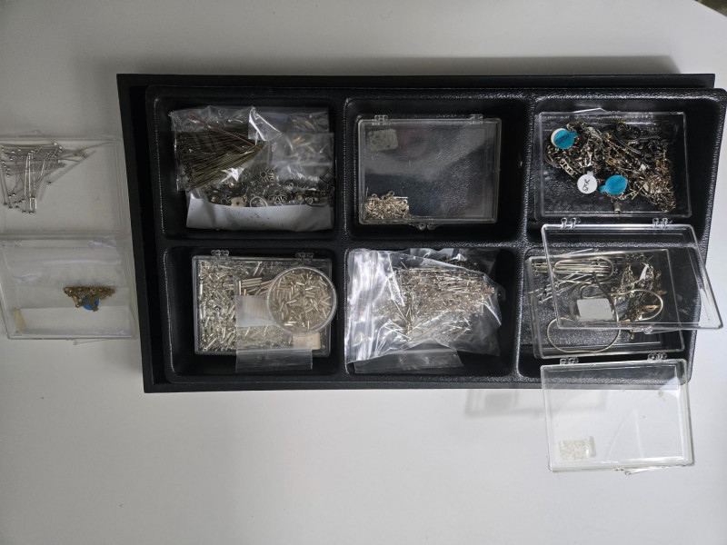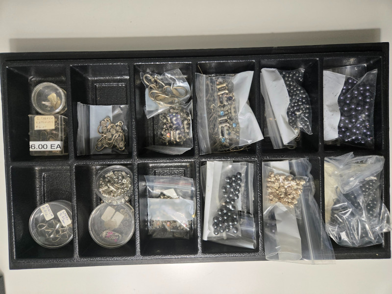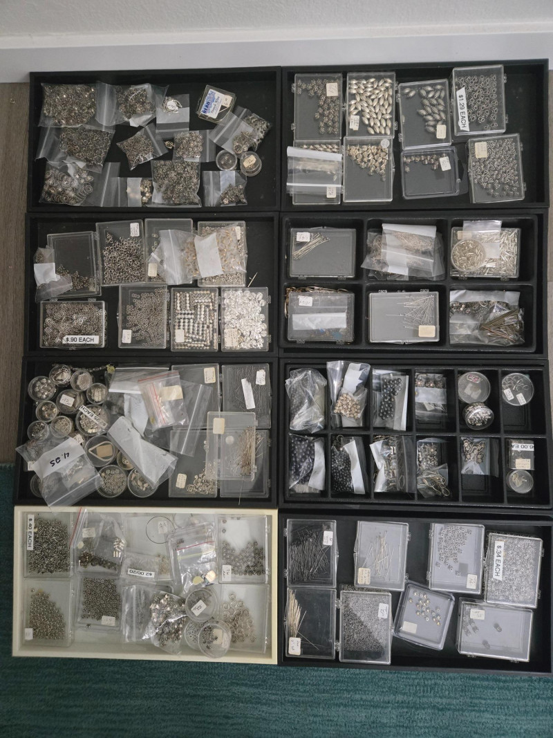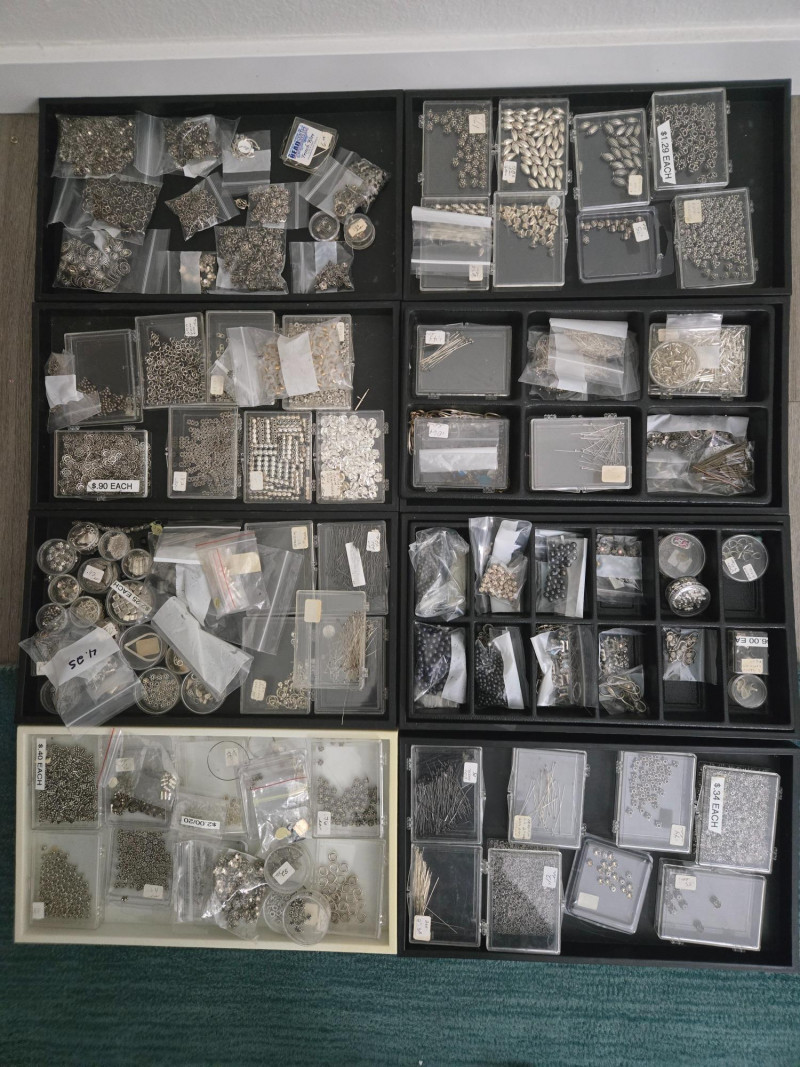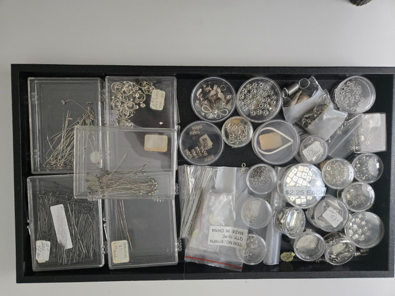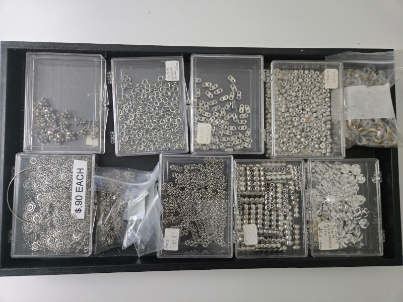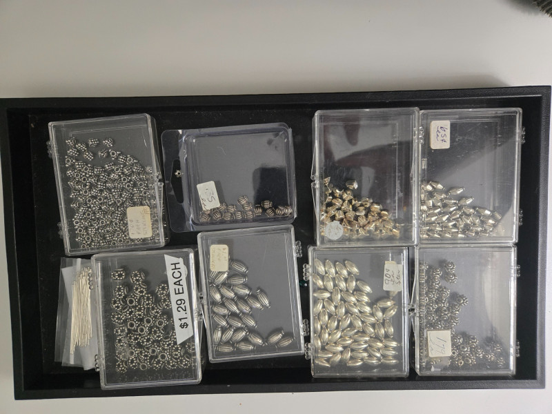 Use: Jewelry making, beading, repair, and design Findings & Components: Jump rings, lobster clasps, head pins, eye pins Spacer beads, crimp beads, bead caps Toggle clasps, hook-and-eye closures, earring hooks Beads: Round, faceted, and decorative shapes Textured, filigree, and stamped designs Sizes range from micro (2mm) to statement (10mm+) Packaging: Many items sorted in small bags or compartments Labeled pricing: “$.25–$1.25 EACH” and bulk packs (“10 pc,” “50 pc,” “100 pc”) Condition: Clean, organized, and ready for use Tray Contents & Highlights