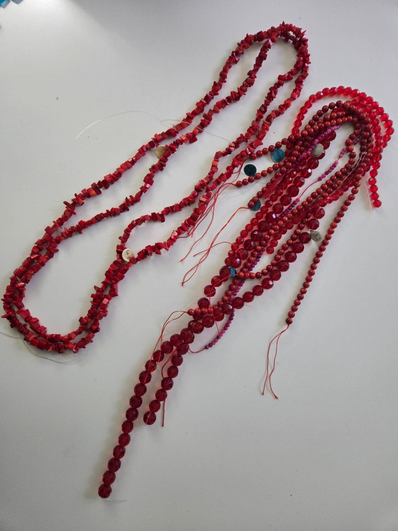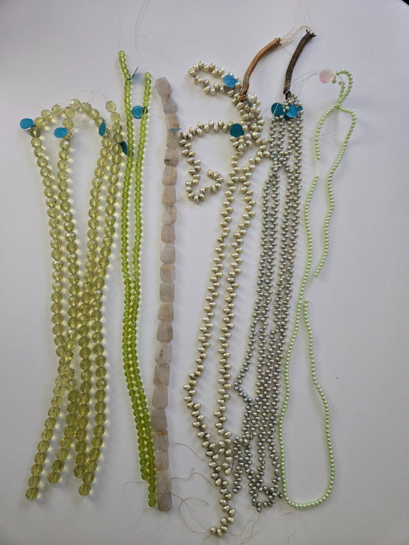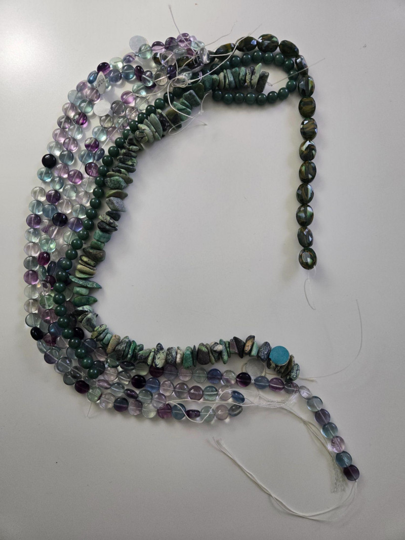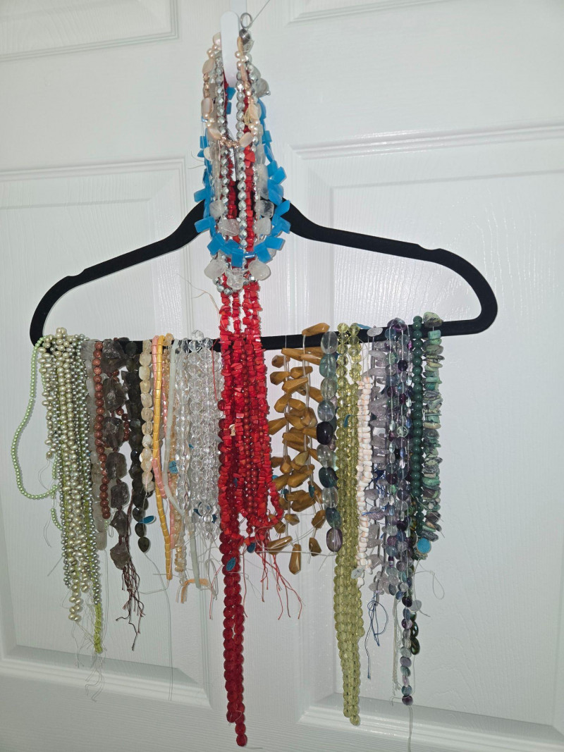 Materials & Styles: Includes polished stones, glass, resin, and faux pearls Shapes: round, oval, square, chip, and irregular Colors: rich spectrum including emerald green, amber, ruby red, sapphire blue, smoky quartz, clear crystal, and metallic accents Textures: smooth, marbled, translucent, and faceted finishes Presentation: Organized on black hanger for easy viewing and sorting Ideal for bundling by color, material, or project theme Includes several statement strands with large beads and vibrant tones52 Strands of High-End Beads – Premium Variety for Jewelry & Crafting