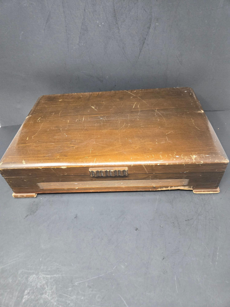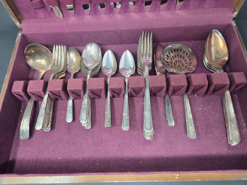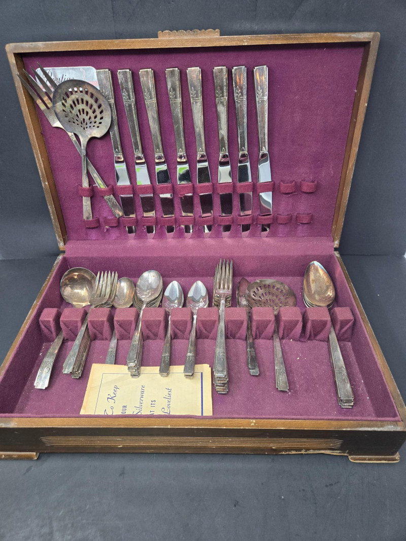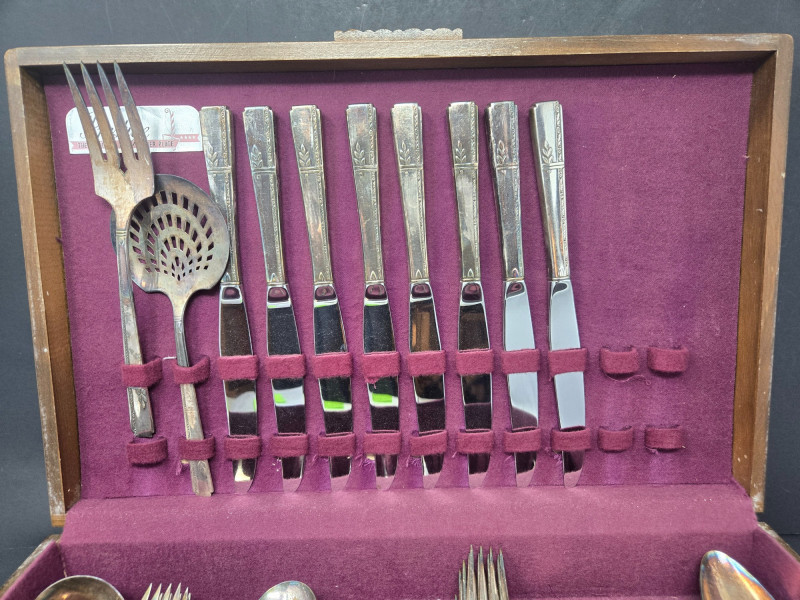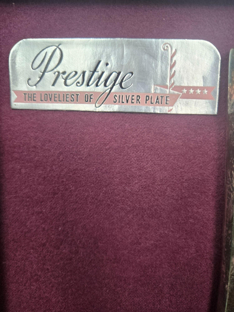 Prestige silverplated flatware set displayed in a wooden storage case lined with deep burgundy velvet. Overall Description