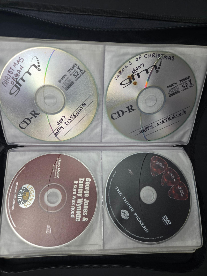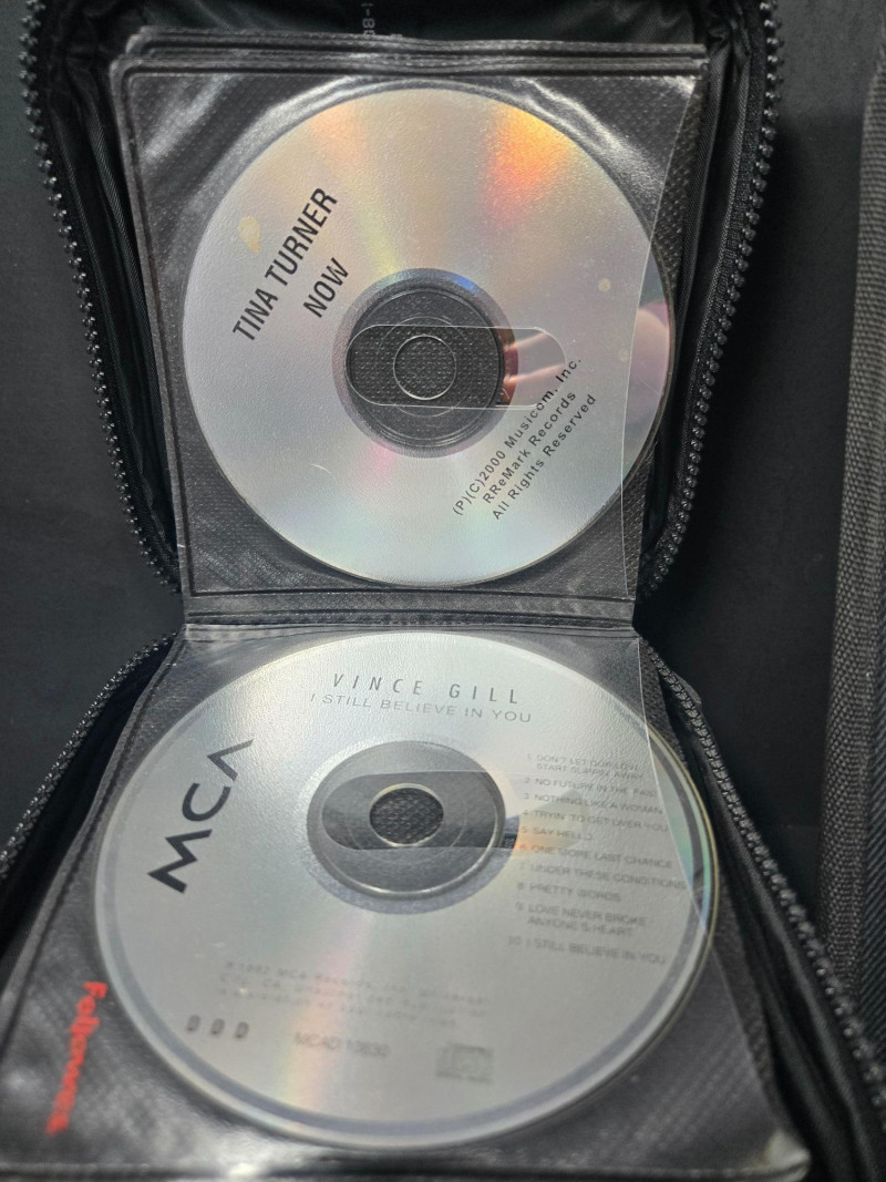 Condition: Well-organized; discs appear clean and sorted Genres Represented: Country (e.g., George Jones & Tammy Wynette) Rock & Pop (e.g., Tina Turner) Gospel & Inspirational (e.g., Tracy Lawrence – The Rock) Americana & Bluegrass (e.g., The Three Pickers DVD) Practice and demo recordings (e.g., “RCA – Practice Notes,” “MDM”) Format Mix: Commercial releases CD-Rs and custom compilations Music and video (CDs and DVDs) Label Variety: Sony Music, RCA, and independent labels Legend Series and specialty pressings Content Highlights