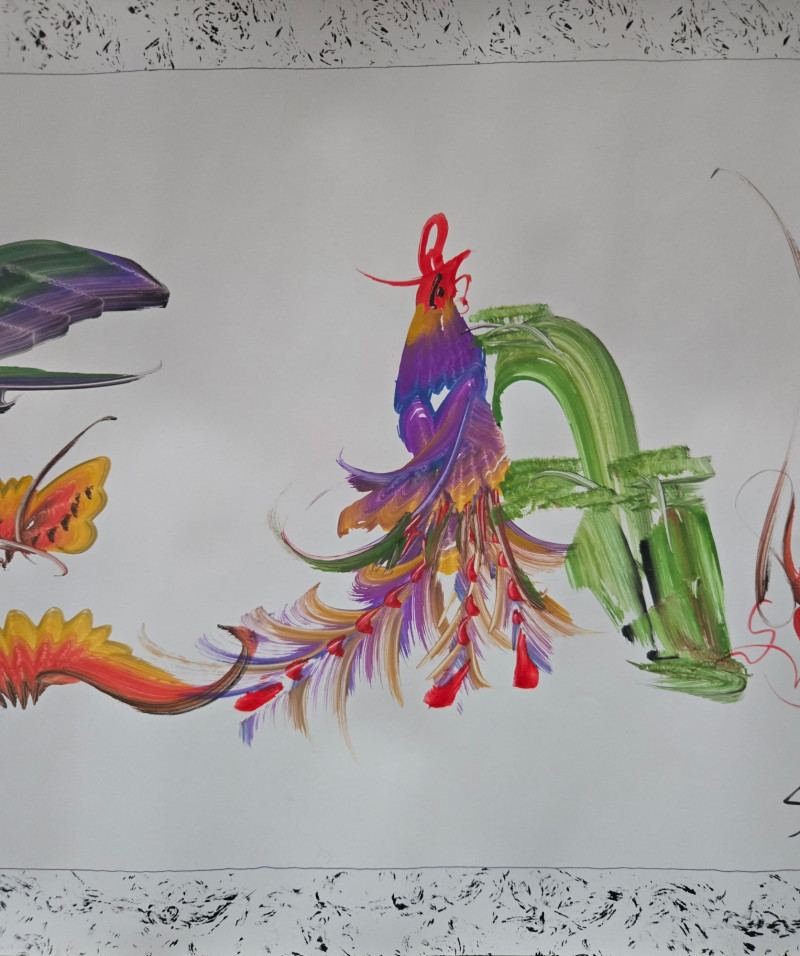 The artwork combines Chinese brush painting techniques with modern decorative lettering. The use of dragons, phoenix, bamboo, and butterflies reflects traditional Chinese symbolism: