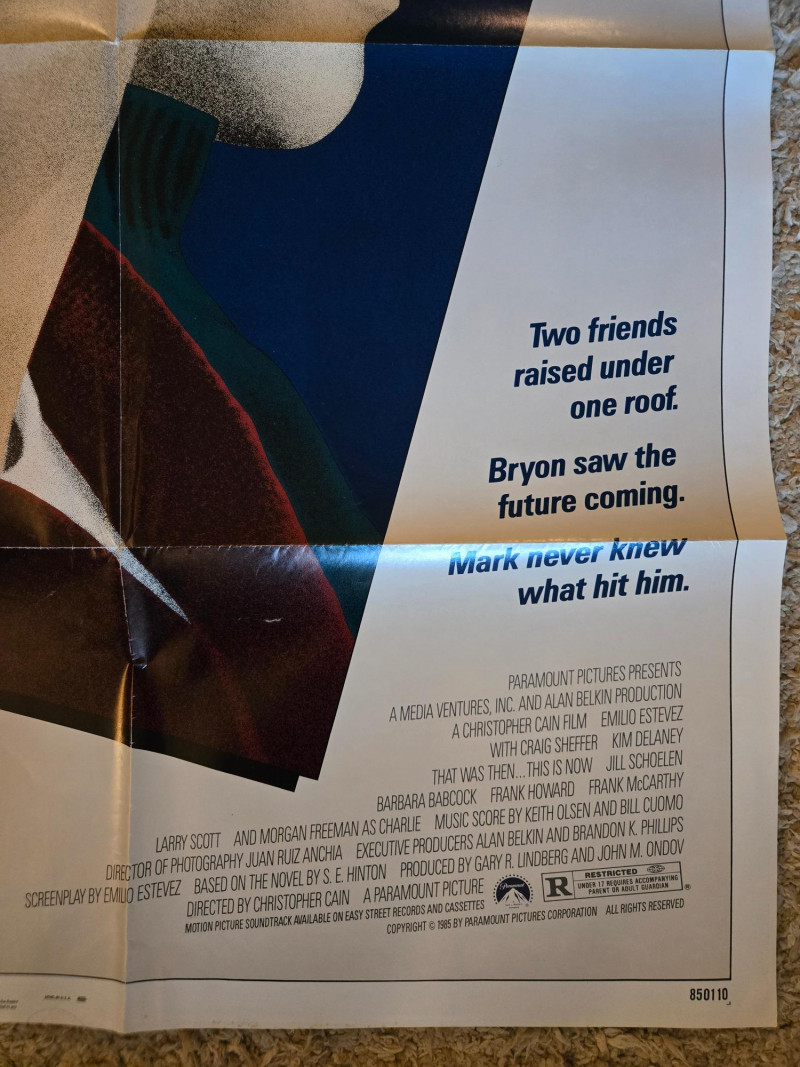 The poster for That Was Then... This Is Now starring Emilio Estevez captures the emotional tension and coming-of-age drama rooted in S.E. Hinton’s storytelling. Title: That Was Then... This Is Now Release Year: 1985 Directed by: Christopher Cain Screenplay by: Emilio Estevez Based on: The novel by S.E. Hinton Starring: Emilio Estevez, Craig Sheffer, Morgan Freeman Studio: Paramount Pictures Genre: Teen Drama / Coming-of-Age Visuals: Two young men—one looking forward, the other to the side—symbolize diverging paths and inner conflict. Tagline: “Two friends raised under one roof. Bryon saw the future coming. Mark never knew what hit him.”—hinting at a painful rift between close friends. Typography: Bold title treatment emphasizes the contrast between past and present, echoing the film’s central theme. The story explores friendship, loyalty, and the painful transition into adulthood, as two foster brothers face choices that test their bond. It’s a reflective and emotionally charged narrative, much like Hinton’s other works (The Outsiders, Rumble Fish). Part of the wave of 1980s adaptations of S.E. Hinton novels, this film helped cement Emilio Estevez’s early career as both actor and screenwriter. The poster is a nostalgic piece for fans of teen dramas and literary adaptations from the era.About the Film