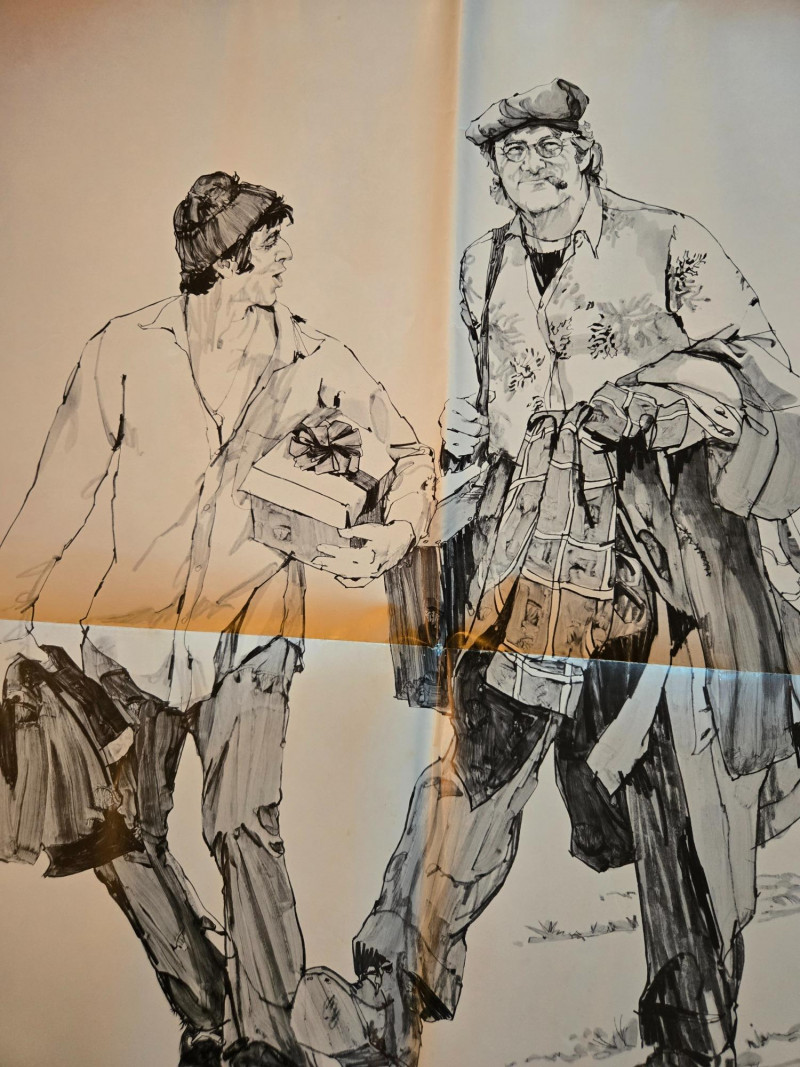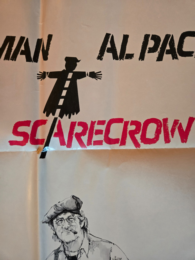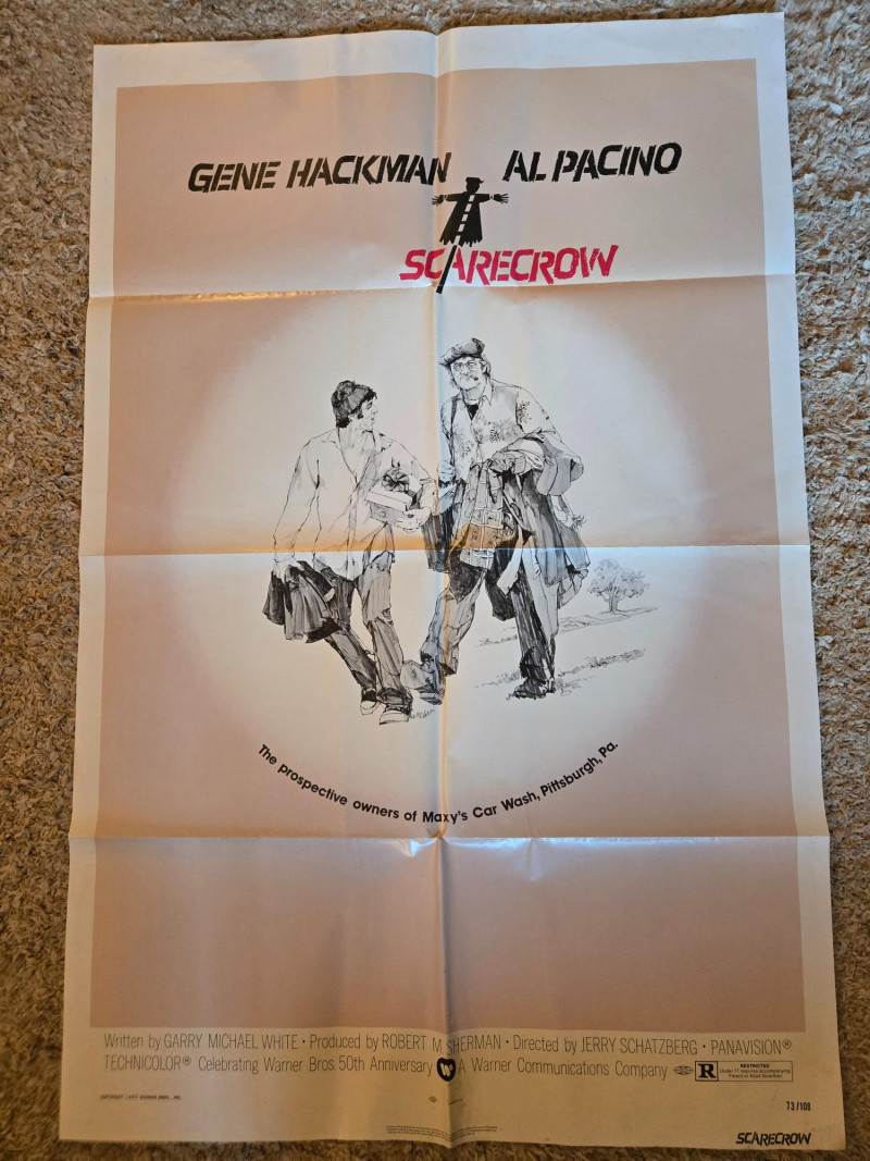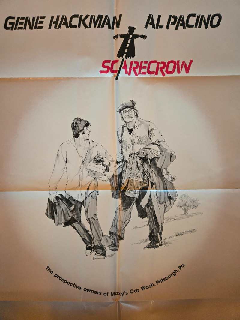 The poster for Scarecrow featuring Gene Hackman and Al Pacino is a striking visual that captures the essence of this introspective 1970s road film. Title: Scarecrow Release Year: 1973 Director: Jerry Schatzberg Starring: Gene Hackman, Al Pacino Genre: Drama / Road Movie Studio: Warner Bros. Awards: Won the Grand Prix at the Cannes Film Festival Illustration: Depicts Hackman and Pacino walking together, bags slung over their shoulders, suggesting camaraderie and a journey. Symbolism: A scarecrow graphic between their names hints at vulnerability and the film’s title metaphor—how people use humor or bravado to ward off emotional pain. Tagline: “The prospective owners of Maxy's Car Wash, Pittsburgh, Pa.”—a nod to their shared dream and the bittersweet tone of the story. Typography: Bold black text for the actors’ names and a stylized red font for the title, emphasizing star power and emotional weight. The film explores friendship, disillusionment, and the search for meaning, following two drifters as they travel across America. Hackman and Pacino deliver deeply human performances, portraying flawed men trying to find purpose in a harsh world. Scarecrow is considered a hidden gem of 1970s cinema, praised for its character-driven narrative and emotional depth. The poster is a collectible favorite for fans of classic American road films and the early careers of Hackman and Pacino.About the Film