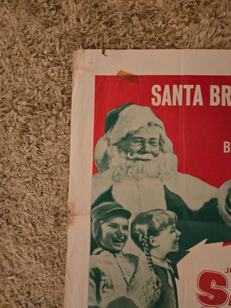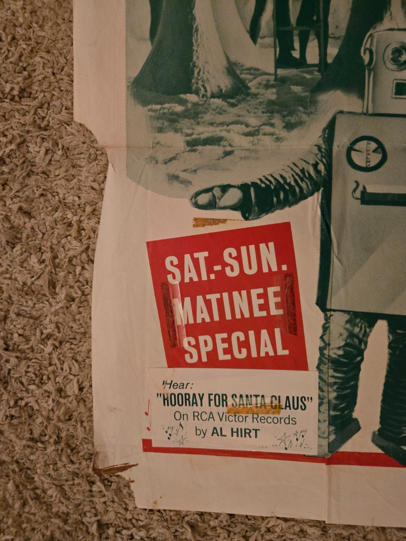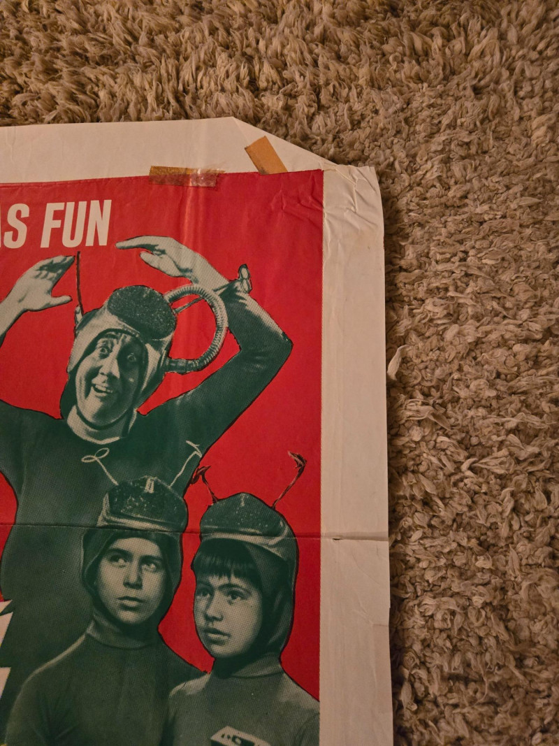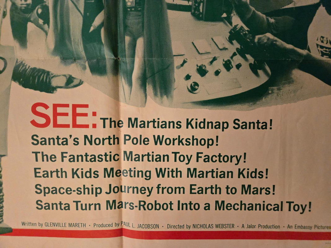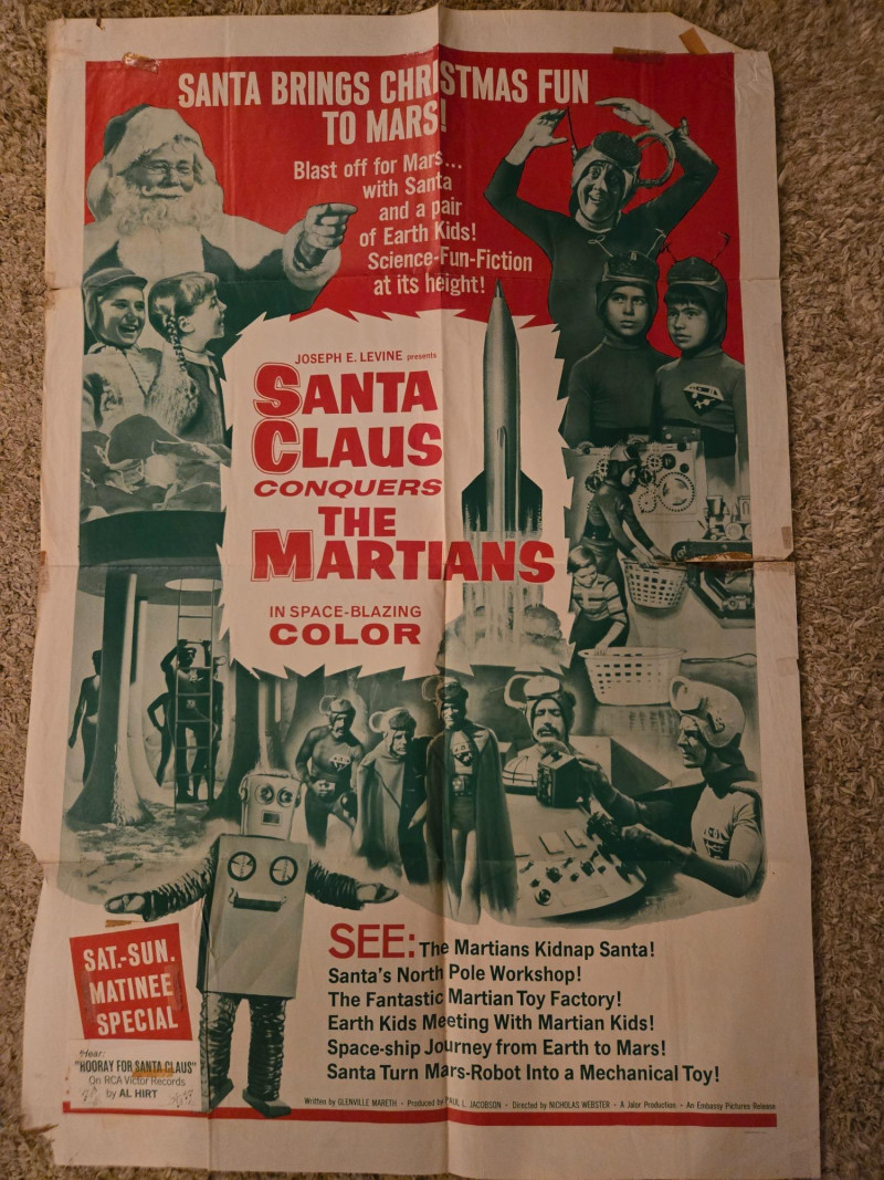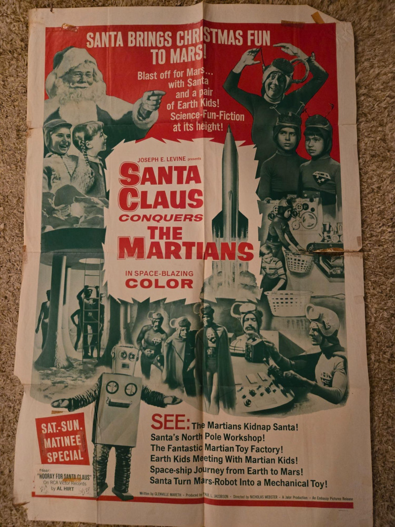 This one is a little beat up. The poster for Santa Claus Conquers the Martians is a delightful blend of kitsch and sci-fi whimsy, perfectly capturing the spirit of this cult classic. Title: Santa Claus Conquers the Martians Release Year: 1964 Director: Nicholas Webster Written by: Glenville Mareth Produced by: Paul L. Jacobson Studio: Jalor Productions Distributed by: Embassy Pictures Genre: Holiday / Science Fiction / Family Color Scheme: Bold reds, greens, and whites evoke Christmas cheer while hinting at interplanetary adventure. Imagery: Santa Claus, Earth children, Martians, a robot, and a rocket ship—all rendered in a mix of illustration and photography. Taglines: “Santa brings Christmas fun to Mars!” “Blast off for Mars—with Santa and a pair of Earth Kids! Science-Fun-Fiction at its height!” Promotional Tie-In: Mentions the song “Hooray for Santa Claus” by Al Hirt on RCA Victor Records. The film is a campy mashup of holiday cheer and space-age absurdity, where Martians kidnap Santa to bring joy to their children. The poster’s playful design reflects the film’s low-budget charm and imaginative premise. Widely considered one of the most so-bad-it’s-good movies, it has earned a cult following and frequent appearances in holiday-themed retrospectives. The poster is a prized collectible for fans of vintage sci-fi, holiday oddities, and retro pop culture. About the Film