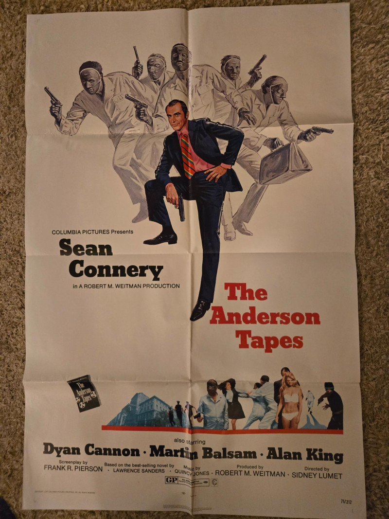 The poster for The Anderson Tapes starring Sean Connery and Dyan Cannon is a dynamic visual encapsulation of early 1970s crime cinema. Here's a deeper look into its cinematic and cultural significance: Title: The Anderson Tapes Release Year: 1971 Director: Sidney Lumet Screenplay: Frank Pierson Based on: The novel by Lawrence Sanders Starring: Sean Connery, Dyan Cannon, Martin Balsam, Alan King Music by: Quincy Jones Studio: Columbia Pictures Genre: Crime / Thriller / Heist Central Figure: Sean Connery in a suit, gripping a gun—exuding authority and tension. Masked Men: Surrounding him are white-clad, masked figures with weapons, hinting at a coordinated heist. Supporting Imagery: Scenes of a woman in a swimsuit, a building, and various characters suggest layers of intrigue and surveillance. Typography: Bold, clean fonts emphasize the film’s serious tone and star power. The film explores surveillance, privacy, and criminal enterprise, with Connery playing an ex-con planning a major robbery. It was one of the first films to highlight the growing presence of electronic surveillance in society—a theme that feels increasingly relevant today. Directed by Sidney Lumet, known for his socially conscious thrillers, The Anderson Tapes blends suspense with commentary on modern surveillance. The poster captures the film’s tension and complexity, making it a sought-after piece for collectors of Connery memorabilia and 1970s cinema. About the Film
