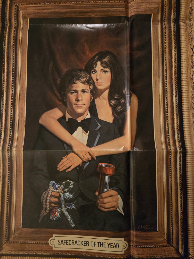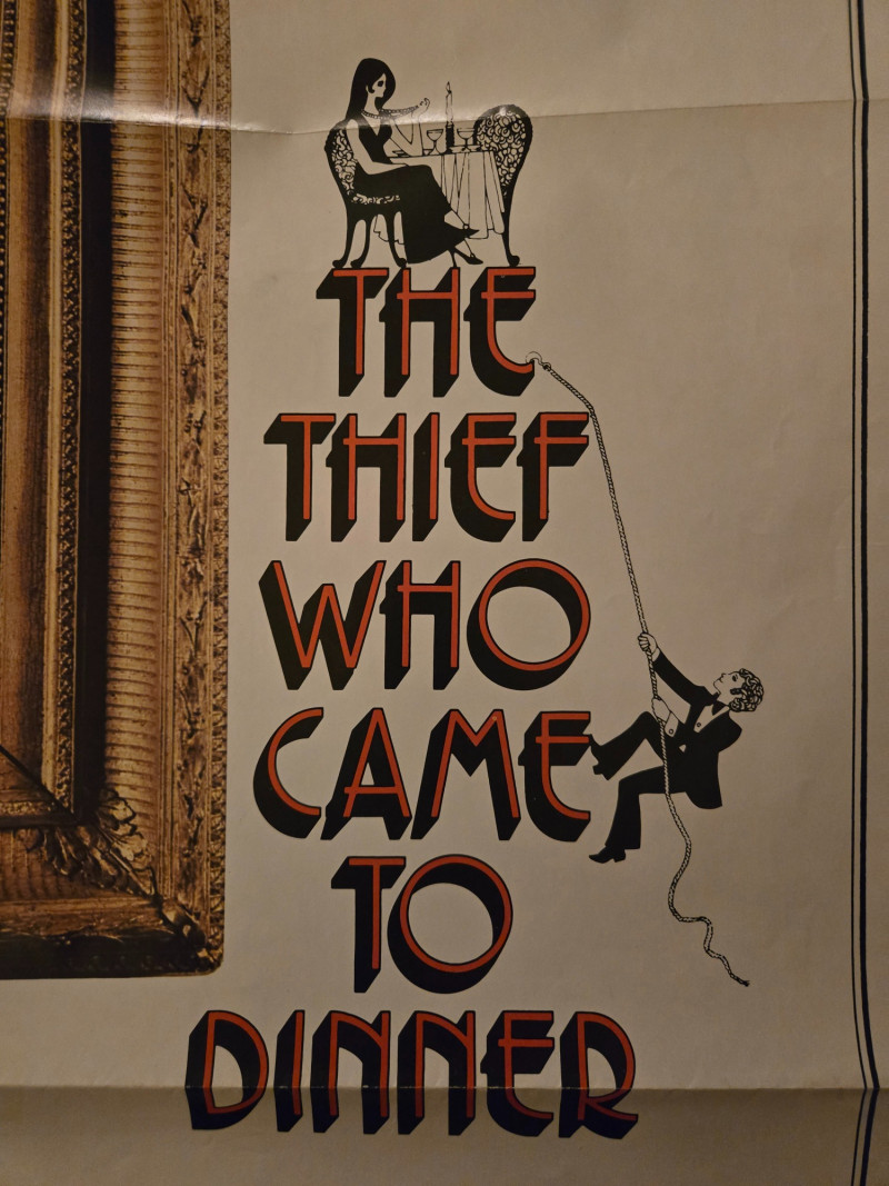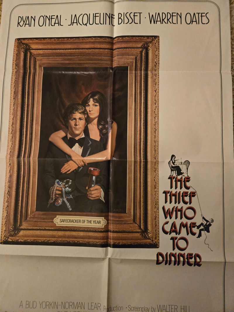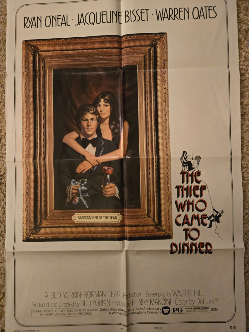 The Thief Who Came to Dinner is a stylish slice of 1970s cinematic flair. Title: The Thief Who Came to Dinner Release Year: 1973 Starring: Ryan O'Neal, Jacqueline Bisset, Warren Oates Directed by: Bud Yorkin Screenplay by: Walter Hill Music by: Henry Mancini Studio: Warner Bros. The central image features Ryan O'Neal in a tuxedo, holding a flashlight and stolen jewelry, with Jacqueline Bisset embracing him—suggesting charm and intrigue. The plaque reading “SAFECRACKER OF THE YEAR” adds a playful, ironic twist to the criminal theme. A stylized figure rappelling down a rope reinforces the heist motif. The poster celebrates Warner Bros.' 50th anniversary, adding historical significance. The film blends romantic comedy with crime caper, following a computer programmer who turns jewel thief and navigates high society with wit and charm. The poster’s elegant yet cheeky design reflects the film’s tone—lighthearted, clever, and stylish.About the Film