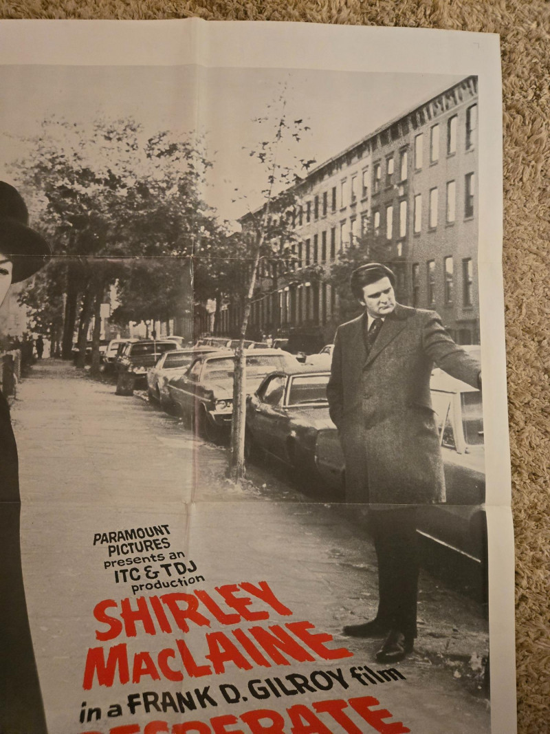 This vintage poster for Desperate Characters is a moody and evocative piece of early 1970s cinema marketing, ideal for collectors who appreciate literary adaptations and award-winning performances. Title: Desperate Characters Year: 1971 Studio: Paramount Pictures Rating: Restricted (Under 17 requires accompanying parent or adult guardian) Poster Serial: 7/4327 Format: Color by TVC Starring: Shirley MacLaine (Winner of Best Actress, 1971 Berlin Film Festival), Kenneth Mars, Gerald O’Loughlin as “Charlie,” Sada Thompson, Jack Somack Directed, Written, and Produced by: Frank D. Gilroy Based on the novel by: Paula Fox Co-Producer: Paul Leaf Visual Composition: Black-and-white photograph of two figures on a gritty urban sidewalk, framed by parked cars and brownstones. Shirley MacLaine stands in a dark coat and hat, exuding quiet tension; the man beside her interacts with a car, adding a sense of motion and unease. Typography: Red and black text overlays the image, emphasizing the film’s stark emotional tone. Mood: Urban isolation, emotional disconnection, and existential dread—mirroring the film’s themes. Poster Overview