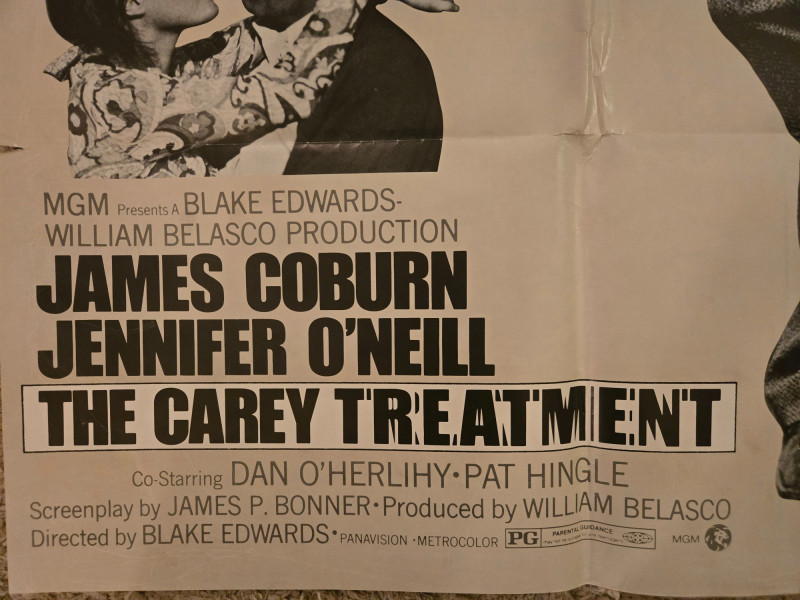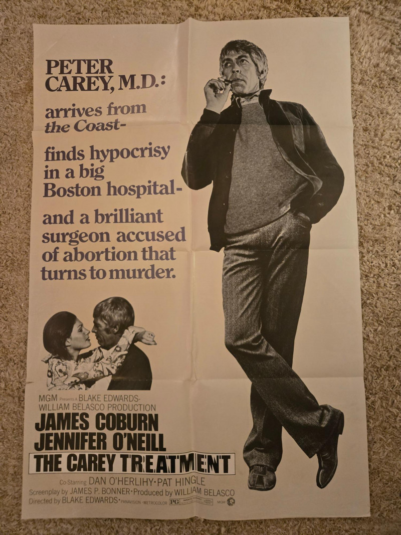 This vintage poster for The Carey Treatment—featuring James Coburn as Peter Carey, M.D.—is a sleek and suspenseful piece of 1970s medical thriller marketing. Title: The Carey Treatment Year: 1972 Studio: MGM Rating: PG Format: Panavision, Metrocolor Design Style: Stark and dramatic with photographic realism Directed by: Blake Edwards Produced by: William Belasco Screenplay: James P. Bonner Starring: James Coburn, Jennifer O’Neill, Dan O’Herlihy, Pat Hingle Main Imagery: A large black-and-white photo of James Coburn as Dr. Peter Carey, pipe in mouth, exuding confidence and defiance. A smaller inset image of a man and woman in an intimate embrace, hinting at romantic and emotional subplots. Color Palette: Muted beige background with bold black text, emphasizing seriousness and tension. Narrative Tease: “Peter Carey, M.D.: arrives from the Coast—finds hypocrisy in a big Boston hospital—and a brilliant surgeon accused of abortion that turns to murder.” This tagline sets the tone for a layered mystery with ethical stakes.Poster Overview