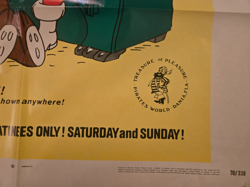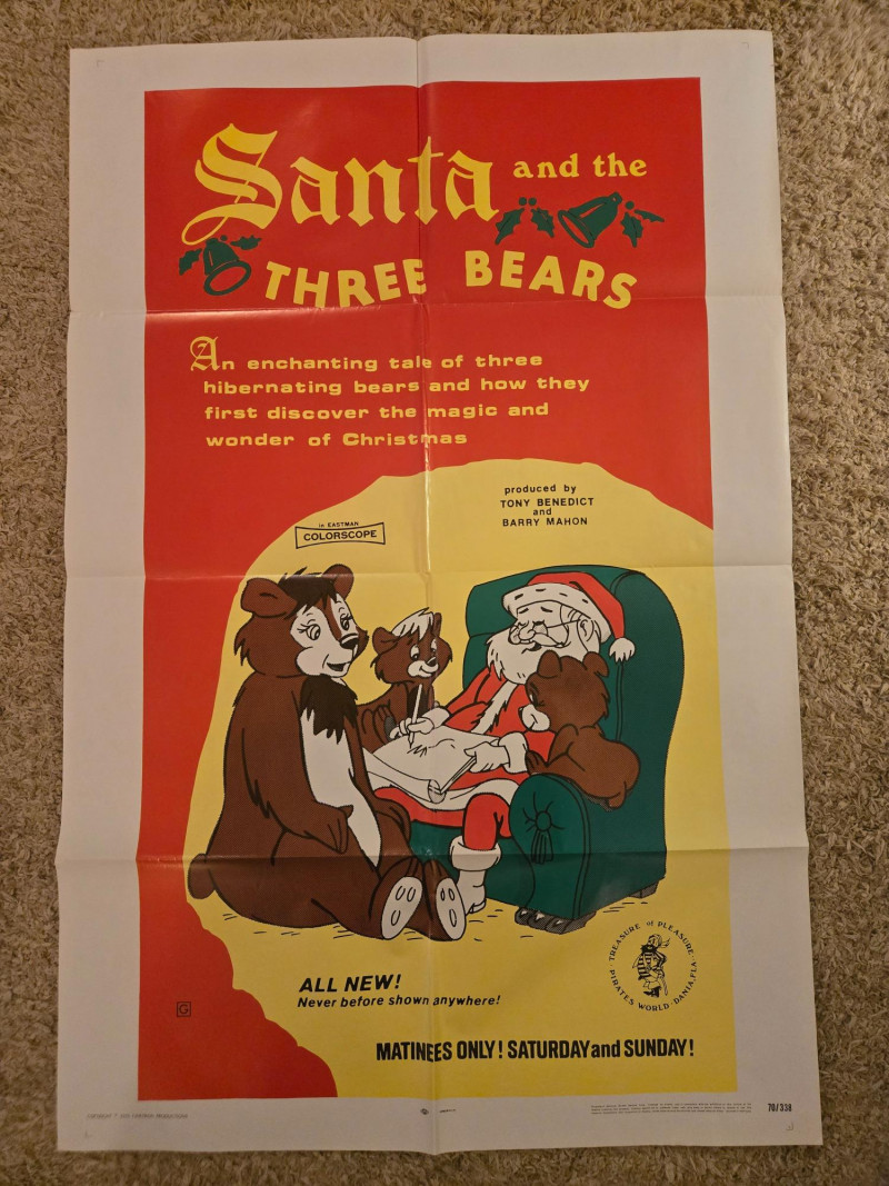 This vintage poster for Santa and the Three Bears is a charming piece of holiday nostalgia, perfect for collectors of animated classics or seasonal memorabilia. Title: Santa and the Three Bears Era: Likely late 1960s to early 1970s Production: Pleasant Productions World Distribution Color Format: Eastman Colorscope Poster Serial: 70/384 Exhibition Note: “ALL NEW! Never before shown anywhere! MATINEES ONLY! SATURDAY and SUNDAY!” Produced by: Tony Benedict and Barry Mahon Genre: Animated holiday feature Plot Tease: “An enchanting tale of three hibernating bears and how they first discover the magic and wonder of Christmas” Visual Composition: Santa Claus seated in a green armchair, warmly engaging with three animated bears — two cubs and one adult. Festive red and yellow background with holly decorations framing the scene. Typography: Bold, playful fonts emphasizing the title and promotional excitement. Mood: Wholesome, cheerful, and family-friendly — ideal for matinee audiences and holiday programming.Poster Overview