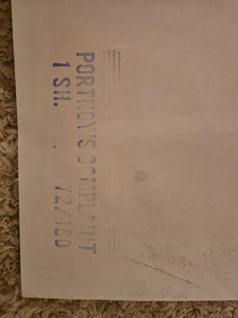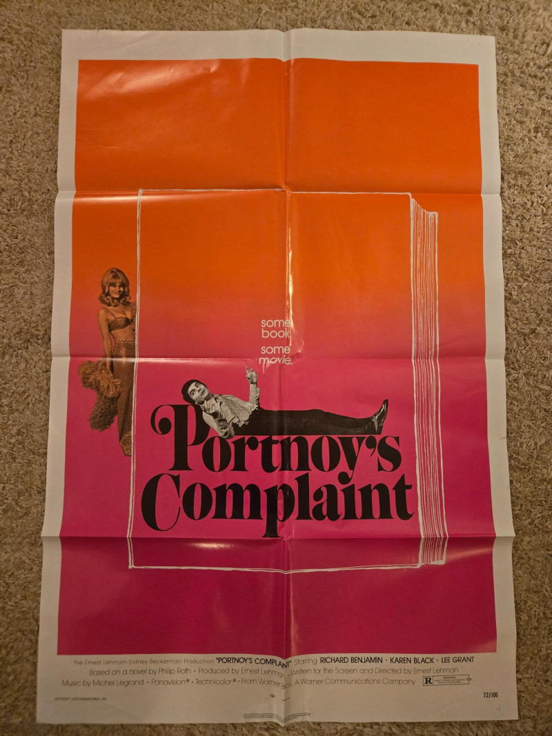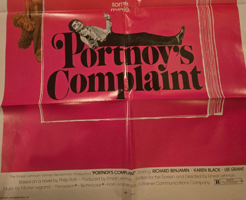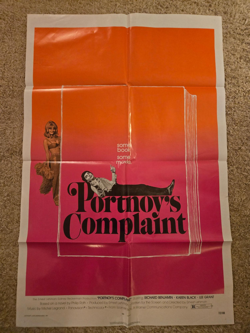 This vintage movie poster for Portnoy's Complaint is a striking piece of 1970s film marketing that blends literary prestige with provocative visual flair. Here's a breakdown to help you present or list it effectively: Title: Portnoy's Complaint Year: 1972 Production: Ernest Lehman–Sidney Beckerman Studio: Warner Bros. Rating: R Poster Serial: 72/100 Based on the novel by: Philip Roth Starring: Richard Benjamin, Karen Black, Lee Grant Directed & Written by: Ernest Lehman Music by: Michel Legrand Format: Panavision®, Technicolor® Color Gradient: Bold orange-to-pink background evokes 1970s pop-art sensibilities. Typography: Large, black, book-style title font with white page-like accents on the right edge. Imagery: A reclining man sprawled across the title, suggesting the film’s introspective and sexual themes. A stylized woman in a revealing outfit, nodding to the novel’s controversial content. Tagline: “some book. some movie.” — a minimalist yet cheeky nod to Roth’s literary fame. Poster Overview