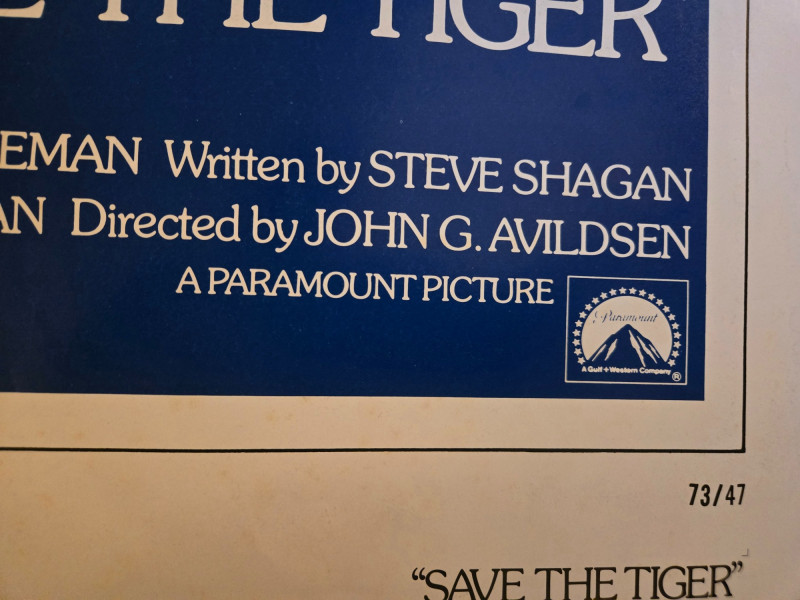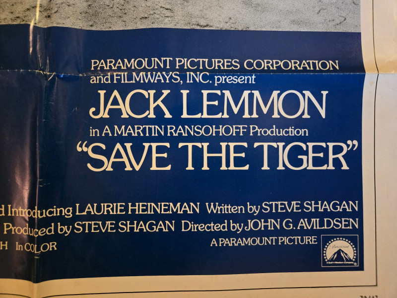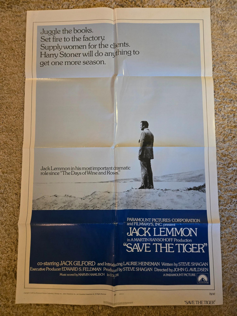 This poster for Save the Tiger is a stark and emotionally resonant piece of 1970s cinema marketing, showcasing Jack Lemmon in one of his most critically acclaimed dramatic roles. Title: Save the Tiger Year: 1973 Studio: Paramount Pictures / Filmways, Inc. Rating: R Poster Serial: 73/47 Format: Color Starring: Jack Lemmon, Jack Gilford, Laurie Heineman Directed by: John G. Avildsen Written & Produced by: Steve Shagan Executive Producer: Edward S. Feldman Music: Marvin Hamlisch Visual Composition: A solitary figure—Jack Lemmon as Harry Stoner—stands on a barren landscape, gazing into the distance, evoking isolation and moral conflict. Tagline & Text: “Juggle the books. Set fire to the factory. Supply women for the clients. Harry Stoner will do anything to get one more season.” “Jack Lemmon in his most important dramatic role since The Days of Wine and Roses.” These lines frame the film’s themes of desperation, ethical compromise, and the cost of survival. Typography: Clean, bold fonts with a subdued palette that mirrors the film’s somber tone. Poster Overview