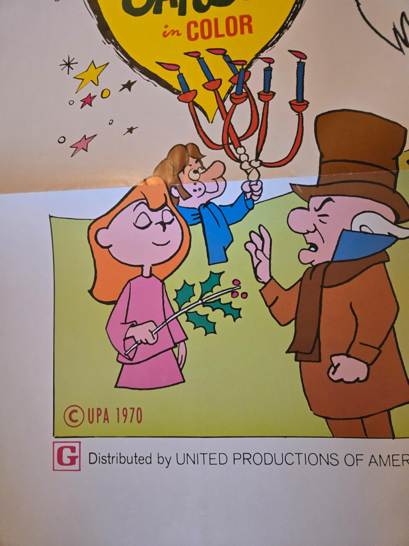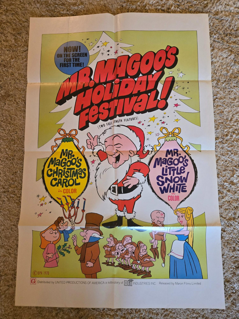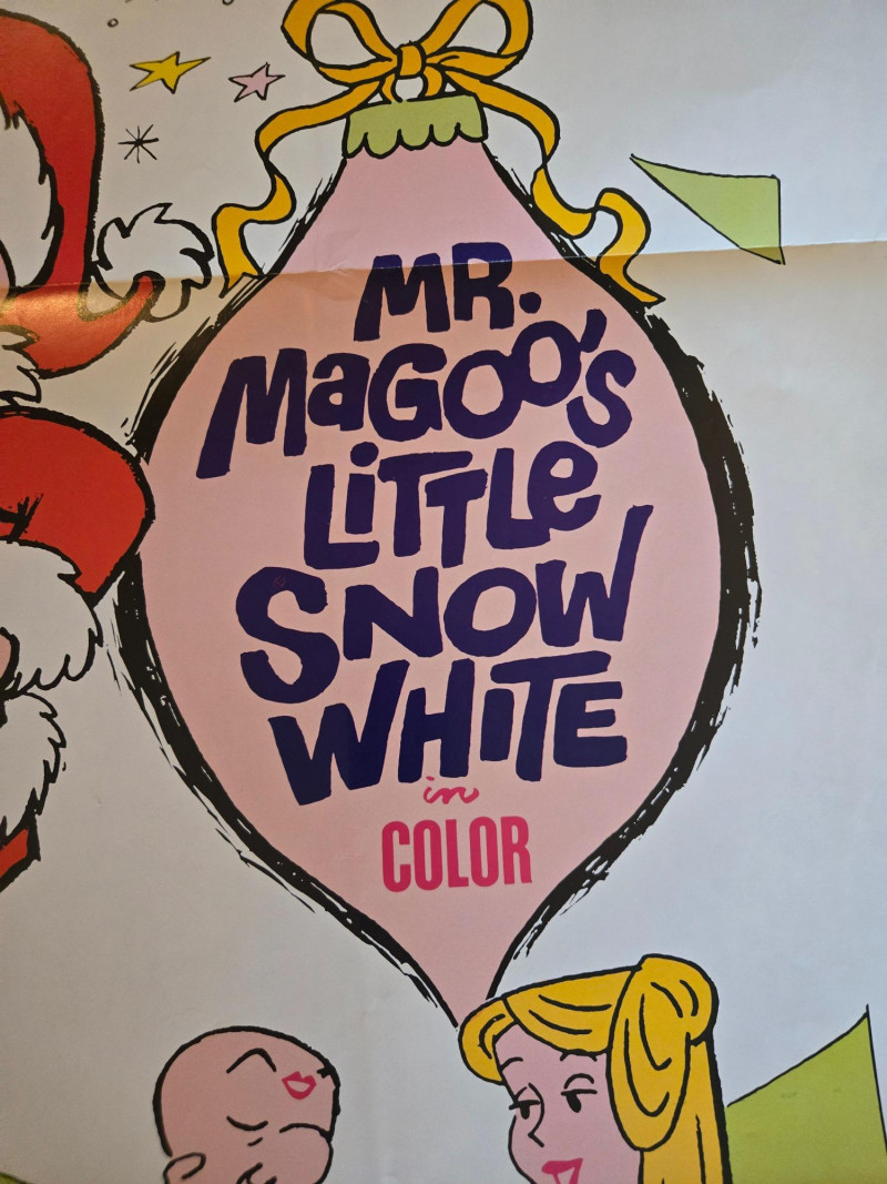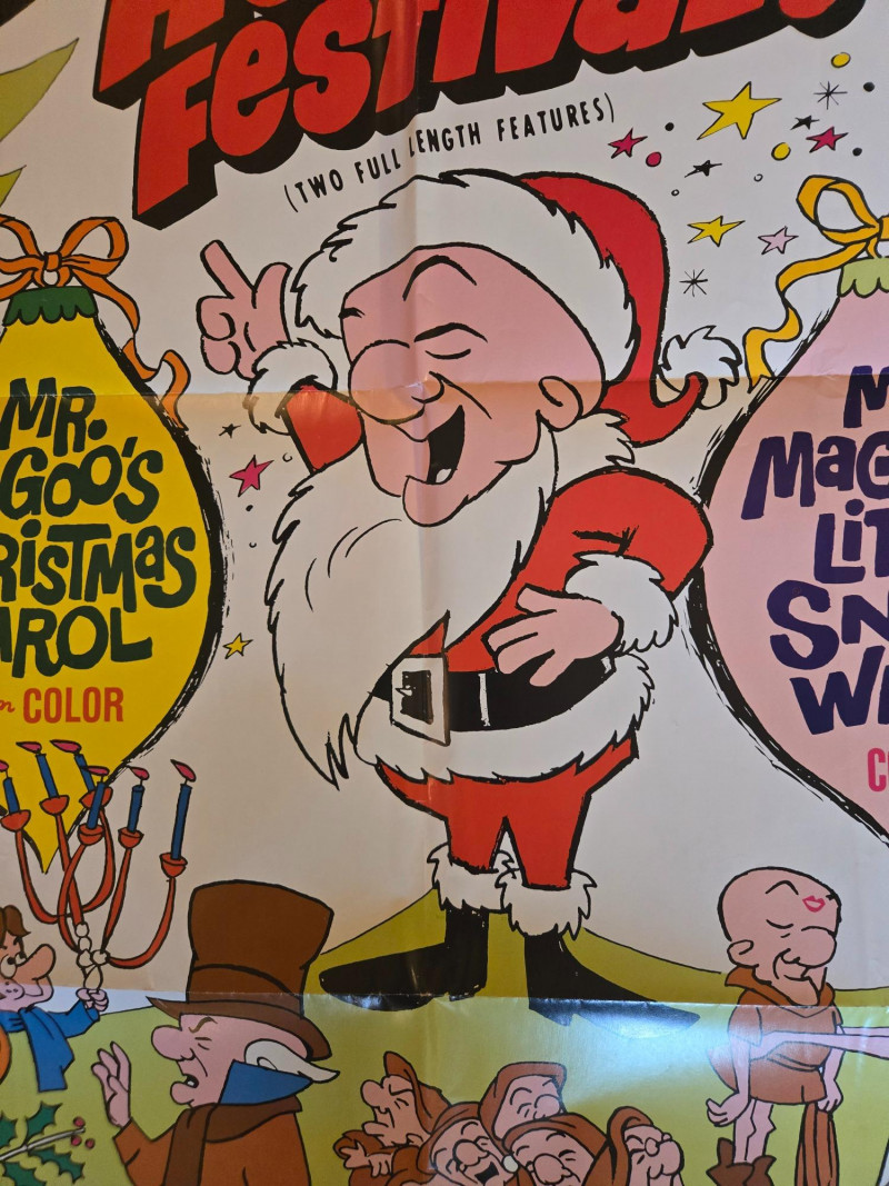 This festive poster for Mr. Magoo’s Holiday Festival! is a vibrant celebration of classic animation, ideal for collectors who appreciate nostalgic holiday programming and UPA’s signature style. Title: Mr. Magoo’s Holiday Festival! Year: 1976 Studio: United Productions of America (UPA), released by Maron Films Limited Format: Color animation Copyright: © UPA 1976 This double-feature presentation includes two full-length animated specials: Mr. Magoo’s Christmas Carol (in color) Mr. Magoo’s Little Snow White (in color) Visual Composition: Central image of Mr. Magoo dressed as Santa Claus, surrounded by characters from both films. Left side: Yellow ornament frame featuring Christmas Carol characters, including a girl with a candle and a man in a top hat. Right side: Pink ornament frame showcasing Little Snow White with Snow White and several dwarfs. Background includes a decorated Christmas tree and festive elements. Tagline: “NOW! ON THE SCREEN FOR THE FIRST TIME!” — emphasizing theatrical debut. Mood: Whimsical, cheerful, and holiday-themed. Poster Overview