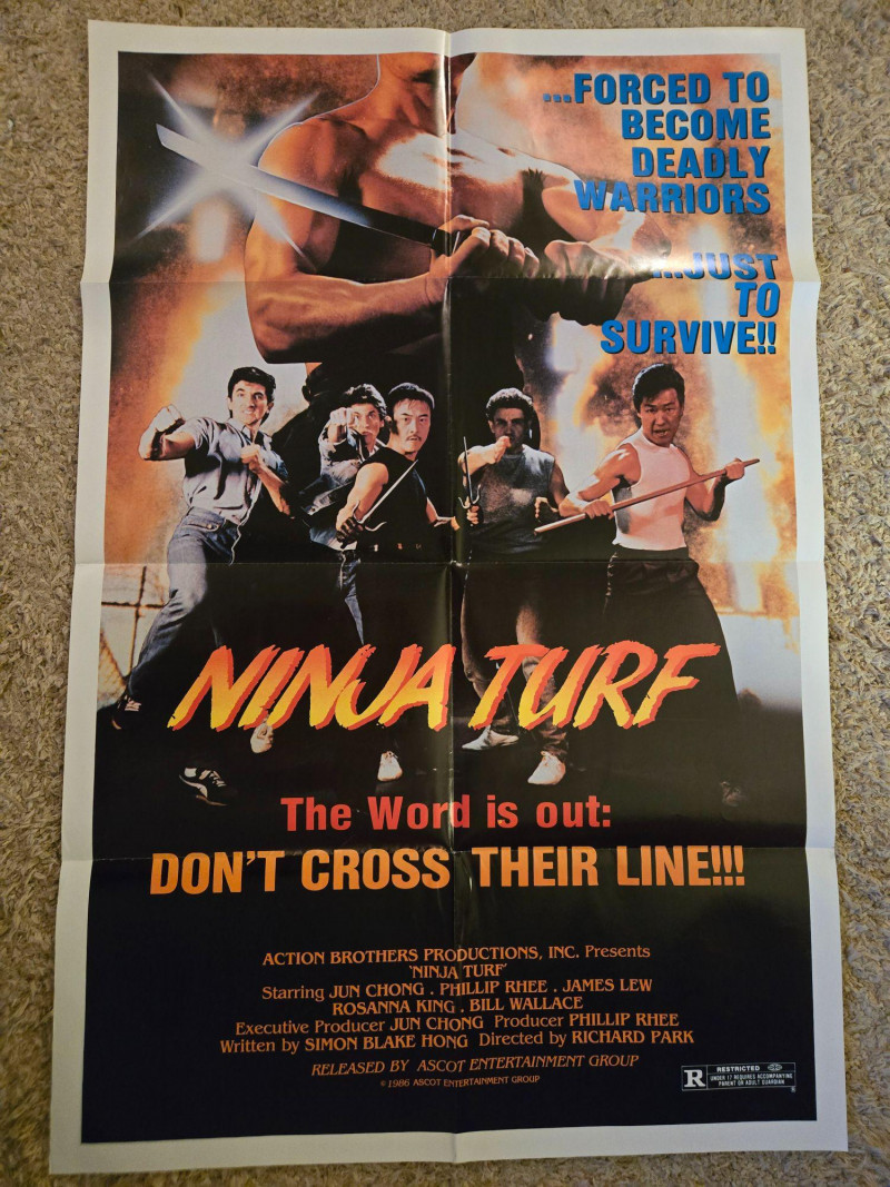 Original vintage poster for Ninja Turf, the 1986 martial arts cult classic starring Jun Chong and Phillip Rhee. Features a fiery backdrop and dynamic poses of the “Action Brothers” cast, with the tagline: “Forced to become deadly warriors just to survive!” A gritty slice of 80s action cinema with bold graphics and street-fighting energy. Year: 1986 Studio: Ascot Entertainment Group Rating: R Condition: Vintage; presumed folded or rolled – see photos
