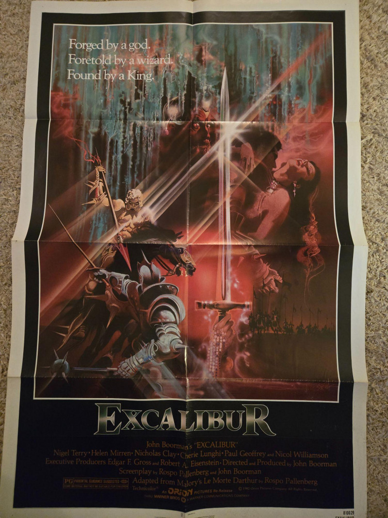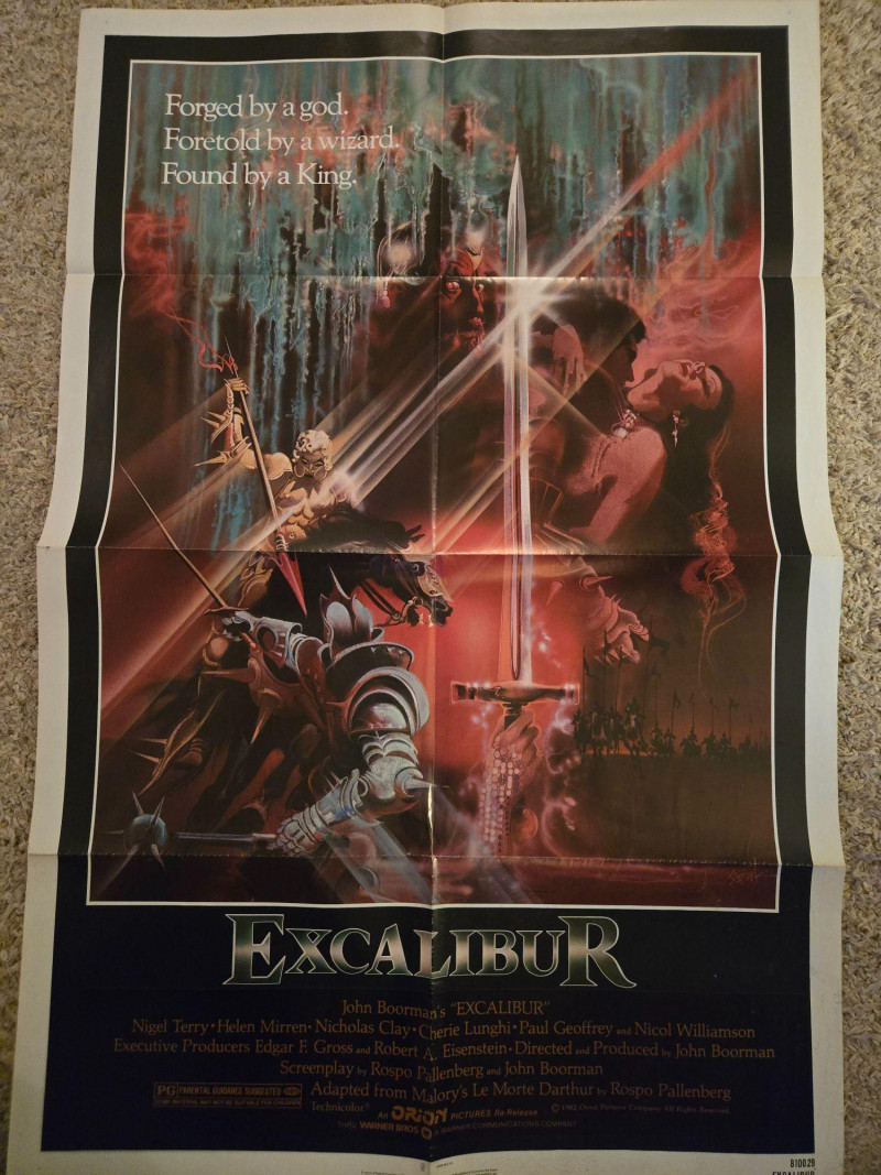 Original theatrical poster for Excalibur, John Boorman’s 1981 epic retelling of the Arthurian legend. Features a dramatic illustration of the enchanted sword held aloft, surrounded by mystical figures and radiant beams of light. Tagline reads: “Forged by a god. Foretold by a wizard. Found by a king.” Cast includes Helen Mirren, Nigel Terry, and Nicol Williamson. Year: 1981 Studio: Orion Pictures / Warner Bros. Condition: Vintage; presumed folded or rolled – see photos