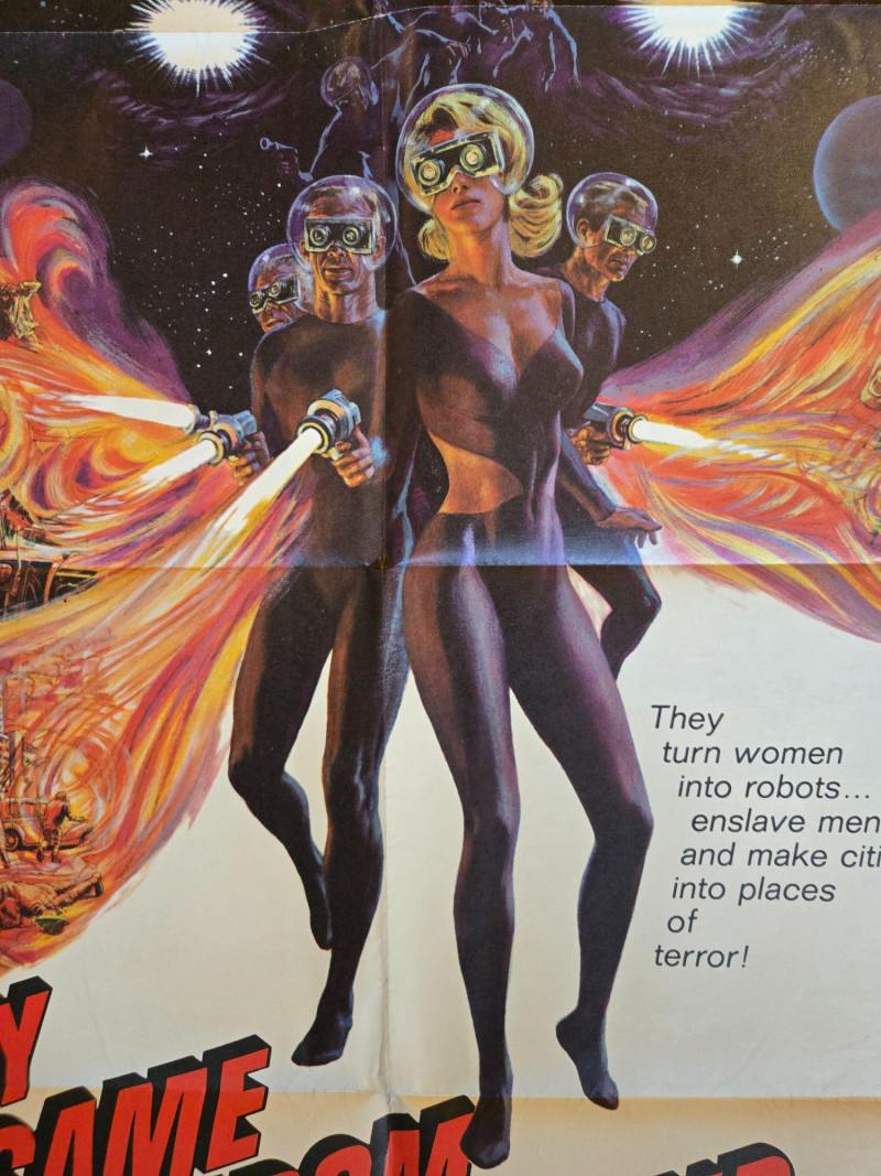 Artwork: Cosmic chaos with humanoid invaders in black suits and goggles Futuristic weapons emitting fiery energy beams Central female figure leading the charge from a dying world Scenes of destruction, control rooms, and fleeing civilians Taglines: “Conquerors from a dying world invade Earth!” “They turn women into robots... enslave men... and make cities into places of terror!” Visual Style: Mid-century pulp aesthetic with exaggerated drama Vibrant palette and stylized typography—perfect for framingThey Came from Beyond Space – Vintage Sci-Fi Movie Poster