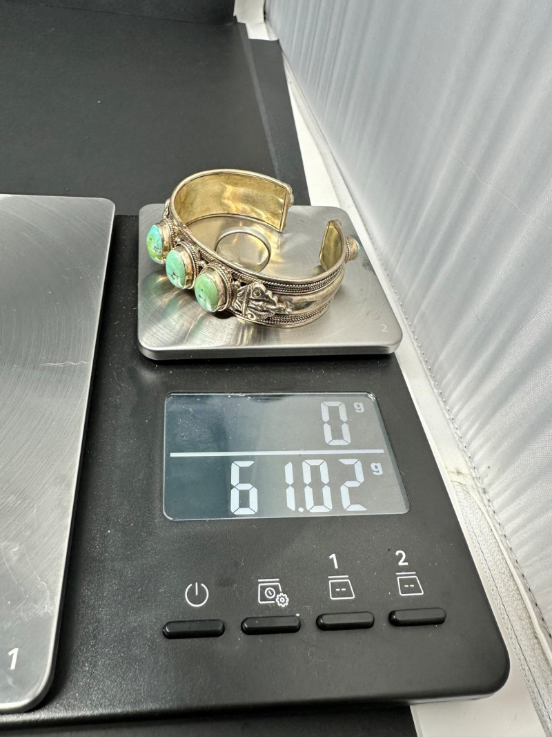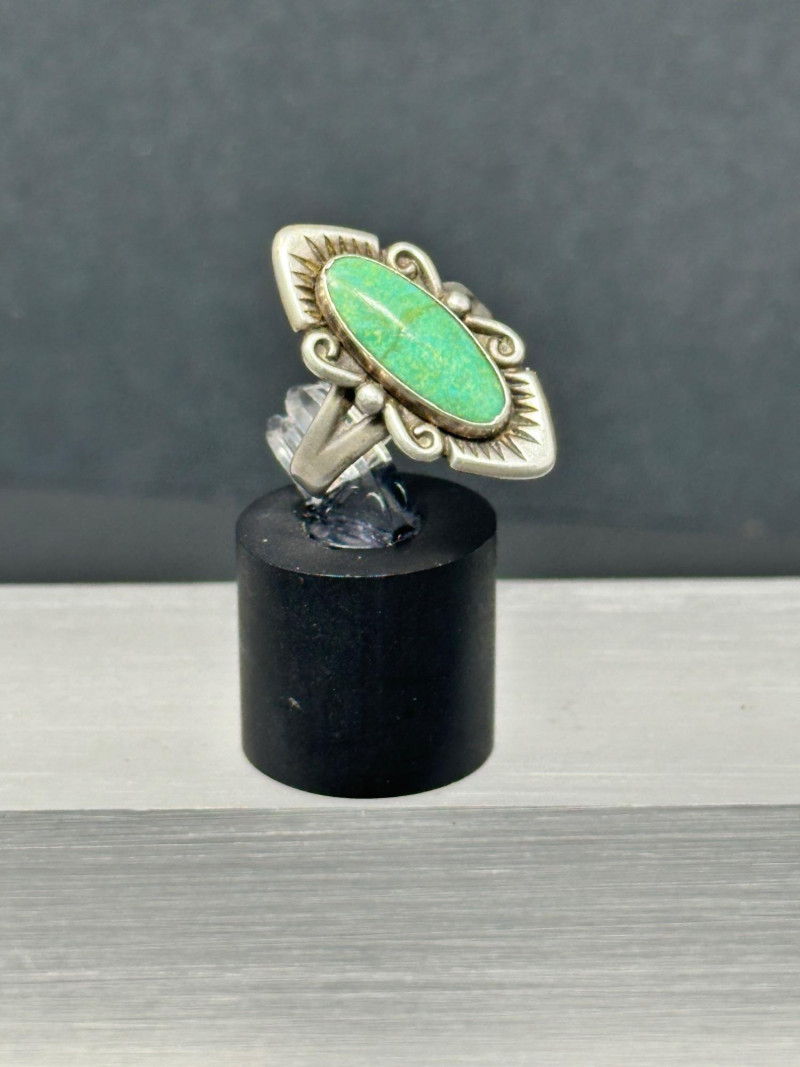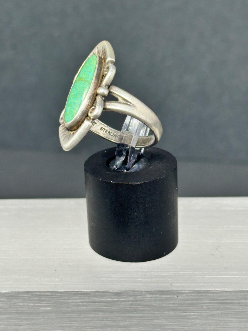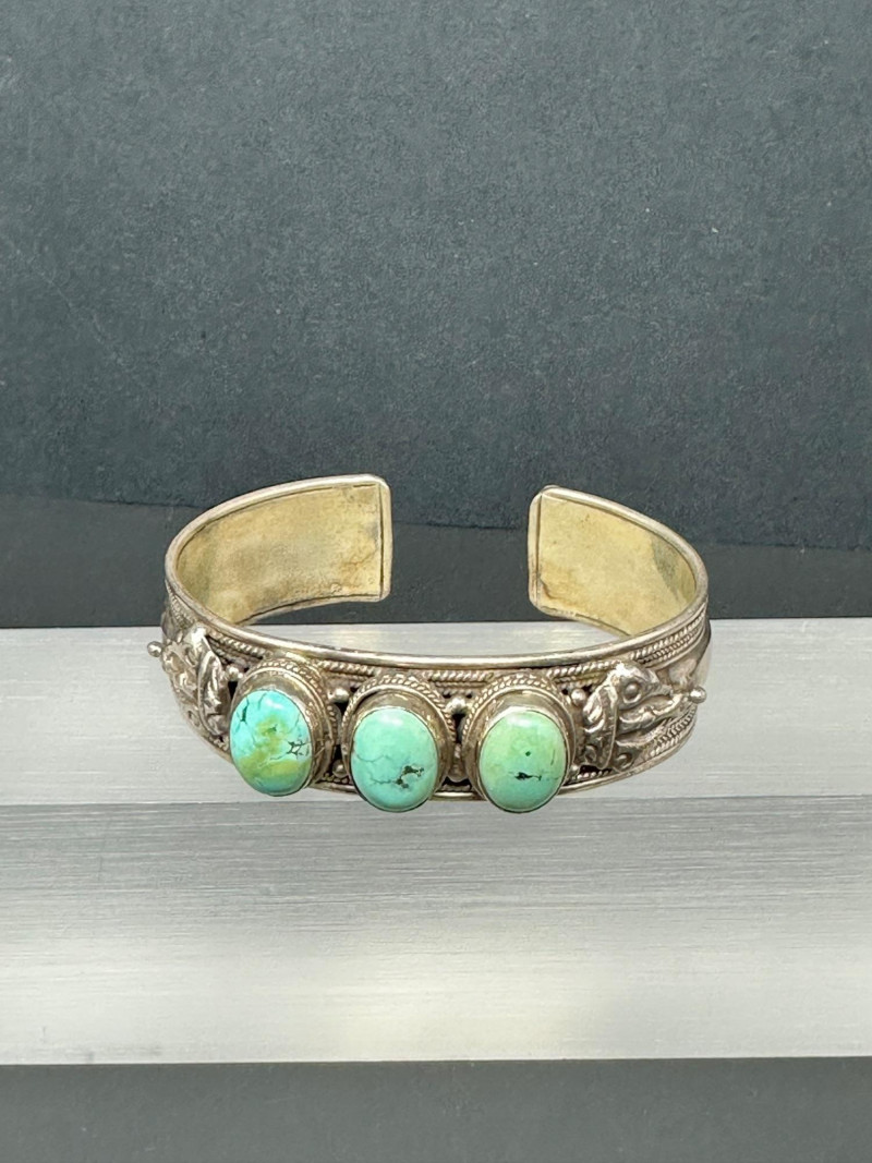 A classic Southwest-style pairing in sterling silver, featuring vibrant green turquoise stones: Sterling Cuff Bracelet: Adorned with three oval turquoise cabochons, each set in detailed silver bezels with decorative accents. The cuff’s craftsmanship highlights traditional Native American design elements. Sterling Turquoise Ring: Size 6 A single oval green turquoise stone sits in a scalloped bezel with silver embellishments, offering a bold yet balanced look.