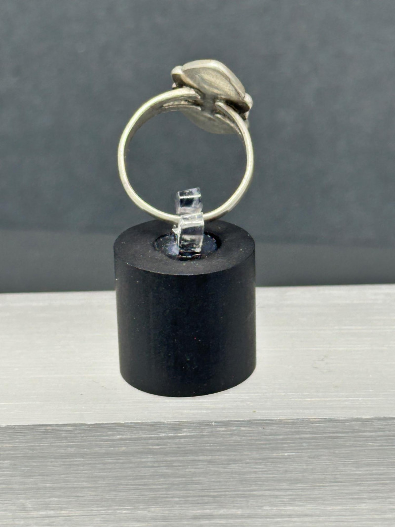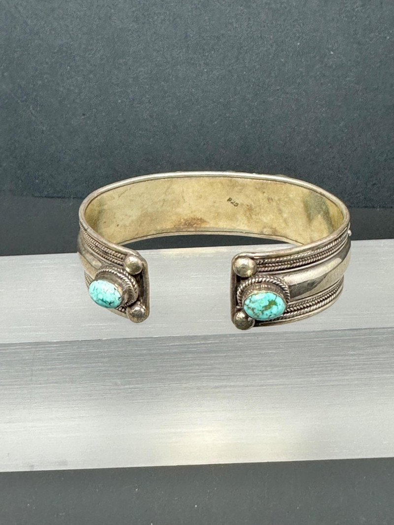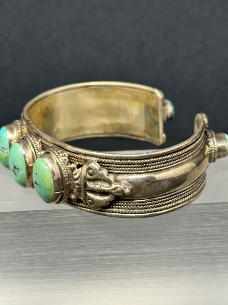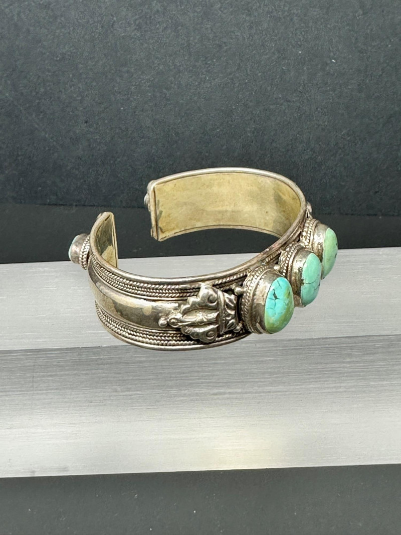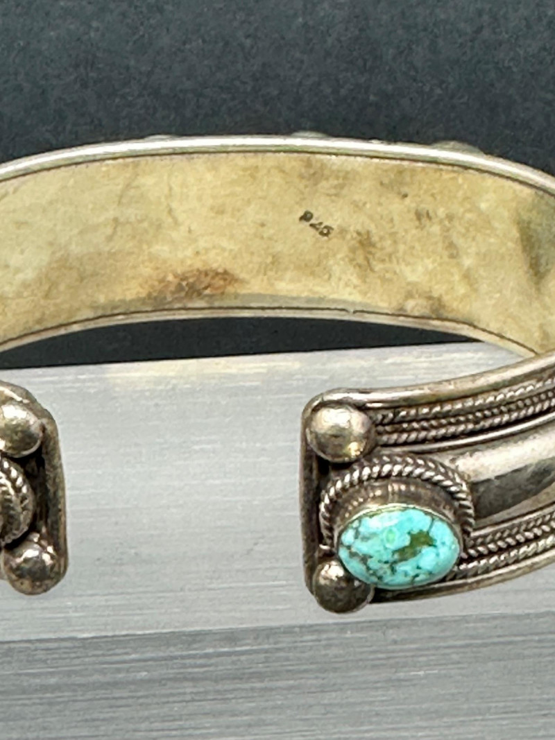 A classic Southwest-style pairing in sterling silver, featuring vibrant green turquoise stones: Sterling Cuff Bracelet: Adorned with three oval turquoise cabochons, each set in detailed silver bezels with decorative accents. The cuff’s craftsmanship highlights traditional Native American design elements. Sterling Turquoise Ring: Size 6 A single oval green turquoise stone sits in a scalloped bezel with silver embellishments, offering a bold yet balanced look.