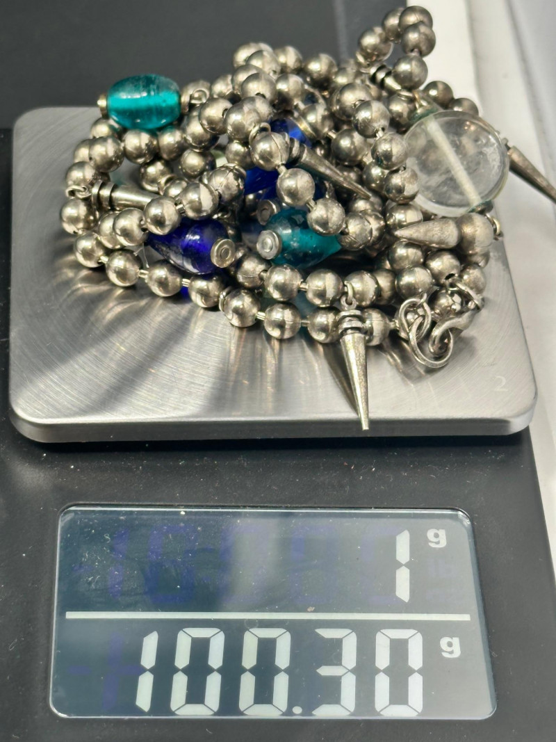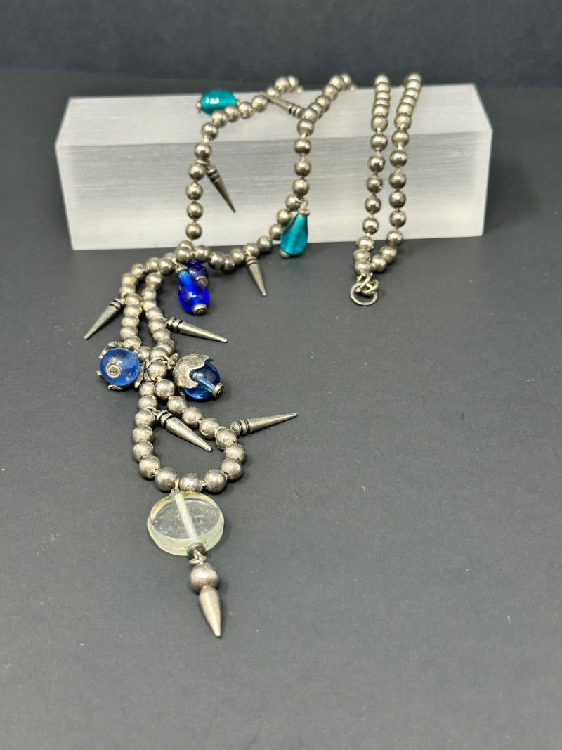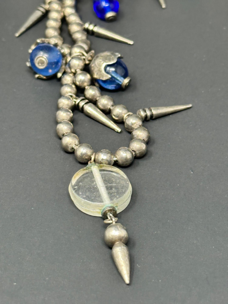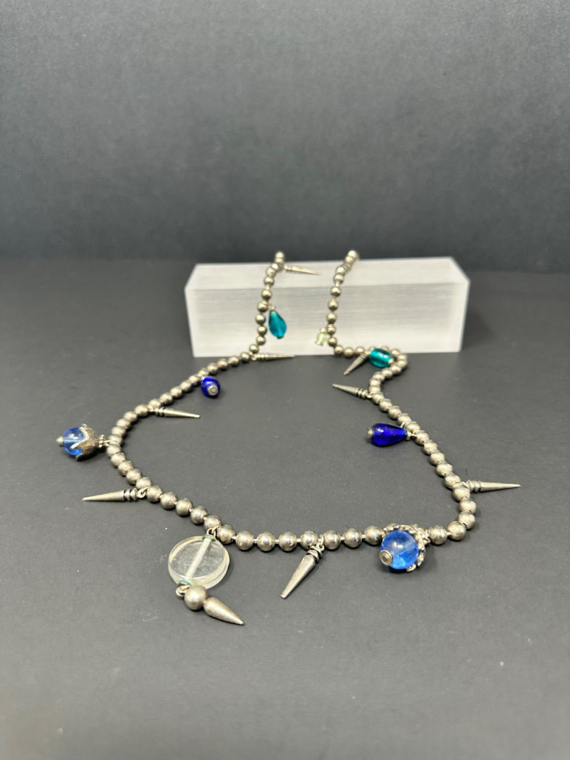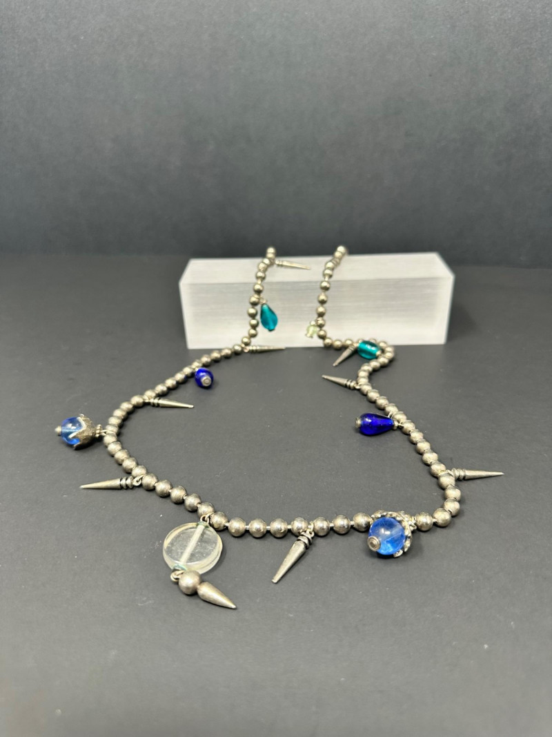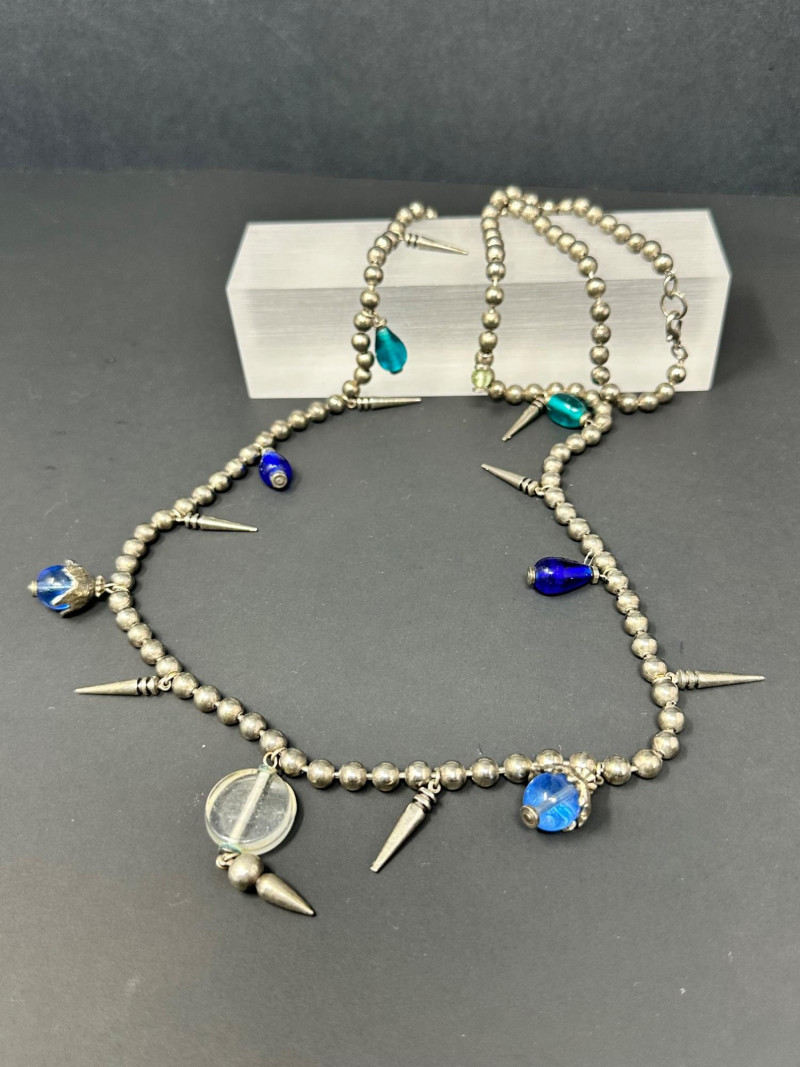 A bold artisan necklace crafted with sterling silver beads and eclectic decorative elements. The strand features alternating metallic spheres, teal and blue glass beads, and conical silver spikes. At its center hangs a circular pendant with a transparent core framed in a silver-toned bezel, adding a focal point of intrigue. The mix of textures and materials gives this piece a tribal-meets-modern aesthetic, ideal for statement wear or collection. Measures- 17" clasped