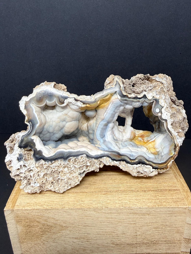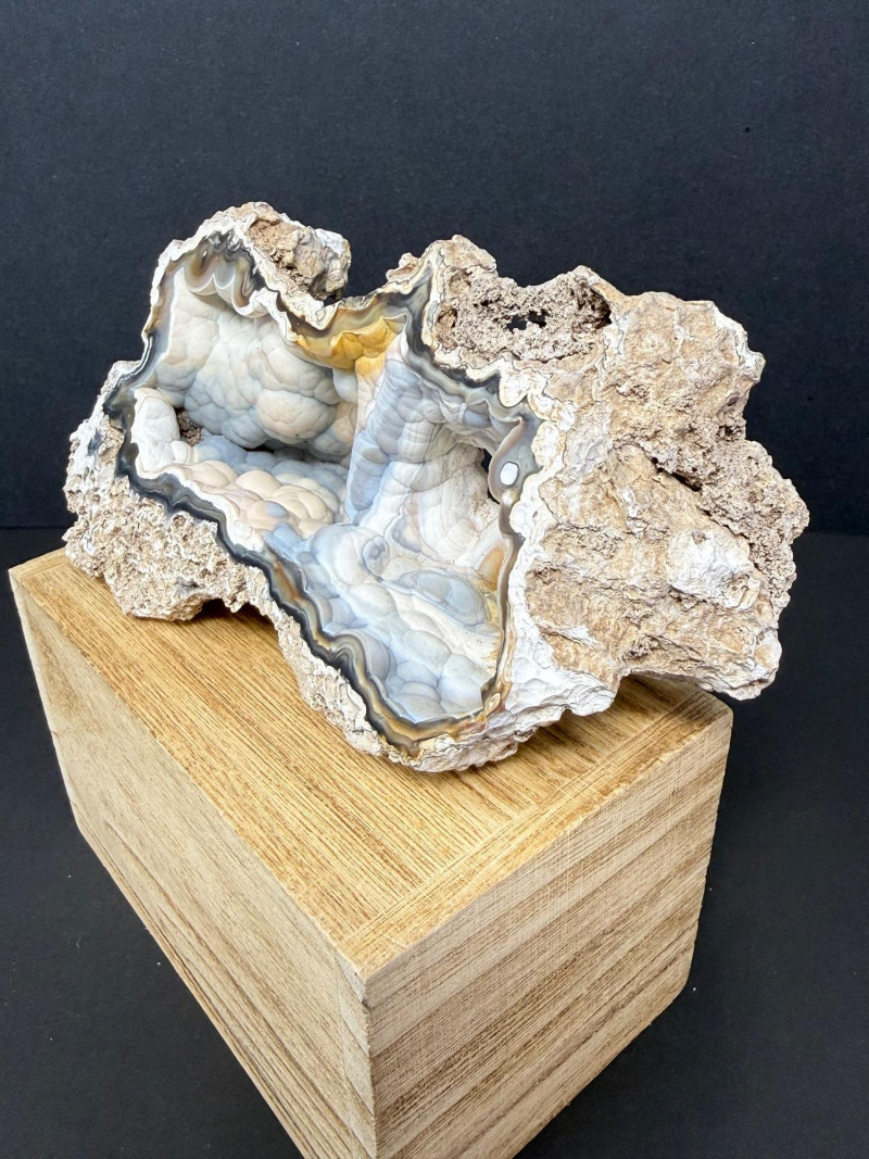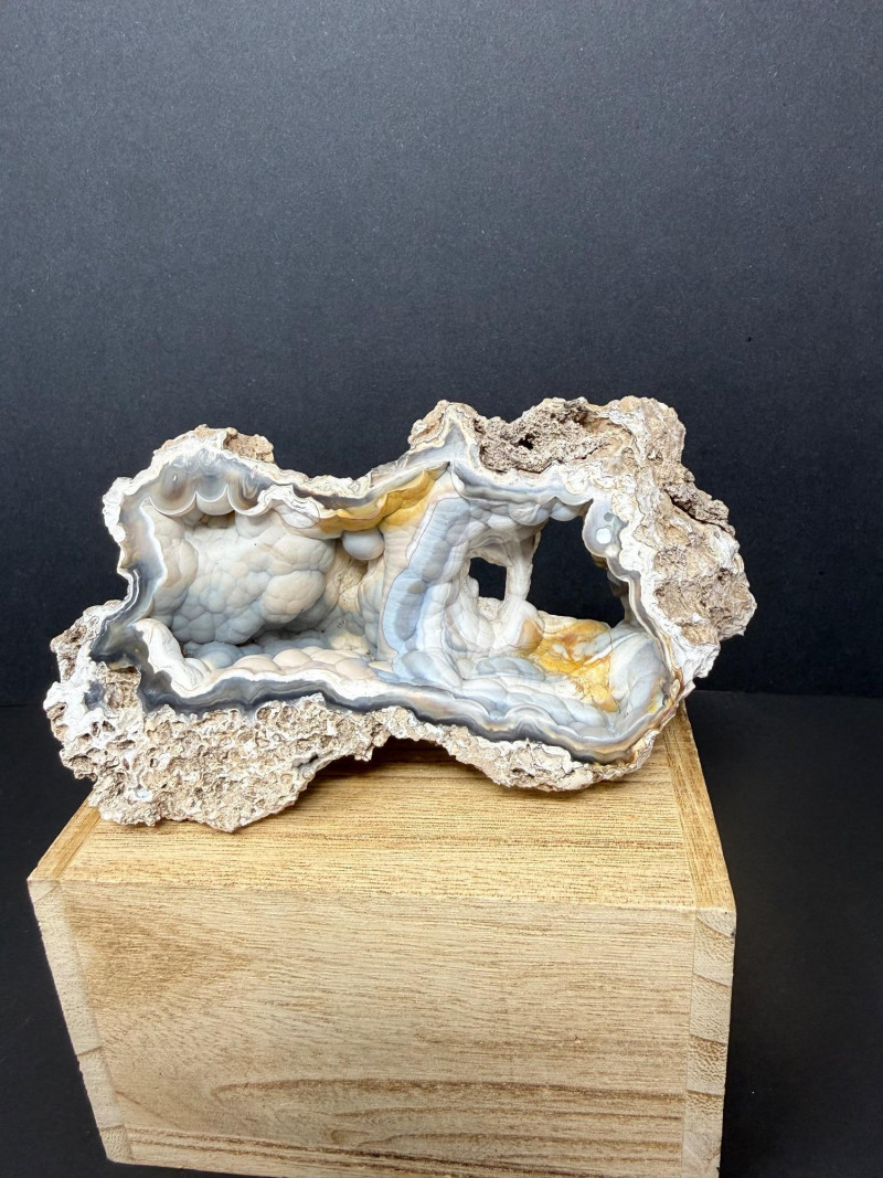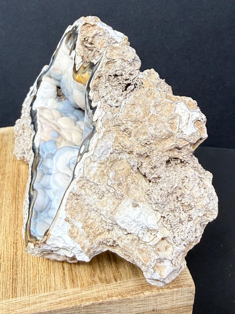 A polished cross‑section of an agatized coral shell, showing the original shell structure replaced by translucent blue and white silica. The interior displays smooth banding and natural cavity geometry, while the rough brown exterior preserves the original fossil shell form. A distinctive example of coral shell fossilization where agate fills and outlines the ancient marine structure. 6" W x 3" x 2.5" T Disclaimer: