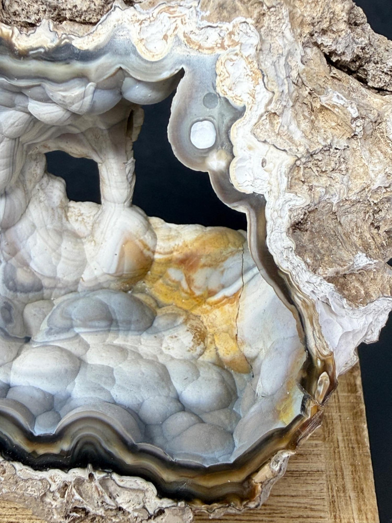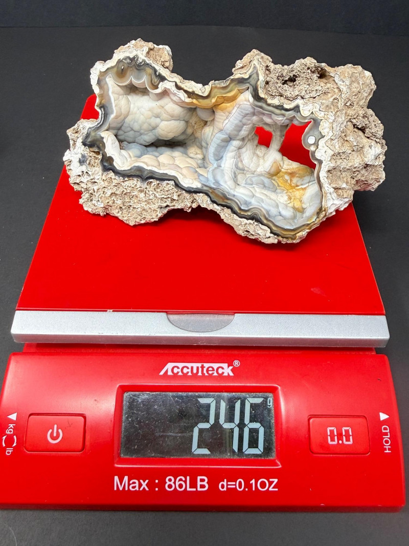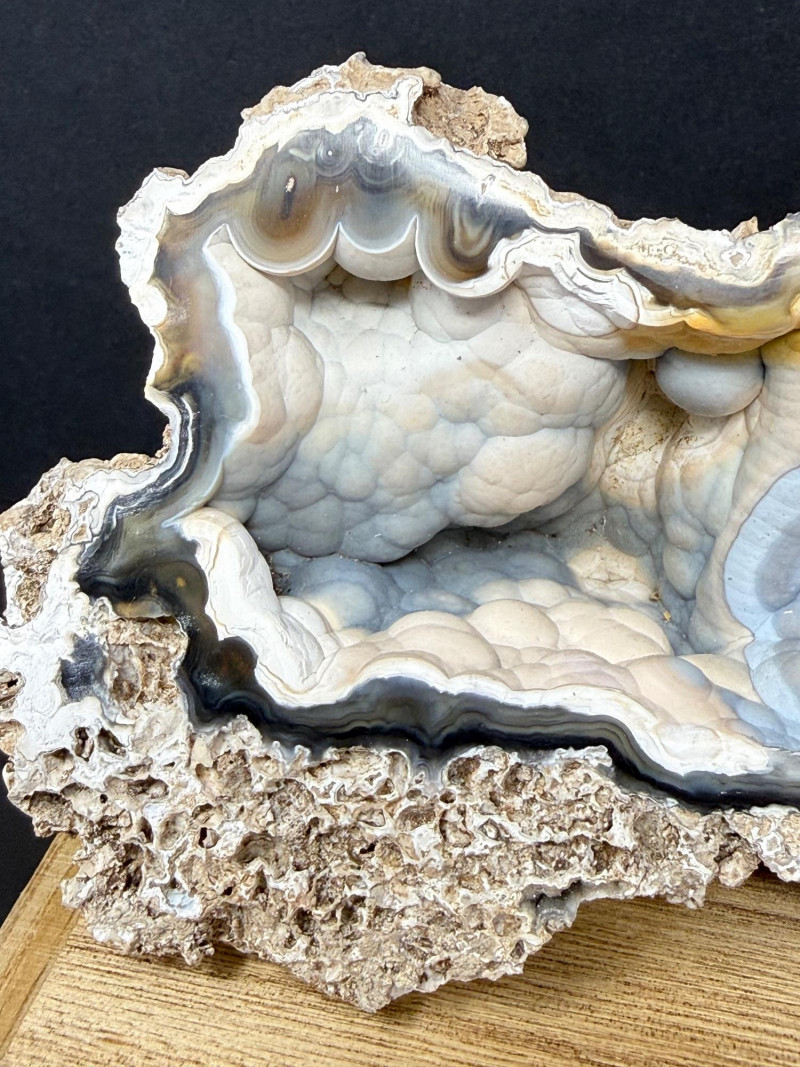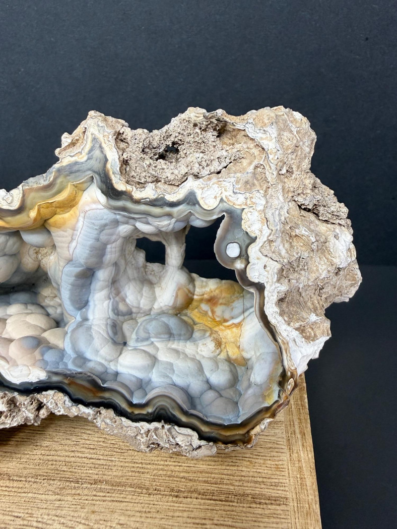 A polished cross‑section of an agatized coral shell, showing the original shell structure replaced by translucent blue and white silica. The interior displays smooth banding and natural cavity geometry, while the rough brown exterior preserves the original fossil shell form. A distinctive example of coral shell fossilization where agate fills and outlines the ancient marine structure. 6" W x 3" x 2.5" T Disclaimer: