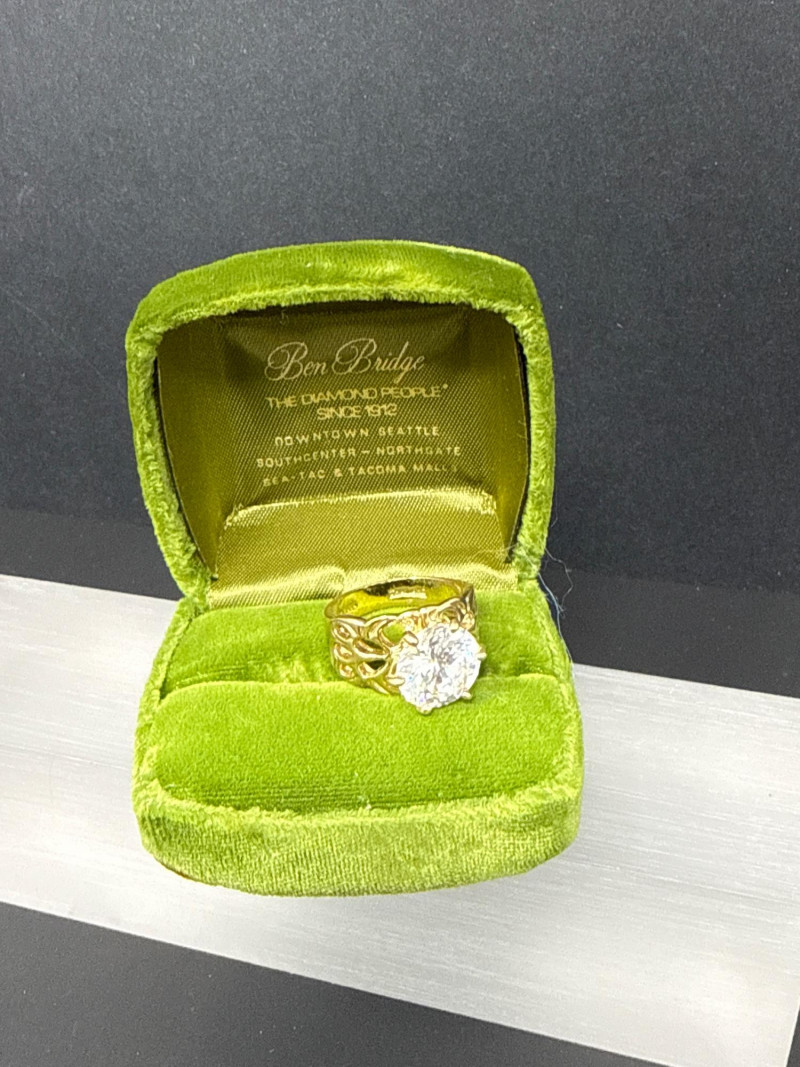 Ben Bridge Ring: Presented in a green velvet box, this sterling ring features a large clear faceted stone, branded by Ben Bridge — “The Diamond People” since 1912. Orange Oval-Cut Ring: A bold orange gemstone set in a sterling band with vintage-style detailing. Red Multi-Stone Ring: A central red stone flanked by three smaller stones on each side, offering a classic, balanced design. Yellow-Green Floral Ring: A light yellow-green gemstone set in a floral-inspired sterling mounting. Light Blue Oval Ring: A soft blue stone in an oval cut, set in a simple sterling band. Deep Red Rectangular Ring: Features a rich red rectangular-cut stone with small accent stones on either side. Light Purple Oval Ring: A gentle lavender-toned stone in a traditional sterling setting.