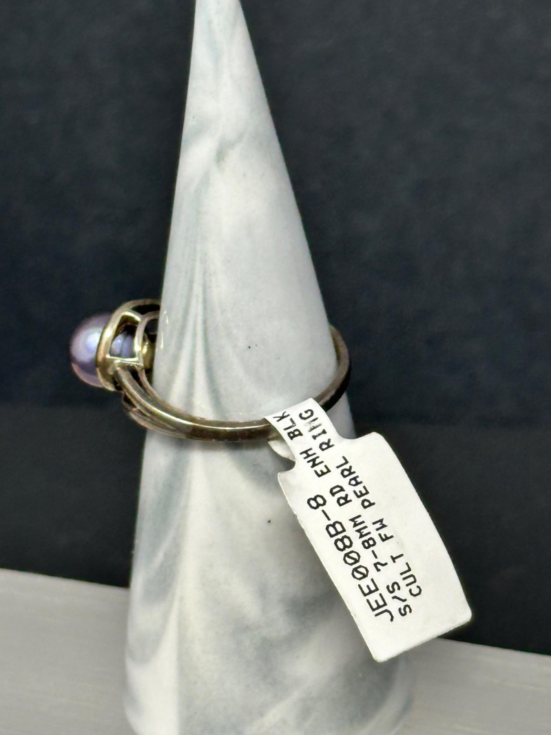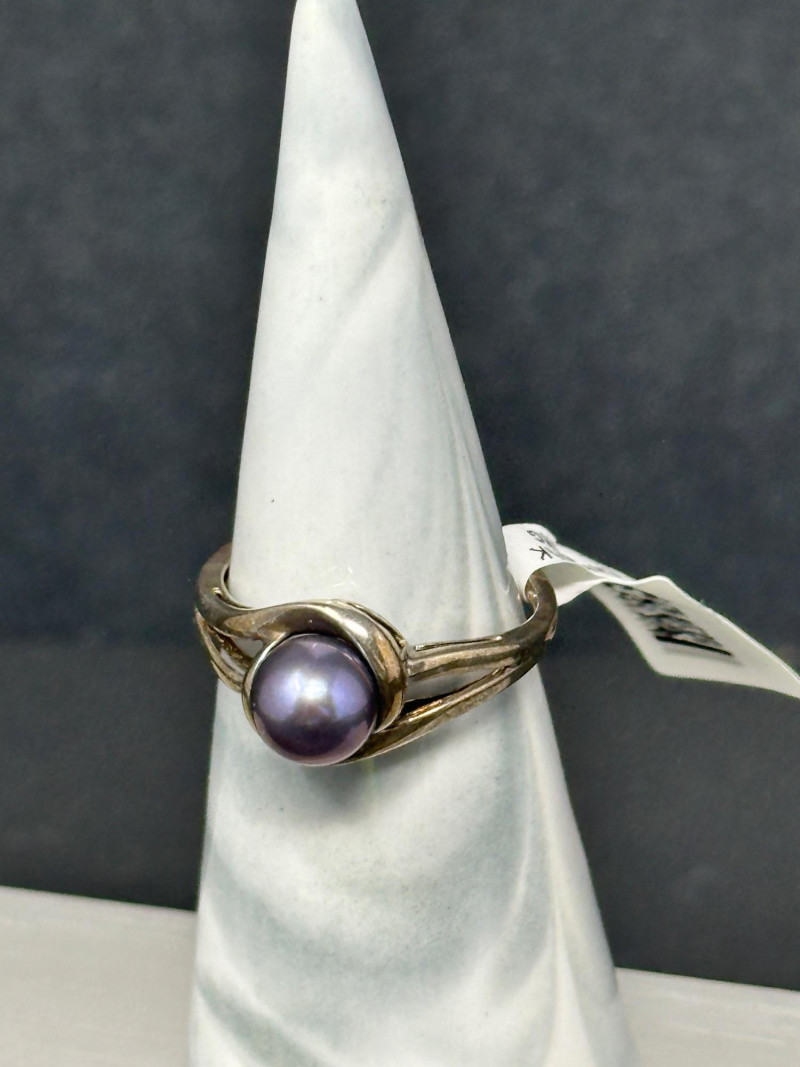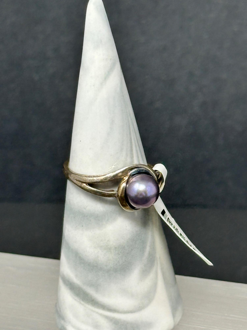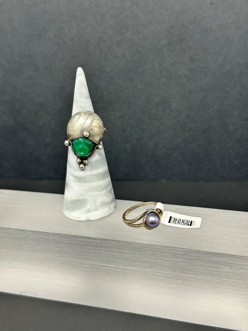 A pair of sterling silver rings showcasing bold design and elegant detail: Sterling Amethyst Dome Ring: Features a large etched silver dome with intricate patterning, set above a green amethyst cabochon framed by a cluster of silver beads. Sculptural and striking, this piece blends texture and color with artisan flair. 4.5 Sterling Cultured Pearl Ring: A minimalist sterling band set with a single 8MM cultured pearl in a soft purple hue. Understated and refined, ideal for everyday elegance or layering. 7"