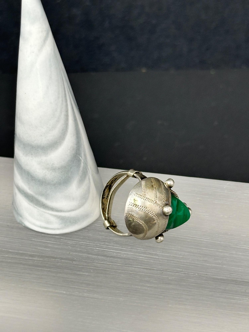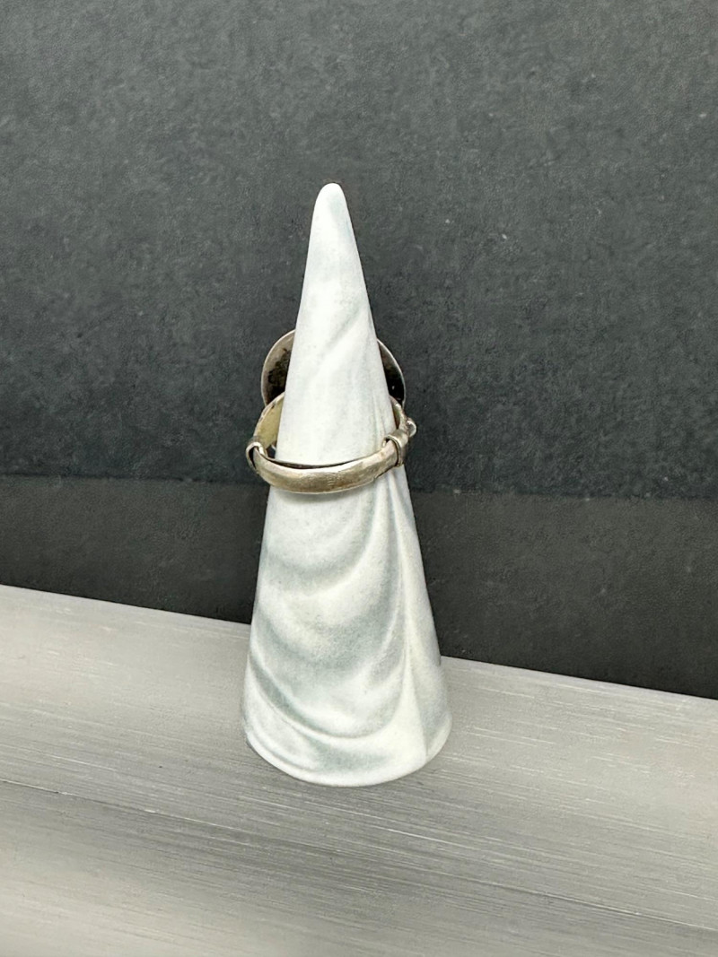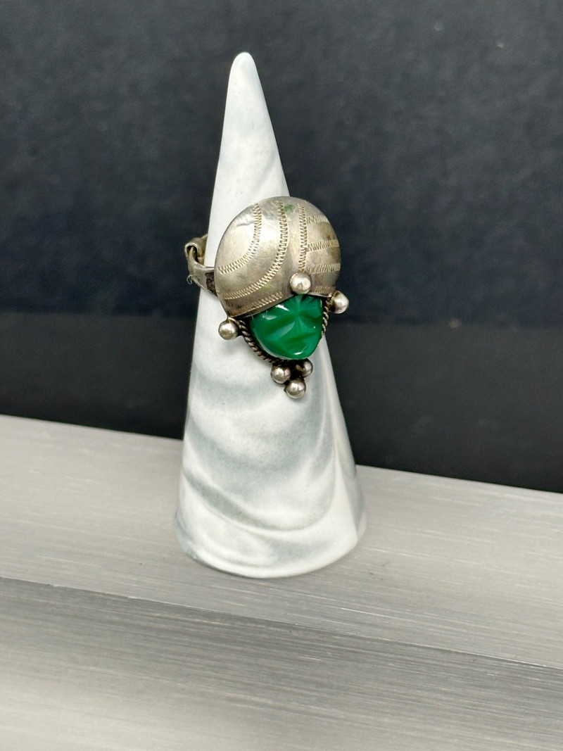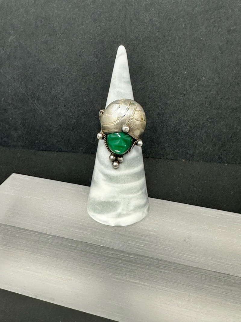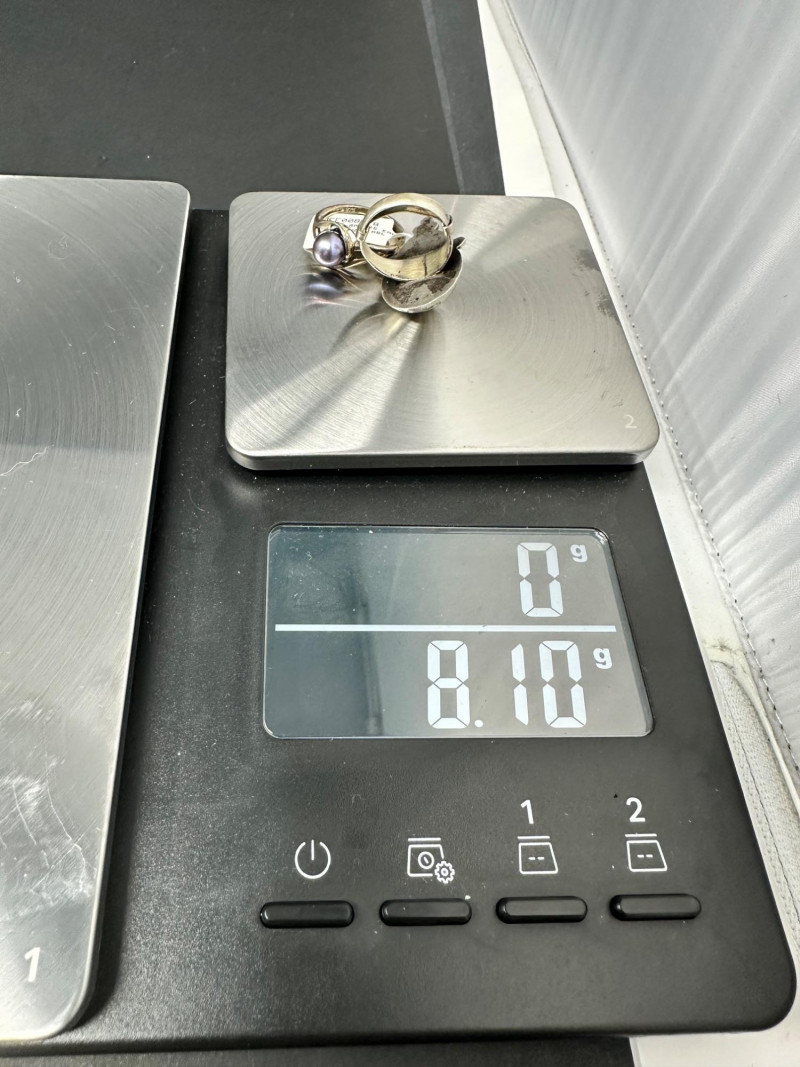 A pair of sterling silver rings showcasing bold design and elegant detail: Sterling Amethyst Dome Ring: Features a large etched silver dome with intricate patterning, set above a green amethyst cabochon framed by a cluster of silver beads. Sculptural and striking, this piece blends texture and color with artisan flair. 4.5 Sterling Cultured Pearl Ring: A minimalist sterling band set with a single 8MM cultured pearl in a soft purple hue. Understated and refined, ideal for everyday elegance or layering. 7"