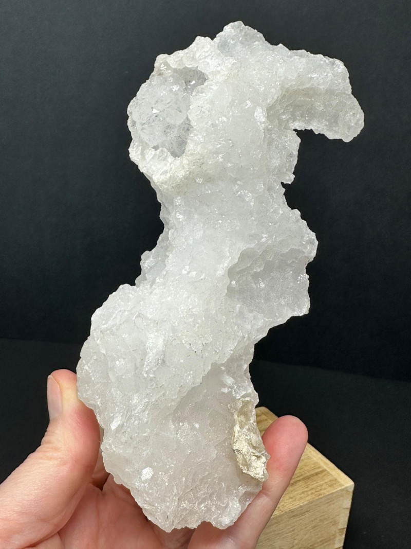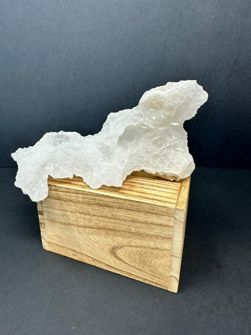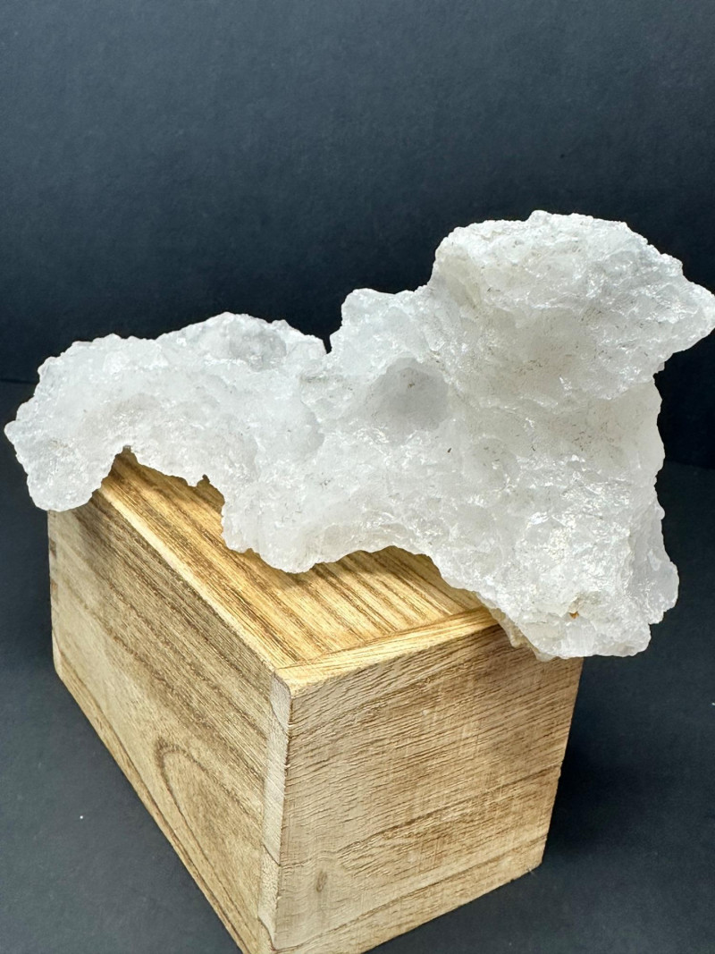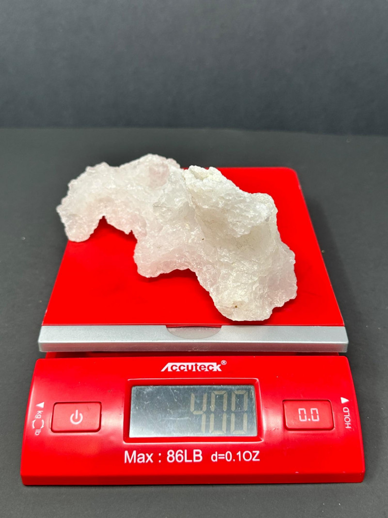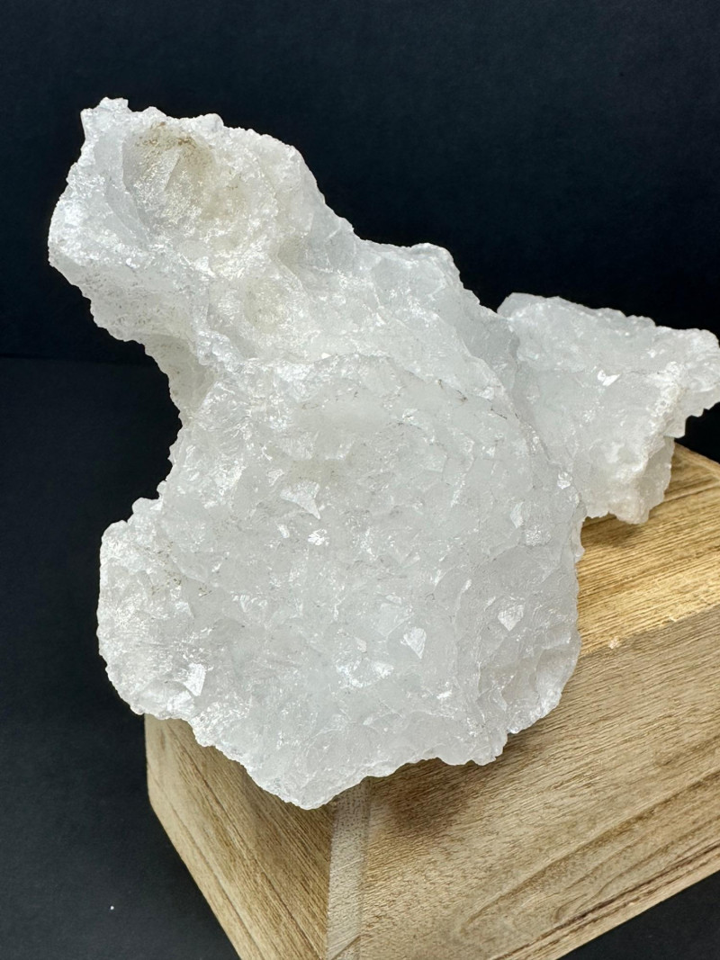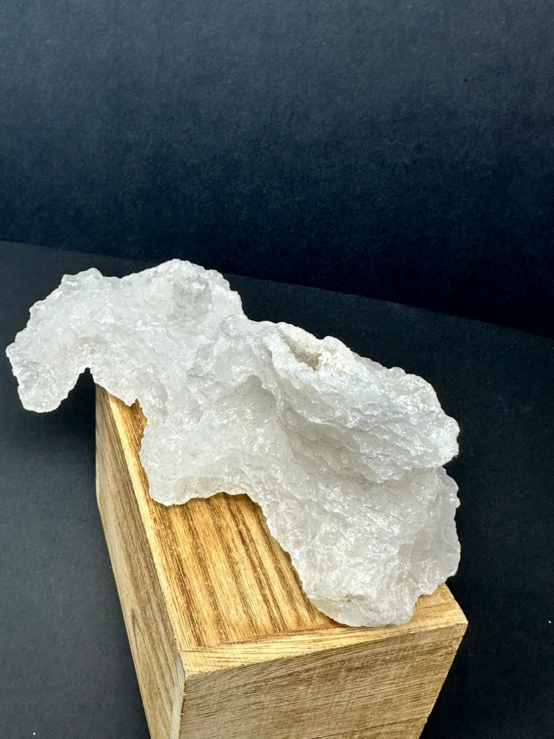 A large, irregularly shaped specimen of white quartz, featuring a rugged crystalline texture with translucent zones and natural fracture lines. The surface glistens subtly under light, hinting at the mineral’s silicate structure and purity. Disclaimer: