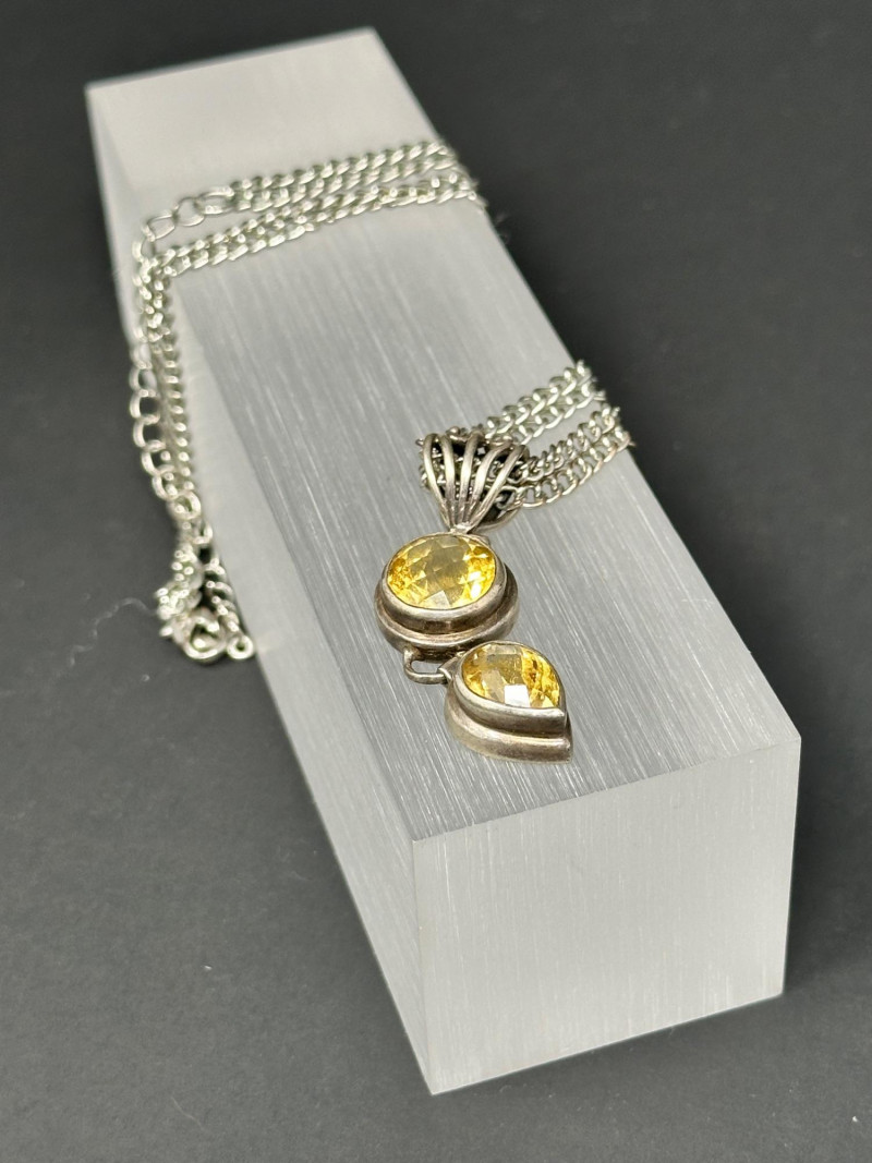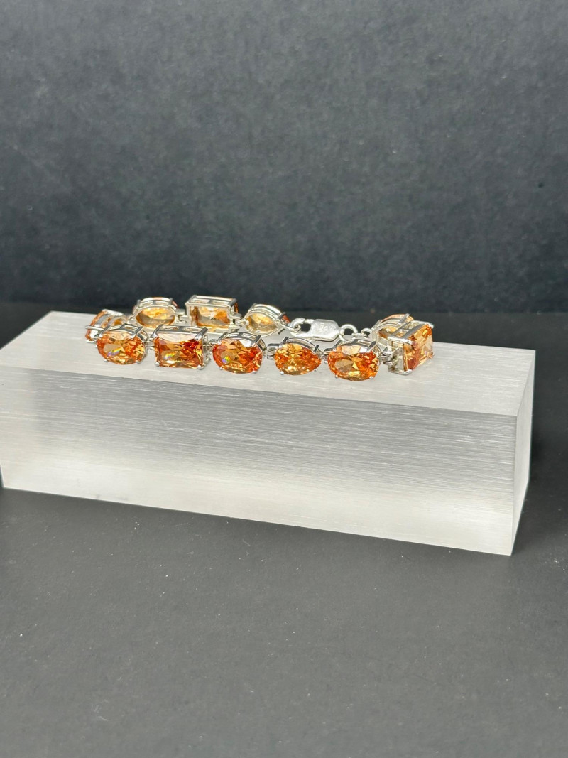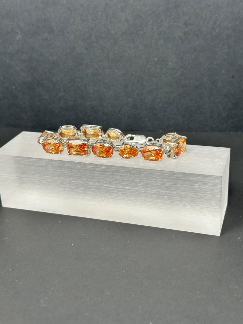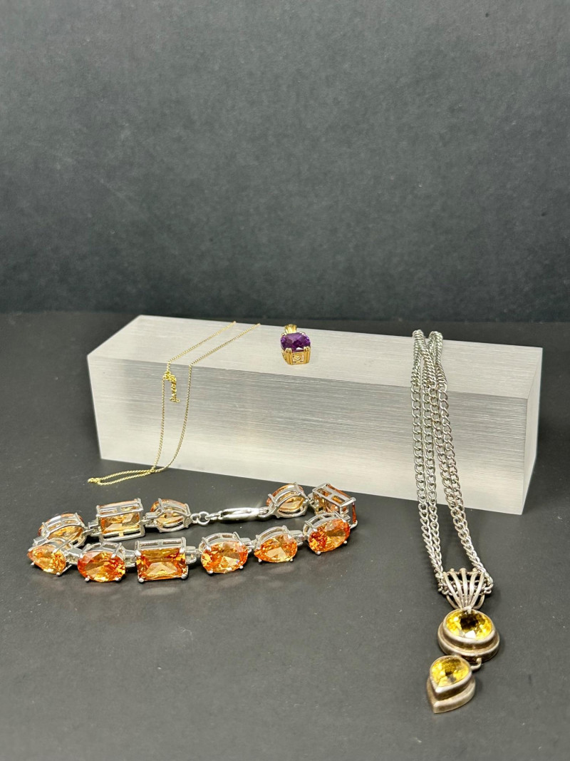 A vibrant four-piece jewelry collection featuring colorful gemstones and mixed metalwork: Sterling Orange Gemstone Bracelet: A bold silver bracelet set with large faceted orange stones in a symmetrical design. Crafted in sterling silver for lasting brilliance. Sterling Purple & Gold Pendant: A rich purple gemstone set in a gold-toned sterling bezel, offering warm contrast and elegant detail. Chain with this pendant was not marked. Sterling Gold Necklace with Pendant: A delicate gold-toned sterling necklace with a small coordinating pendant, ideal for layering or everyday wear.