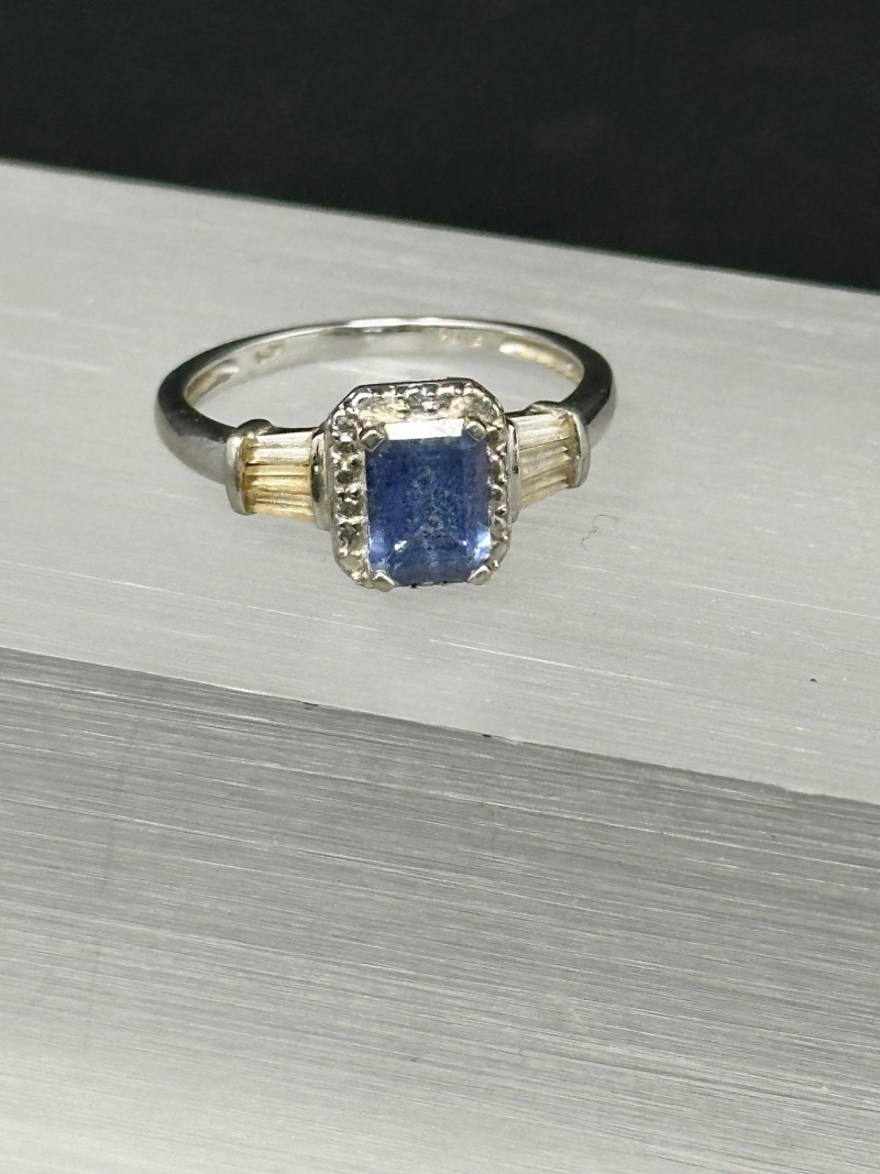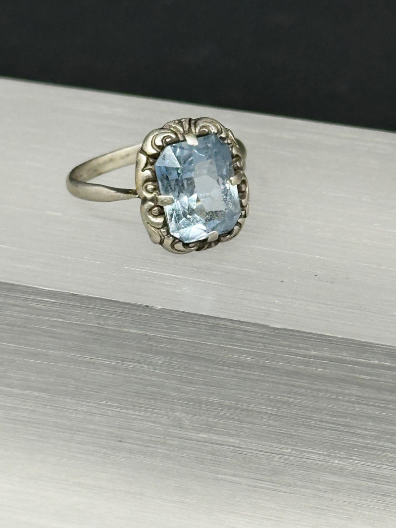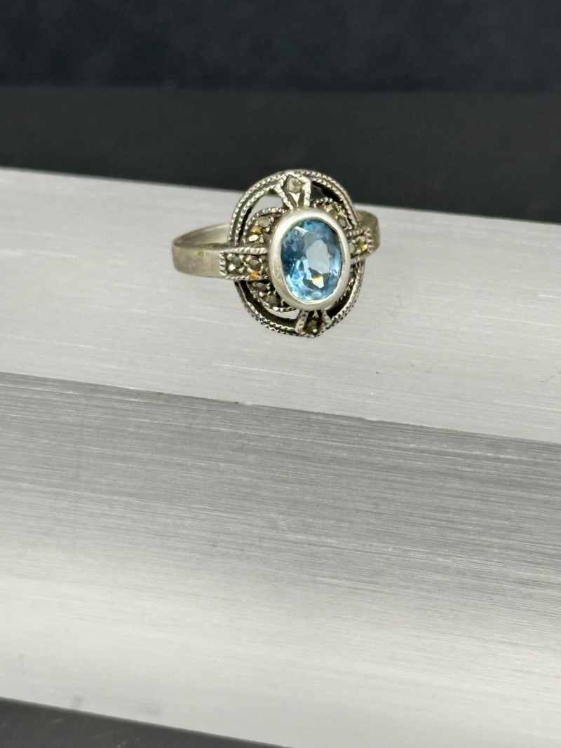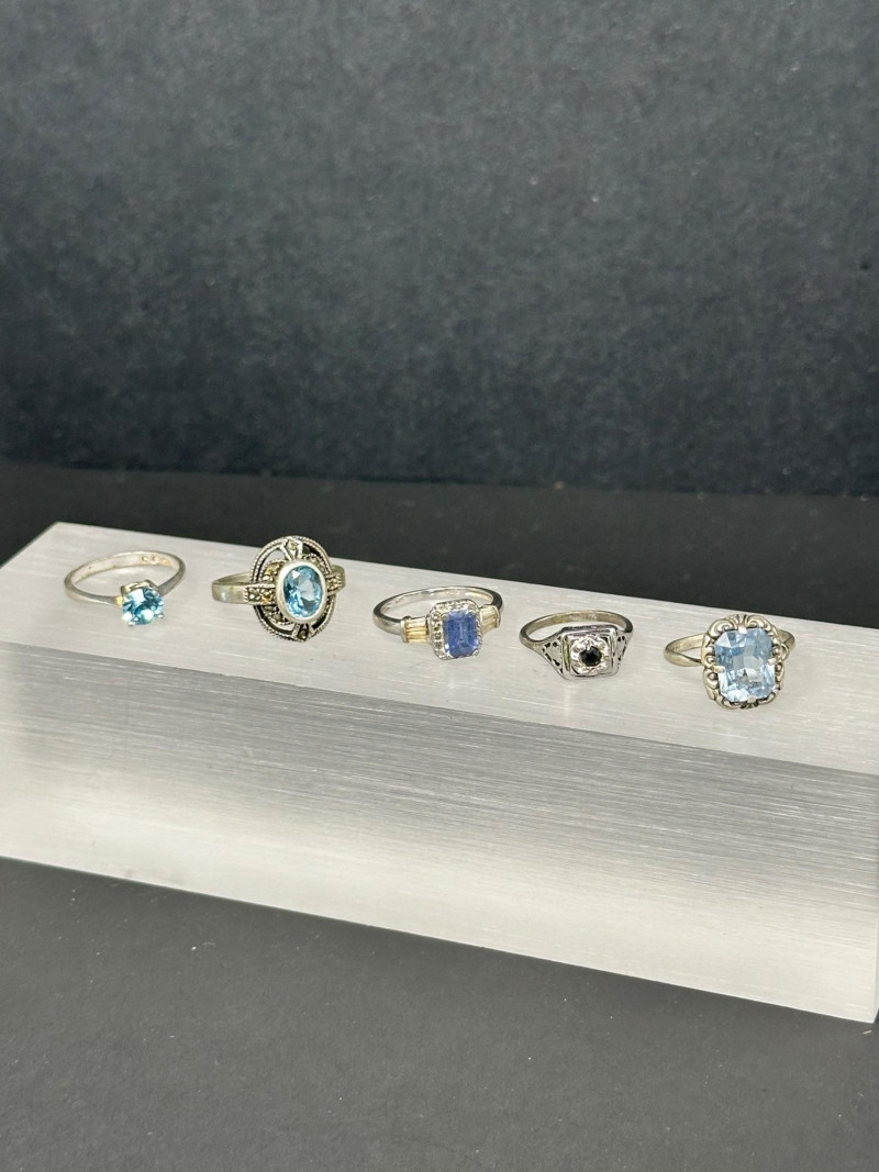 A curated set of five sterling silver rings featuring blue and dark-toned gemstones in varied cuts and settings: Round Light Blue Ring: A petite sterling band set with a soft, round light blue gemstone — subtle and versatile. Size 7 Ornate Oval Blue Ring: A richly colored oval-cut blue stone set in an intricate vintage-style sterling setting. Size 8 Rectangular Blue Ring with Accents: A faceted rectangular blue gemstone flanked by small clear stones, offering a classic, balanced look. size 7 Dark Stone Square Ring: A minimalist sterling ring with a small, dark-toned central stone in a square bezel setting. Size 4 Large Rectangular Light Blue Ring: A bold rectangular-cut light blue gemstone in a decorative sterling frame, perfect for statement wear. Size 5