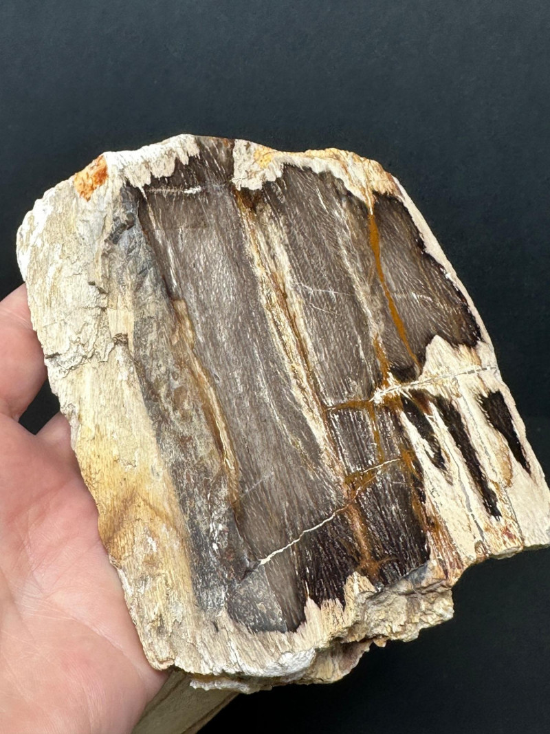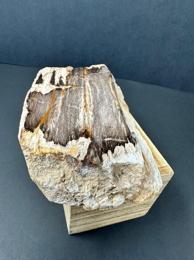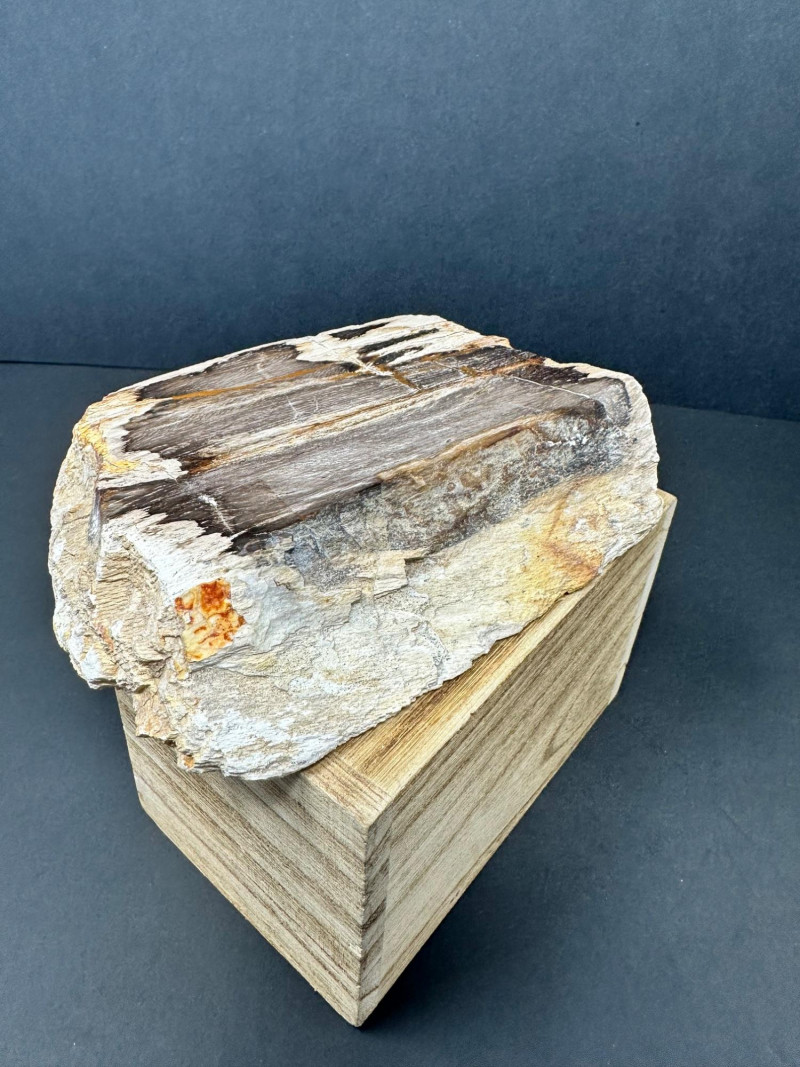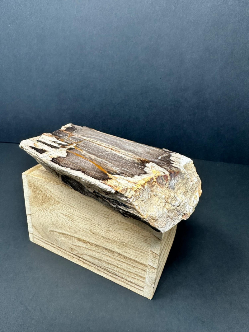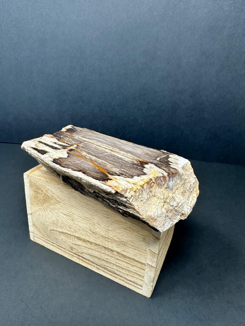 A naturally fossilized fragment of petrified pine, preserving the original wood grain in rich shades of brown, beige, and subtle orange. The surface retains the fibrous texture and growth patterns of ancient coniferous wood, now transformed through mineralization into a stone-like structure. Measures- 5" W x 3" D x 1.25" T Disclaimer: