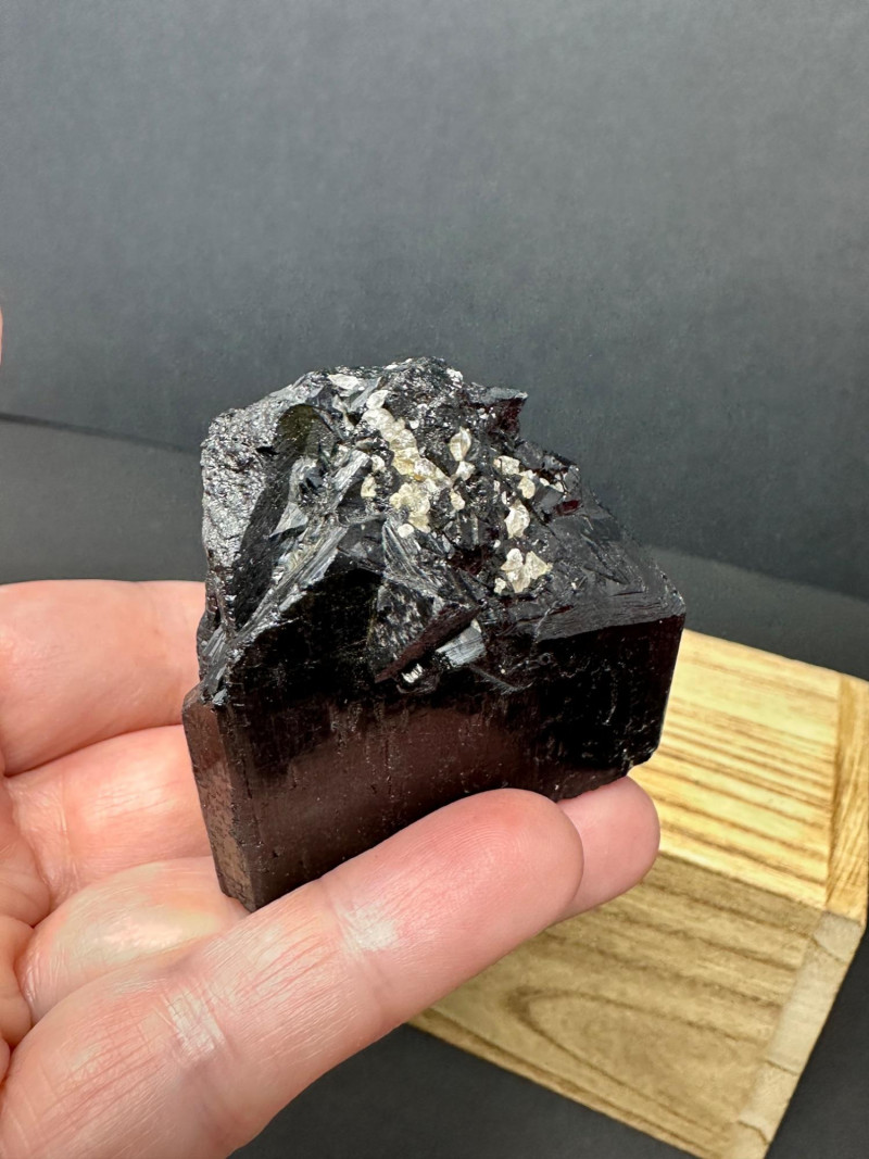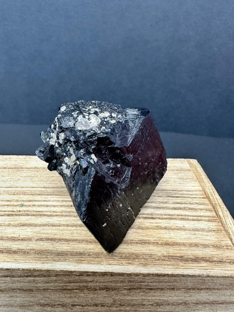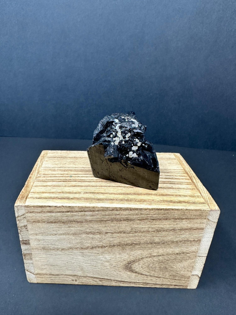 A striking dark mineral specimen with angular crystalline faces and a metallic luster, exhibiting a deep black coloration accented by scattered white inclusions. The sharp geometry and reflective surfaces suggest it may be sphalerite or galena, both known for their dense structure and high visual impact. Measures- 2" x 2" Disclaimer: