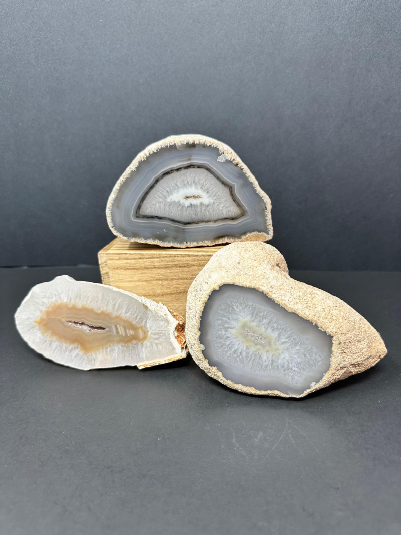 A visually engaging set of three polished geode halves, each revealing intricate internal crystal formations and concentric banding in muted tones of gray, white, and beige. The interiors sparkle with microcrystalline quartz, while the outer surfaces retain the natural curvature of the original geode. Two measure 5" W x 3.5" Tall Disclaimer: