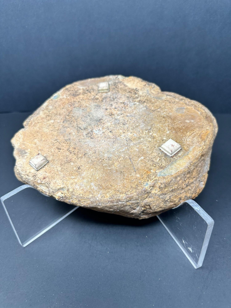 A polished slice of agate revealing intricate concentric and wavy banding in earthy tones of brown, orange, gray, and white. The fine-grained structure and translucent zones highlight agate’s layered formation through silica deposition in volcanic cavities. Measures- 8" W x 6.5" x 1.5" D Disclaimer: