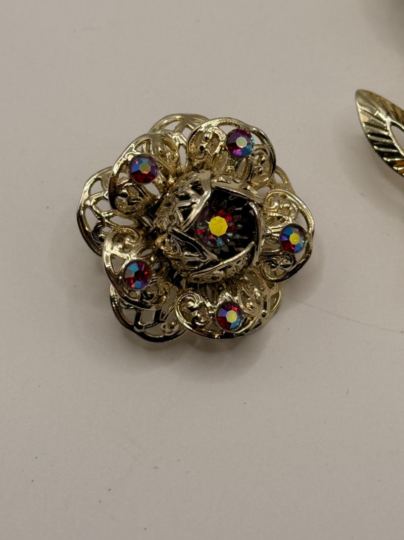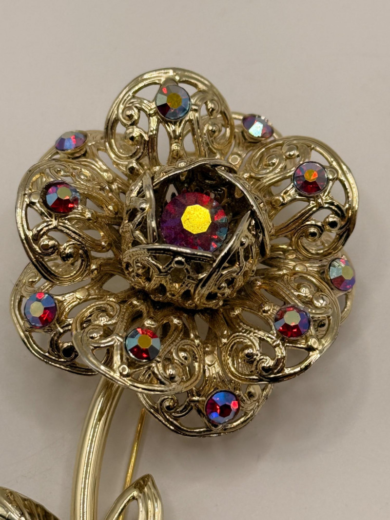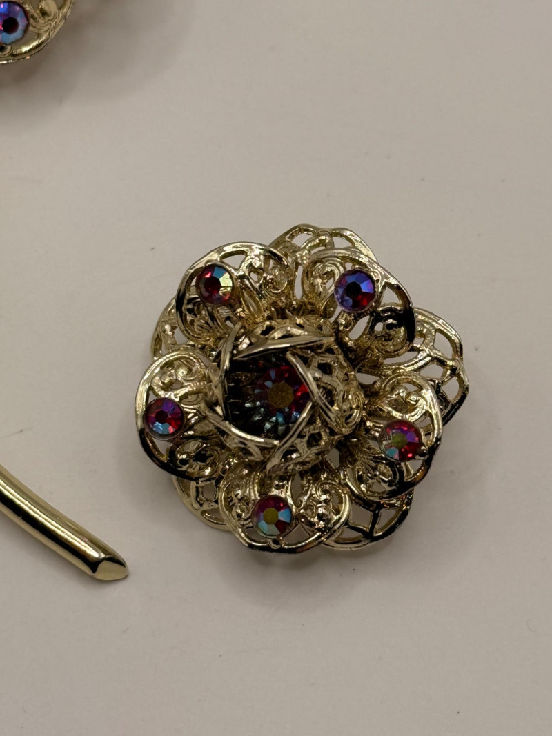 Brooch Shaped like a stylized flower Long gold‑tone stem and leaves Large purple center stone Surrounding halo of colorful rhinestones Earrings Miniature versions of the brooch’s flower head Clip‑on backs (typical for the era) Same purple center + multicolor rhinestone halo The matching design makes it a true “parure” (a coordinated jewelry set). Sarah Coventry pieces are beloved for their vintage charm and recognizable style The brand is tied to mid‑century American fashion culture Sets in good condition are more desirable than single pieces The colorful rhinestone palette gives it a cheerful, retro lookDesign Details