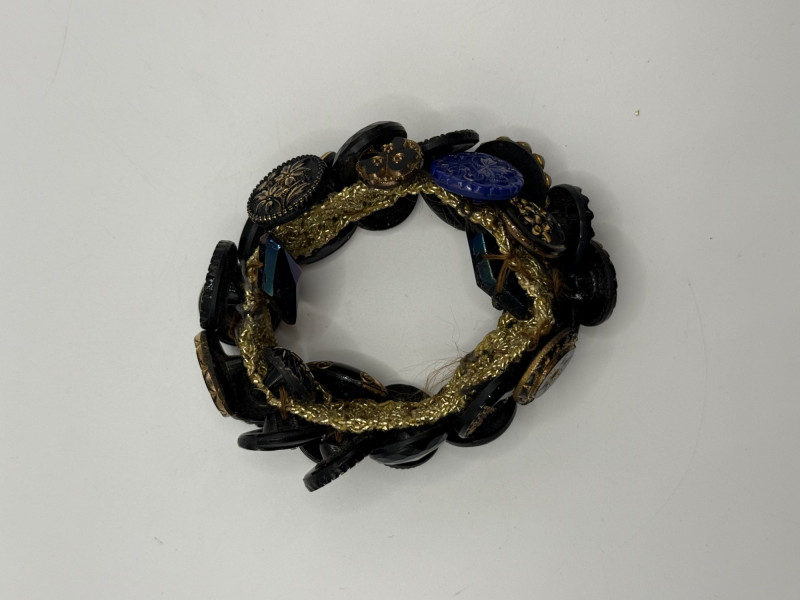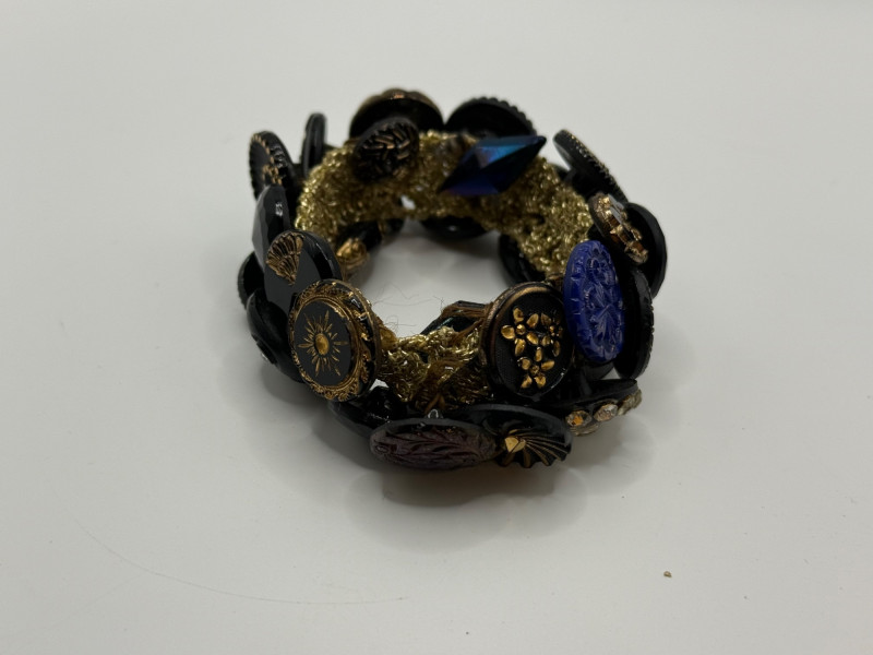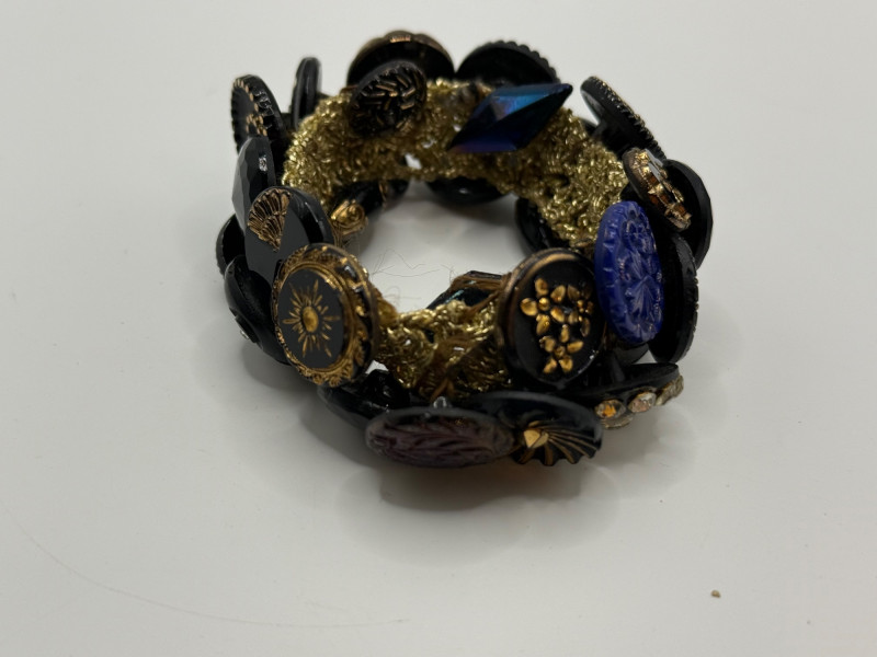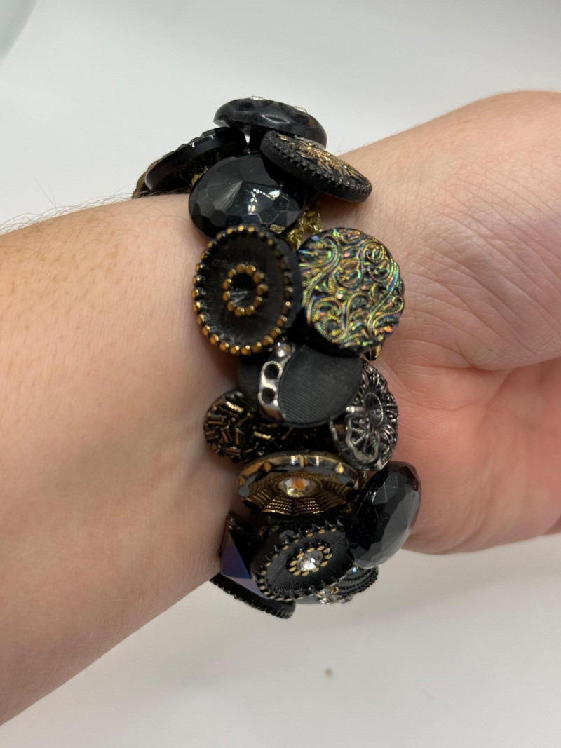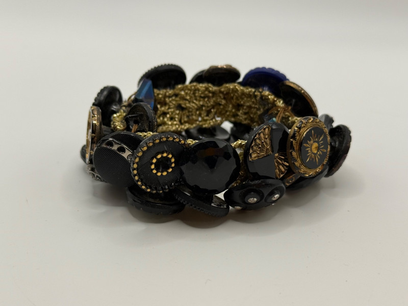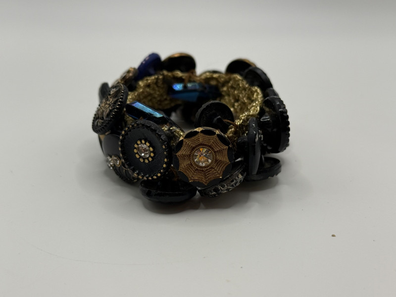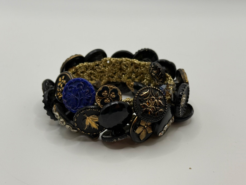 Czech (formerly Bohemian) glassmakers have been producing decorative buttons since the 19th century. They’re known for: Pressed‑glass molds with incredibly fine detail Metallic finishes like gold wash, aurora borealis, and iridescent coatings Hand‑painted accents on some pieces Unique shapes and textures that aren’t replicated in modern mass production The buttons on your bracelet show several of these traits—especially the ornate black‑and‑gold designs and the standout blue floral button, which is very typical of mid‑20th‑century Czech production. The gold woven or crocheted band gives it a handmade, artisan quality. The mix‑and‑match button selection suggests it was assembled either by a collector or a jewelry maker who curated pieces with complementary colors and textures. These bracelets are often made as one‑of‑a‑kind items because no two assortments of vintage buttons are ever the same. They’re wearable history—each button can be decades old. They showcase craftsmanship that’s hard to find today. They’re expressive, bold, and full of personality. Collectors enjoy the hunt for unusual molds, colors, and finishes.What Makes Czech Glass Buttons Special
