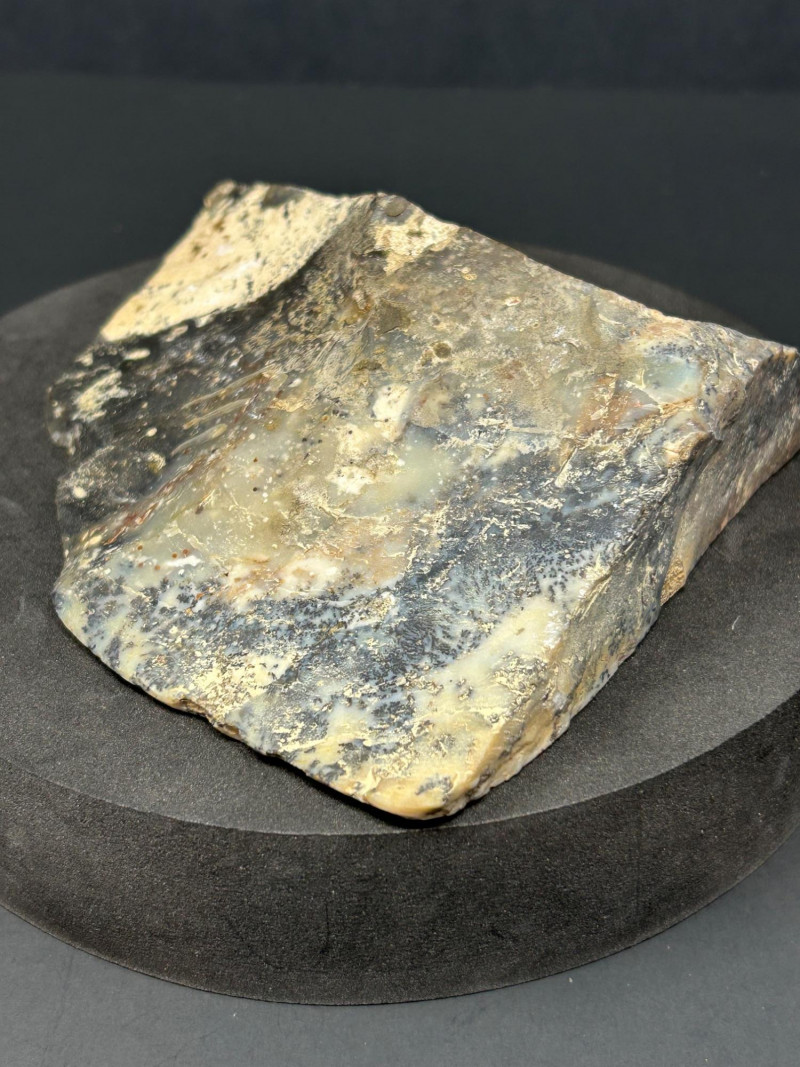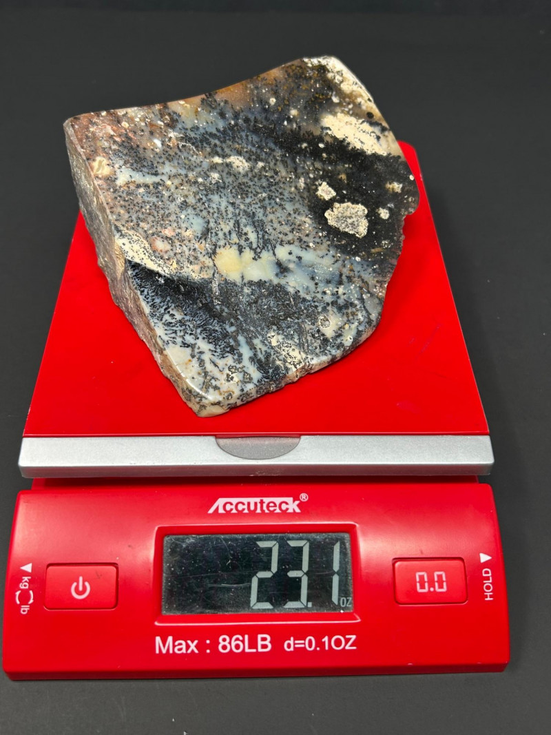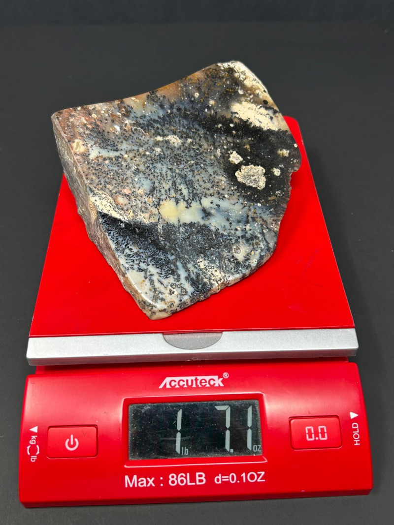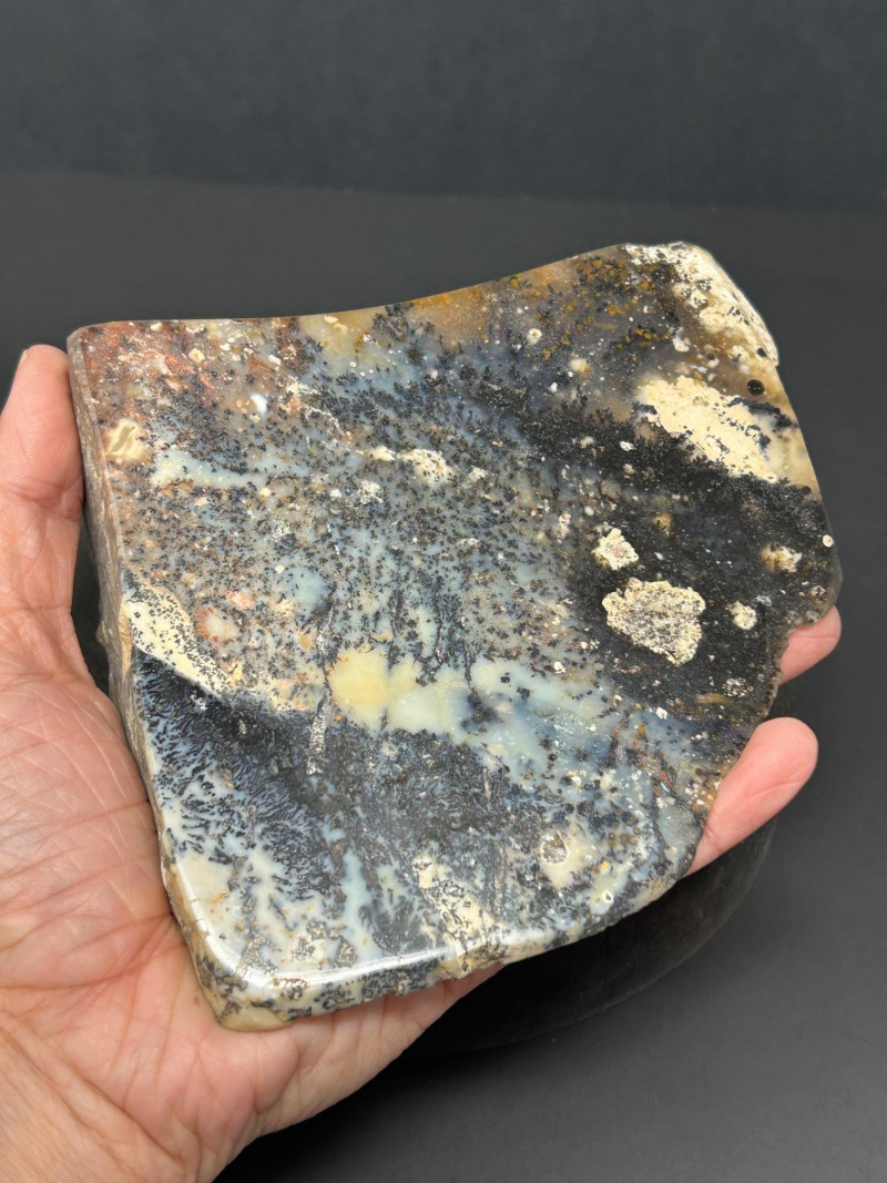 Description: Polished jasper slab featuring dramatic swirls and banding in black, cream, white, and subtle blue-gray tones. The surface is smooth and glossy, revealing intricate natural patterns and mineral zoning. 654 grams Size- 5" W x 3.5" Disclaimer: