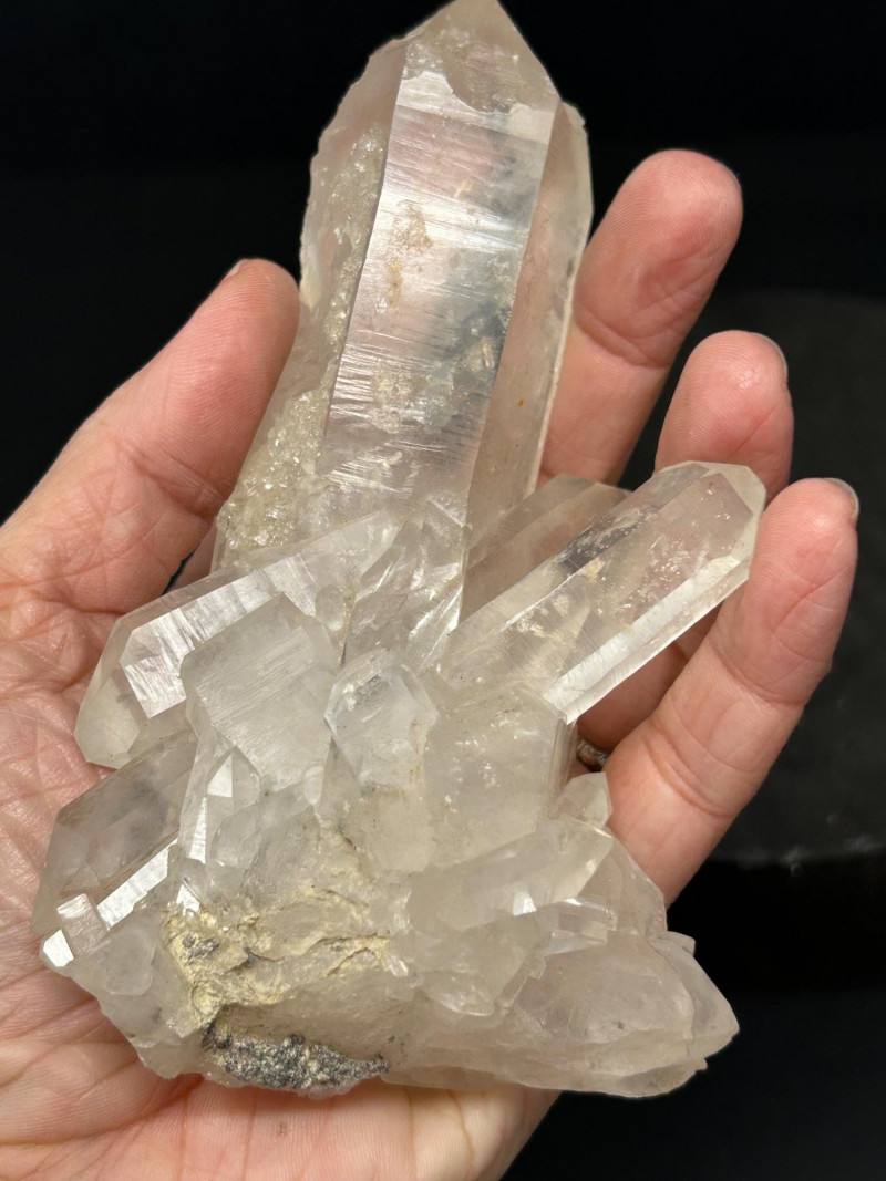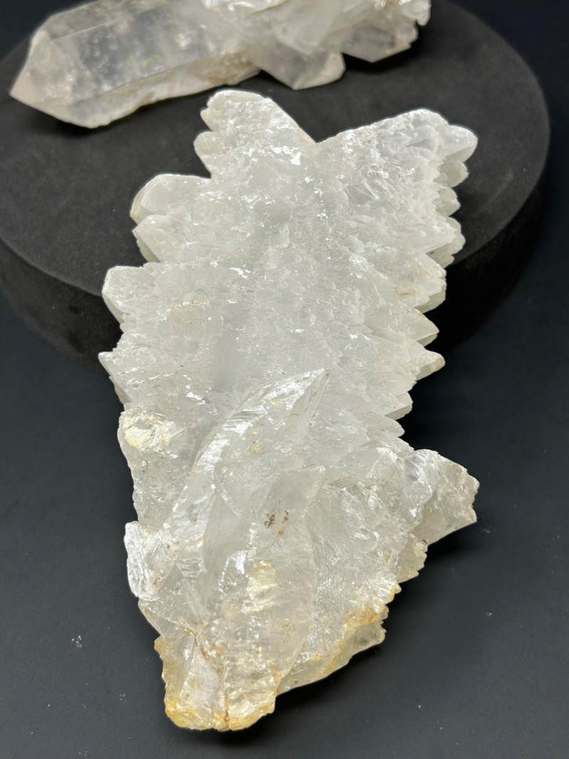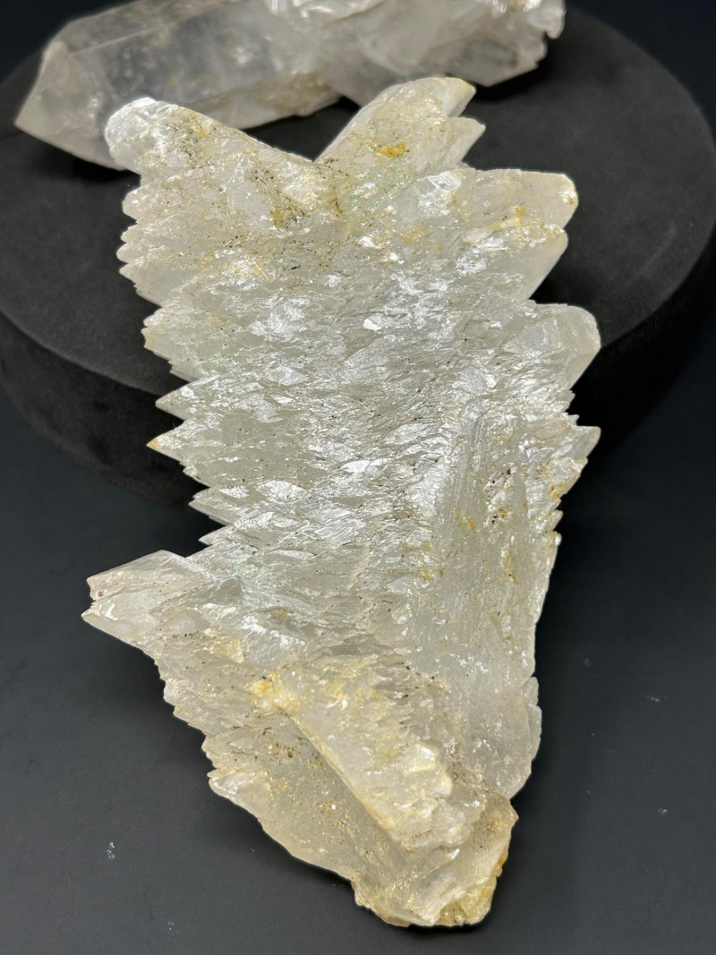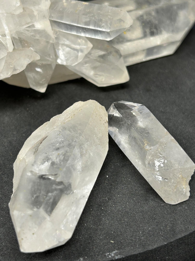 These are the prismatic, glassy crystals — the ones with sharp points and good clarity. Transparent to milky Six‑sided prism shape Hard, glassy luster Often grows in clusters A large, elongated quartz point with a slight yellow tint at the base Smaller individual points A compact quartz cluster with intergrown crystals Quartz forms in cavities where silica‑rich water cools slowly, letting the crystals grow into those classic shapes. Selenite is a form of gypsum — soft, silky, and often forming in blade‑like crystals.