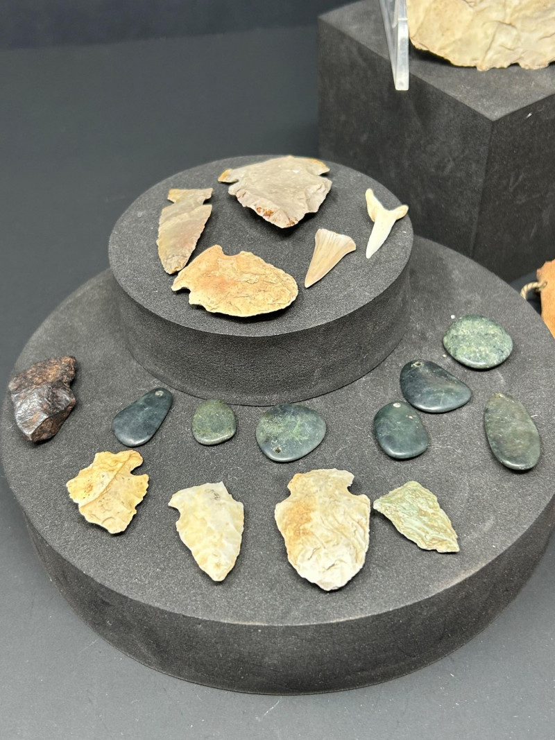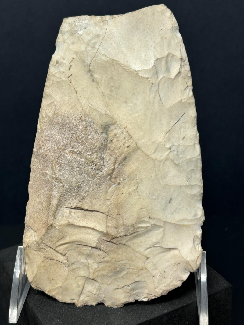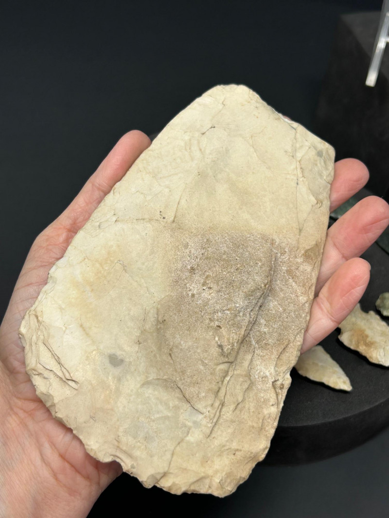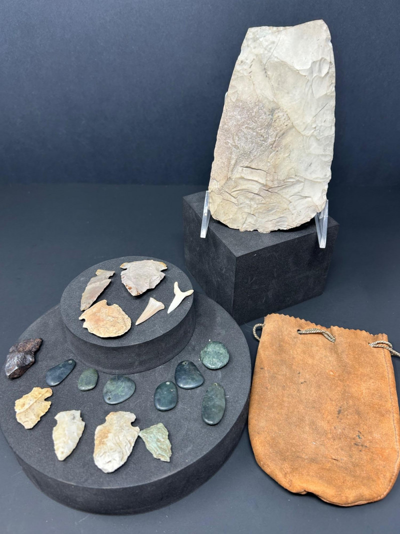 It’s not an artifact itself but part of the auction grouping. It shows multiple toolmaking techniques: flaking, grinding, polishing. It includes both functional tools and possibly symbolic pieces. It reflects the resourcefulness and craftsmanship of Indigenous cultures across North America. The mix suggests it was assembled as a collector’s group rather than found together archaeologically.1. The Large Upright Blade / Axe Head