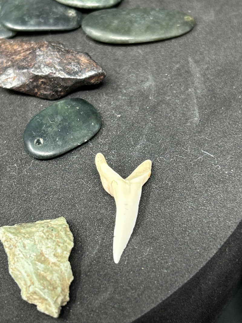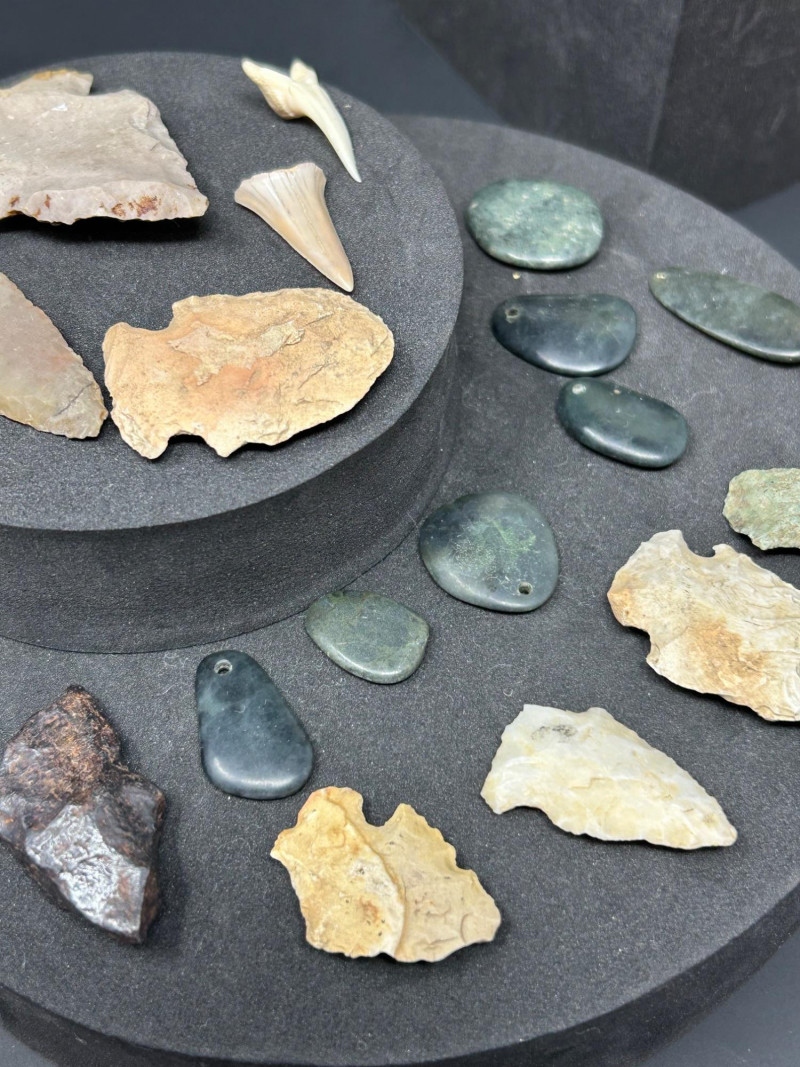 Different shapes often indicate different time periods or hunting styles. These are ground and polished tools or pendants, often made from jadeite, nephrite, serpentine, or other tough green stones. Possible uses Celts (small axes) Adzes Pendants or amulets Ceremonial objects The polish suggests they were valued items, not just utilitarian tools. These could be: Scrapers Knives Cutting flakes Drills They were used for hide processing, carving, and everyday tasks. This is likely a modern addition to the lot — a storage pouch included with the tools.