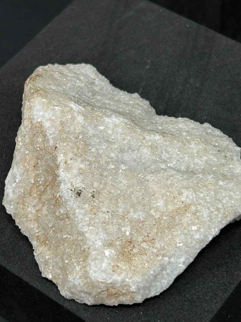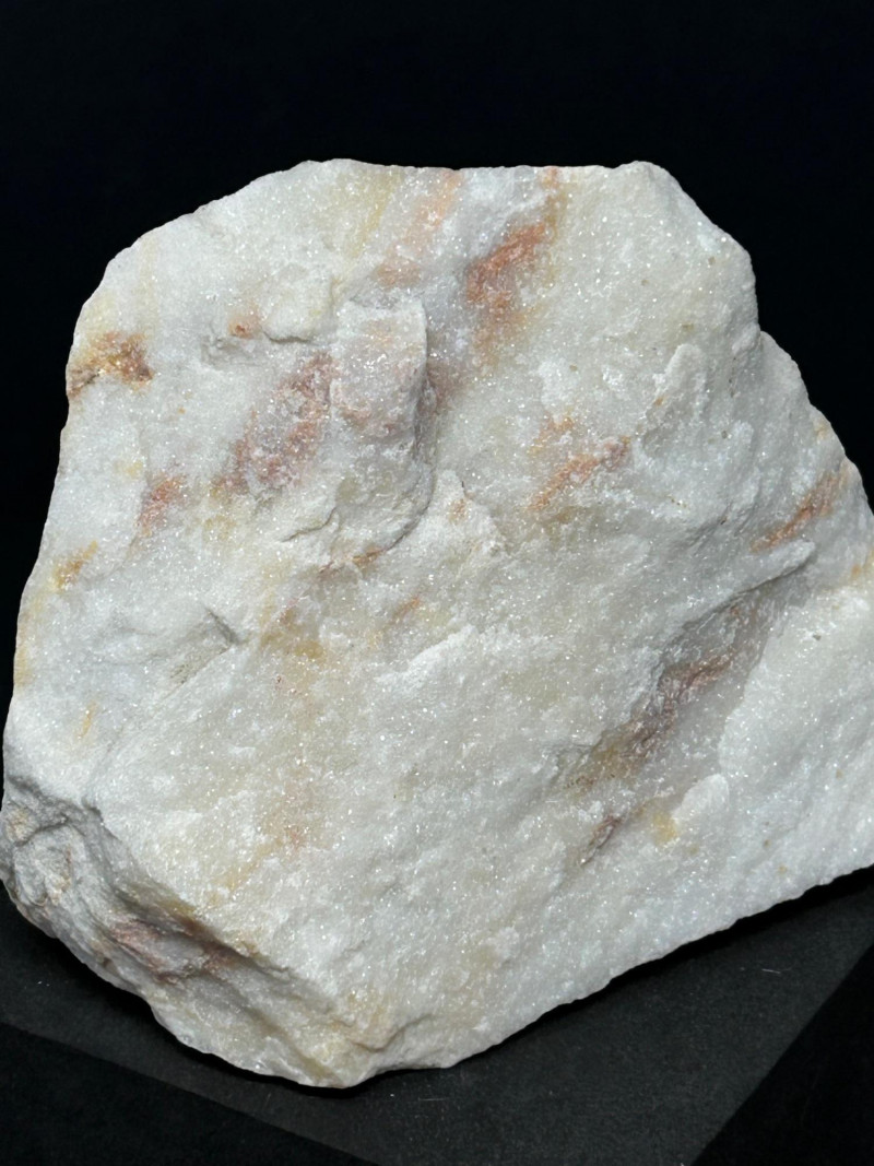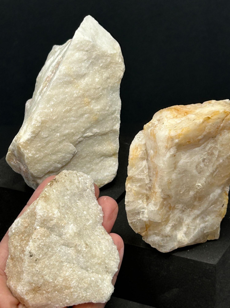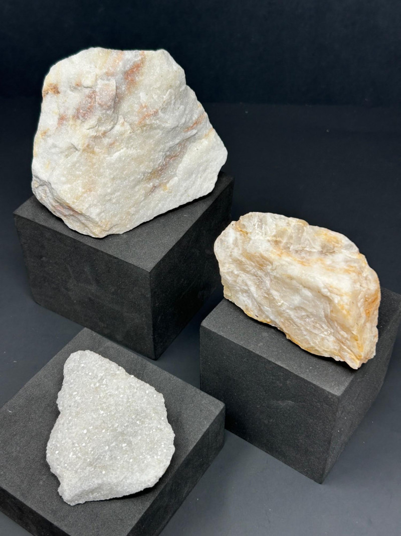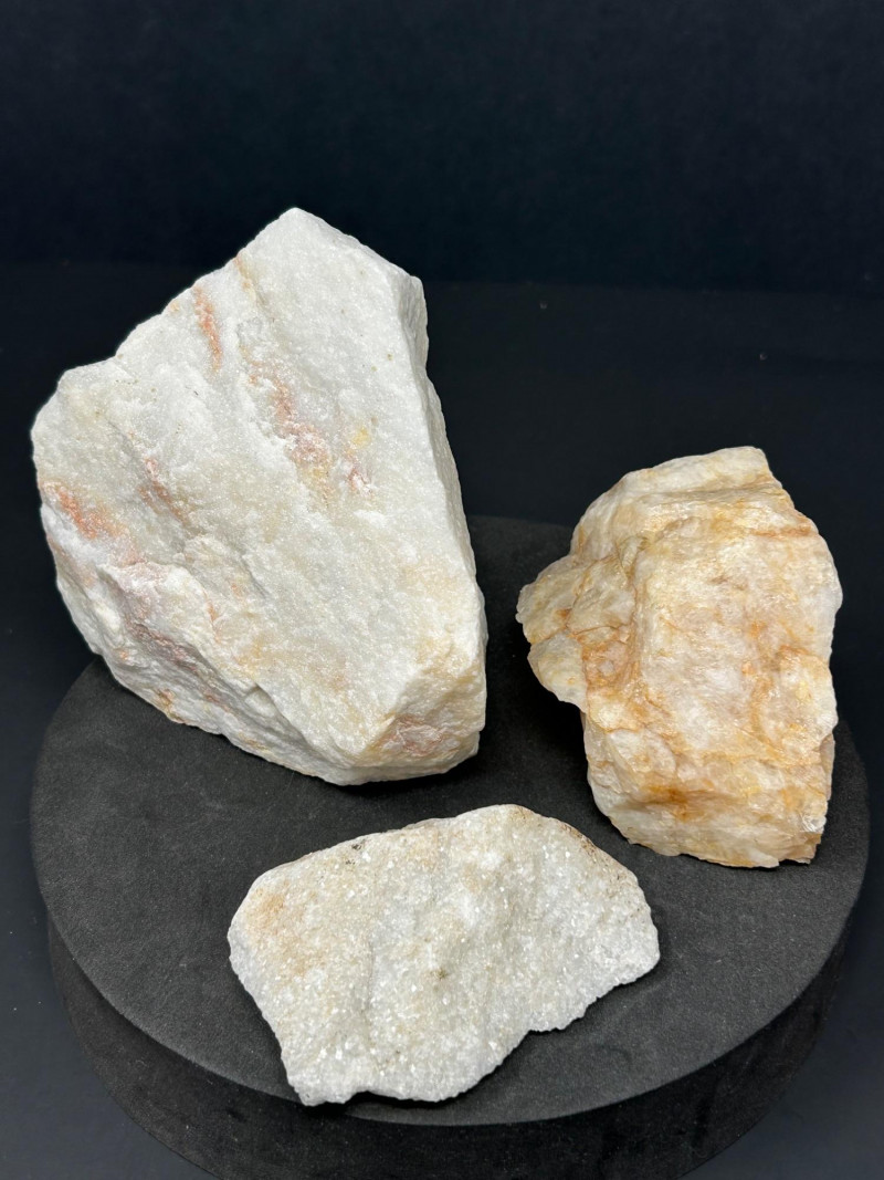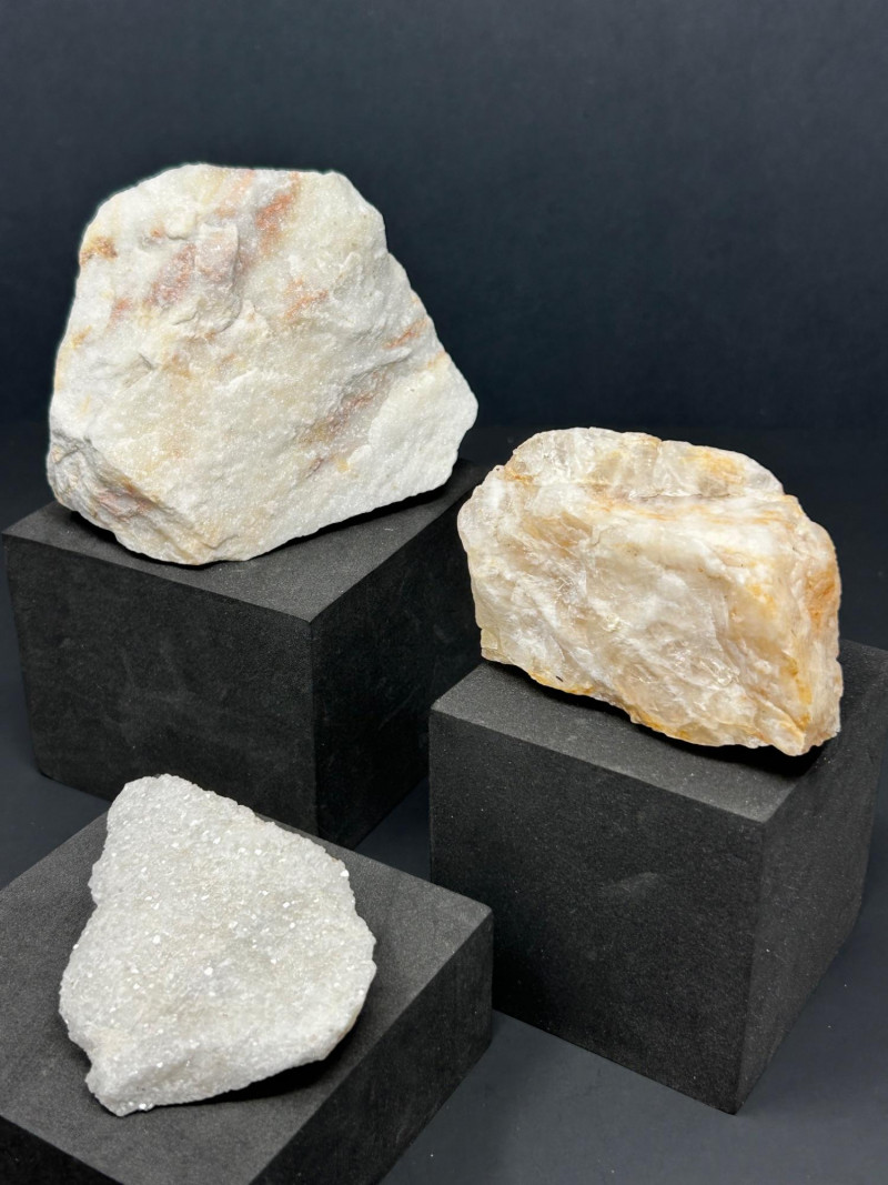 A three‑piece grouping of marble and quartz specimens, each with distinct texture and coloration: Marble specimen with warm beige and reddish streaking, showing classic metamorphic banding. Cream‑toned marble piece with a compact, fine‑grained structure. Sparkling quartz‑rich specimen with granular crystalline texture and light reflective surfaces. Disclaimer: