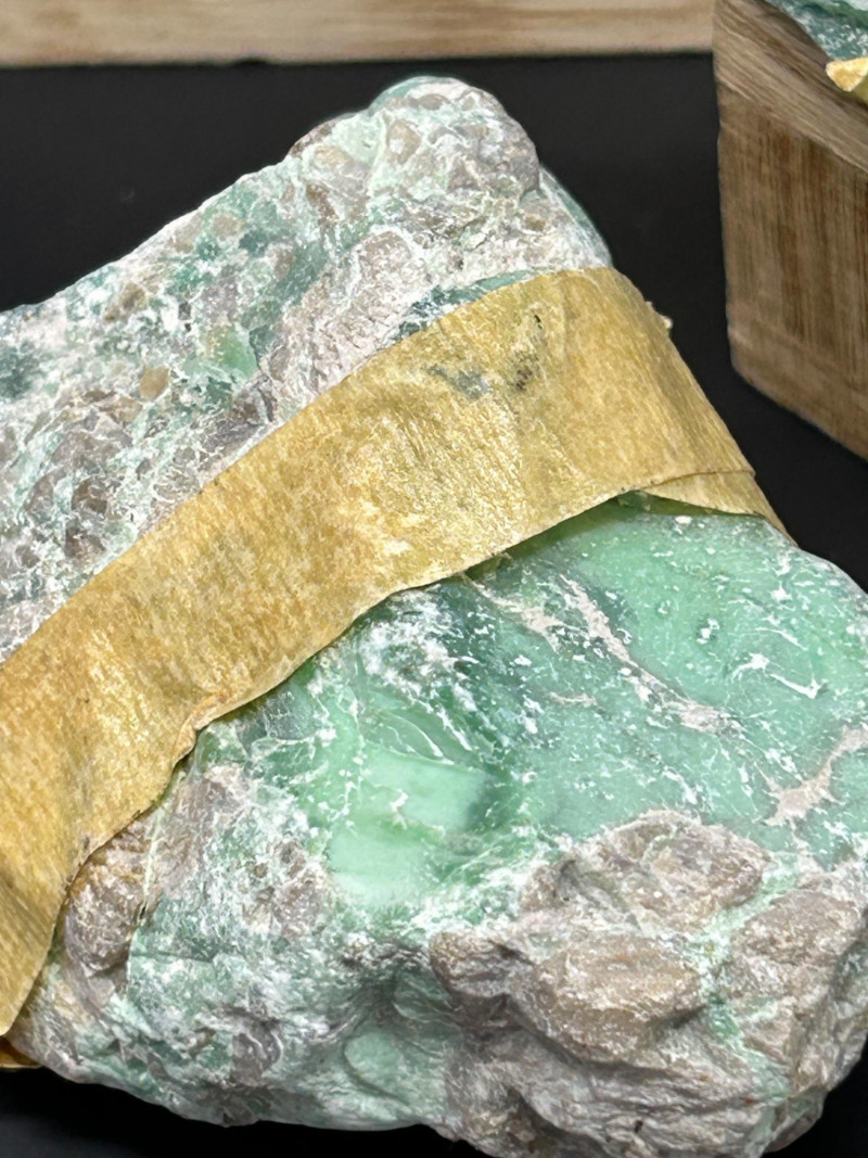 Traits: Bright turquoise‑green color White streaks or grid‑like patterns Slightly pearly sheen