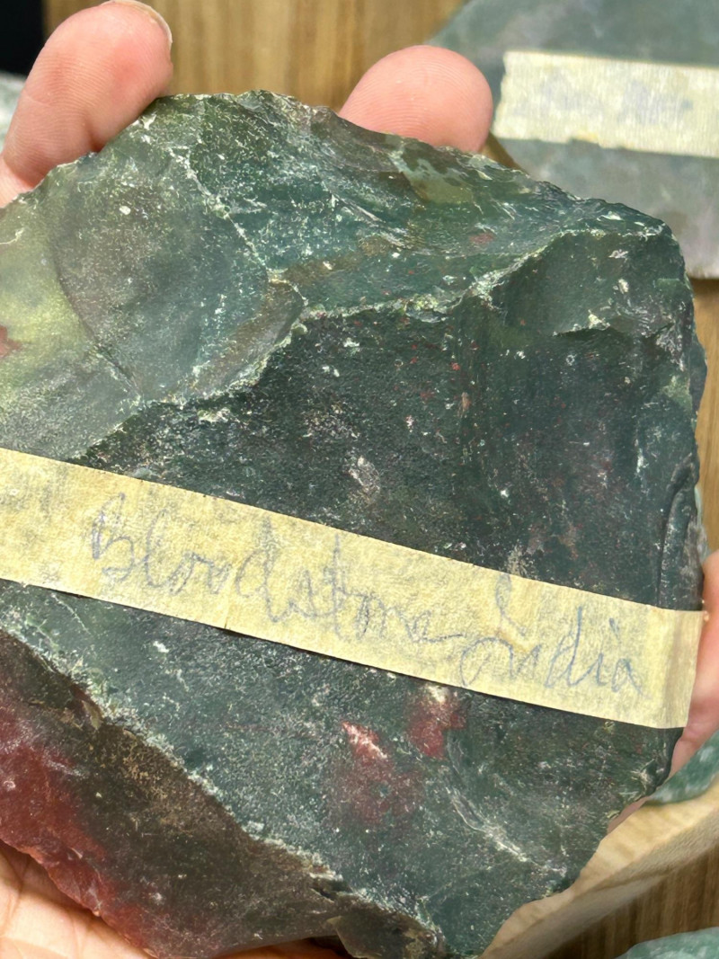 Forms in silica‑rich environments where small plate‑like inclusions get trapped during quartz growth. Bloodstone is a dark green chalcedony with distinctive red spots caused by iron oxide.